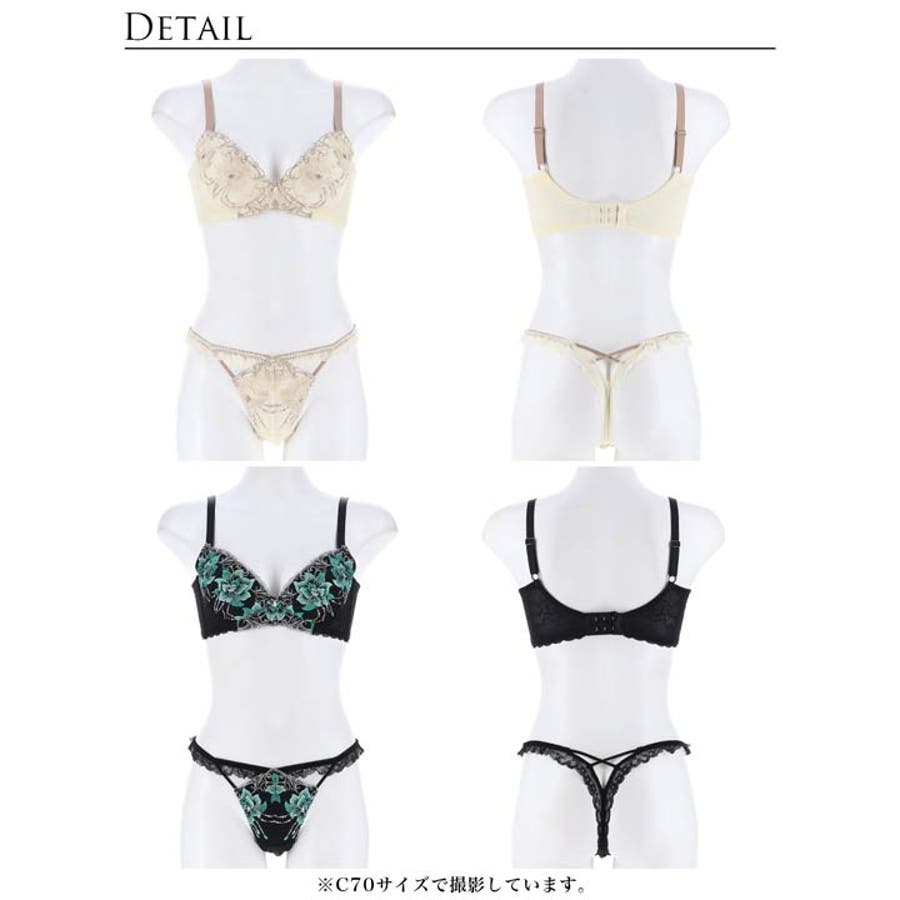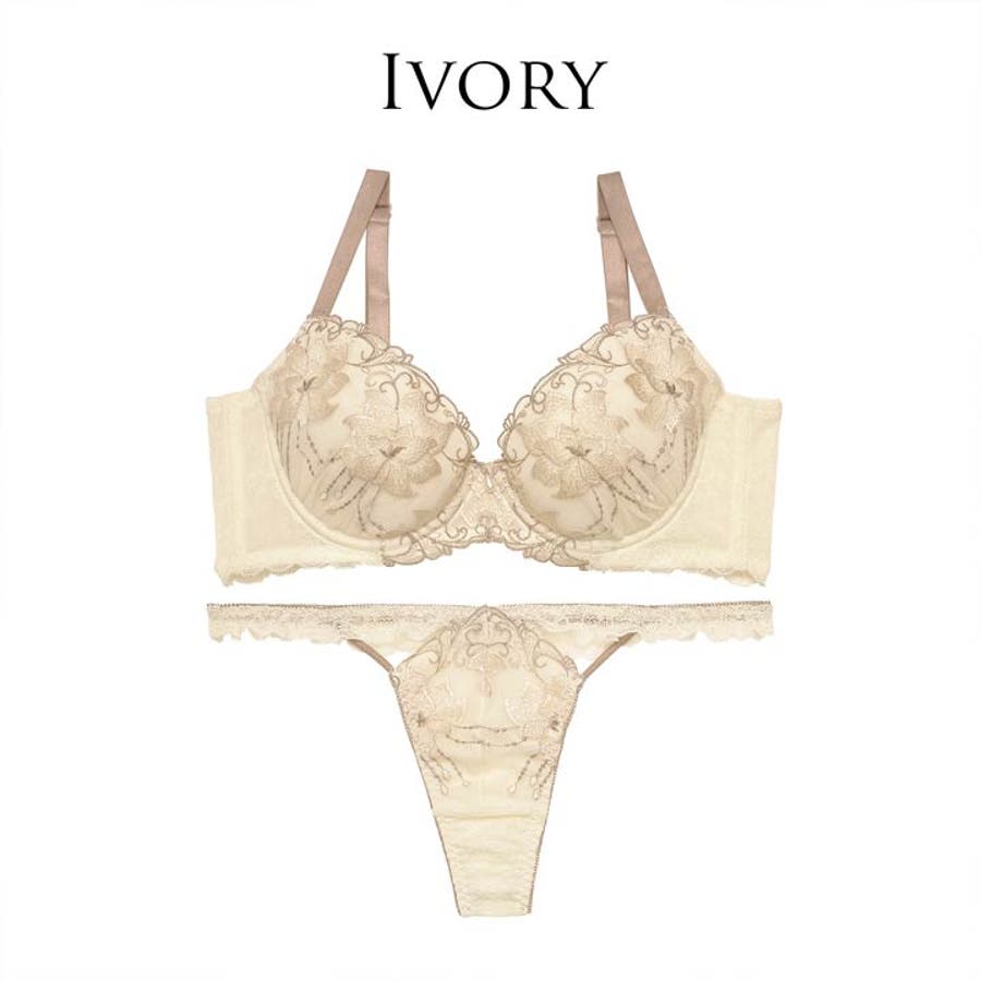 2色使いのグラデーションフラワーに高級感漂うドレープ刺繍を合わせたランジェリー。中心に飾られたドロップパールビジューが上品な印象に。透け感のあるレースにストリングを加え360度色気漂うショーツも魅力的な1着です。