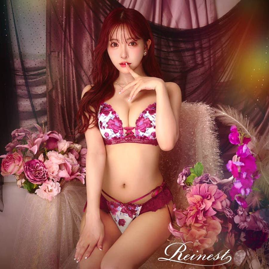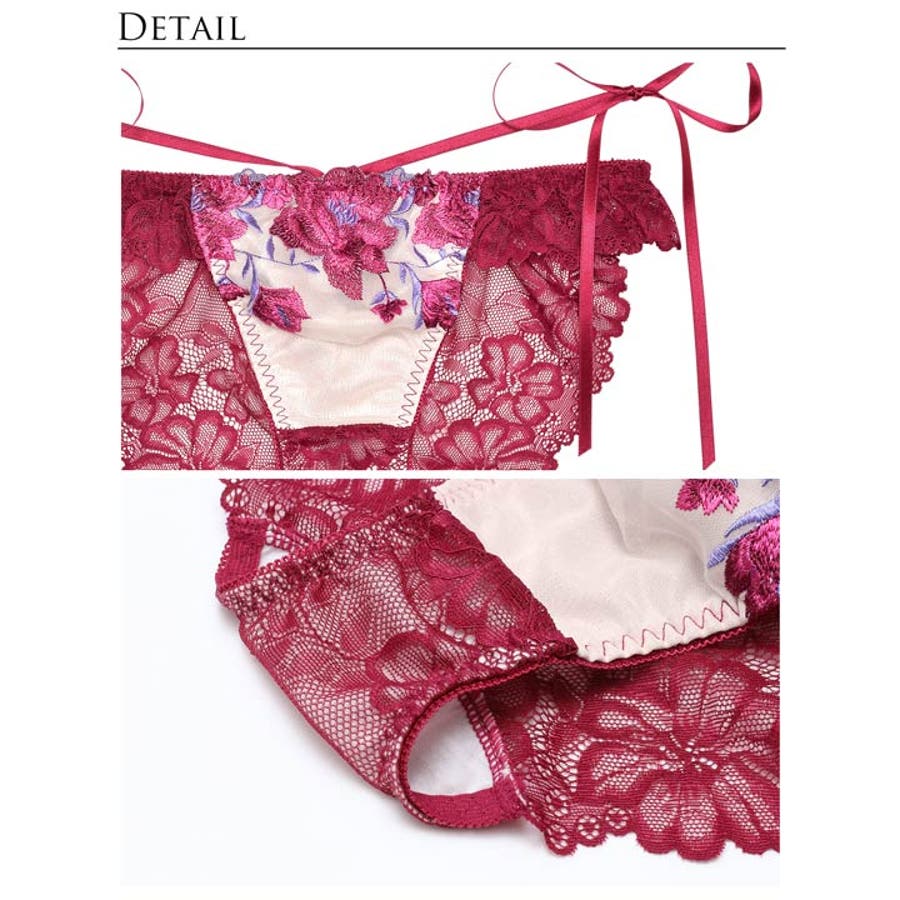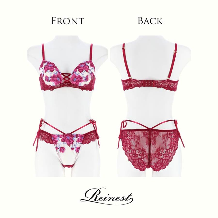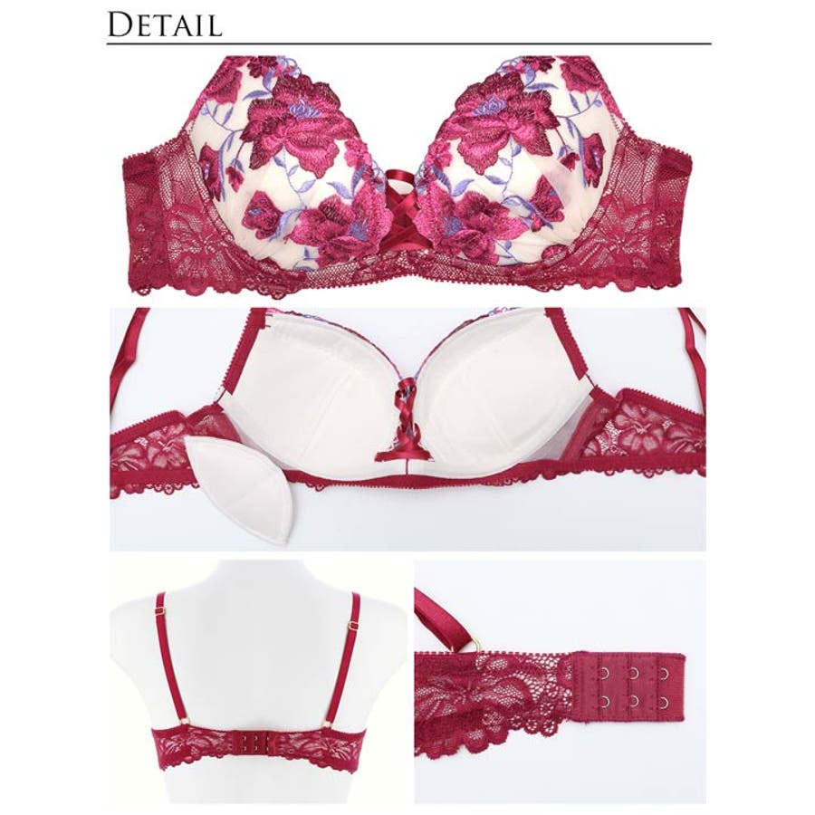 色鮮やかなフラワー刺繍が華やかなランジェリー。谷間魅せカット&レースアップデザインで色気抜群◎ サイドフリルレースの上に重ねた紐リボンコードのWラインが可愛らしさも欠かさない1着です。