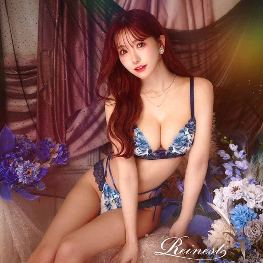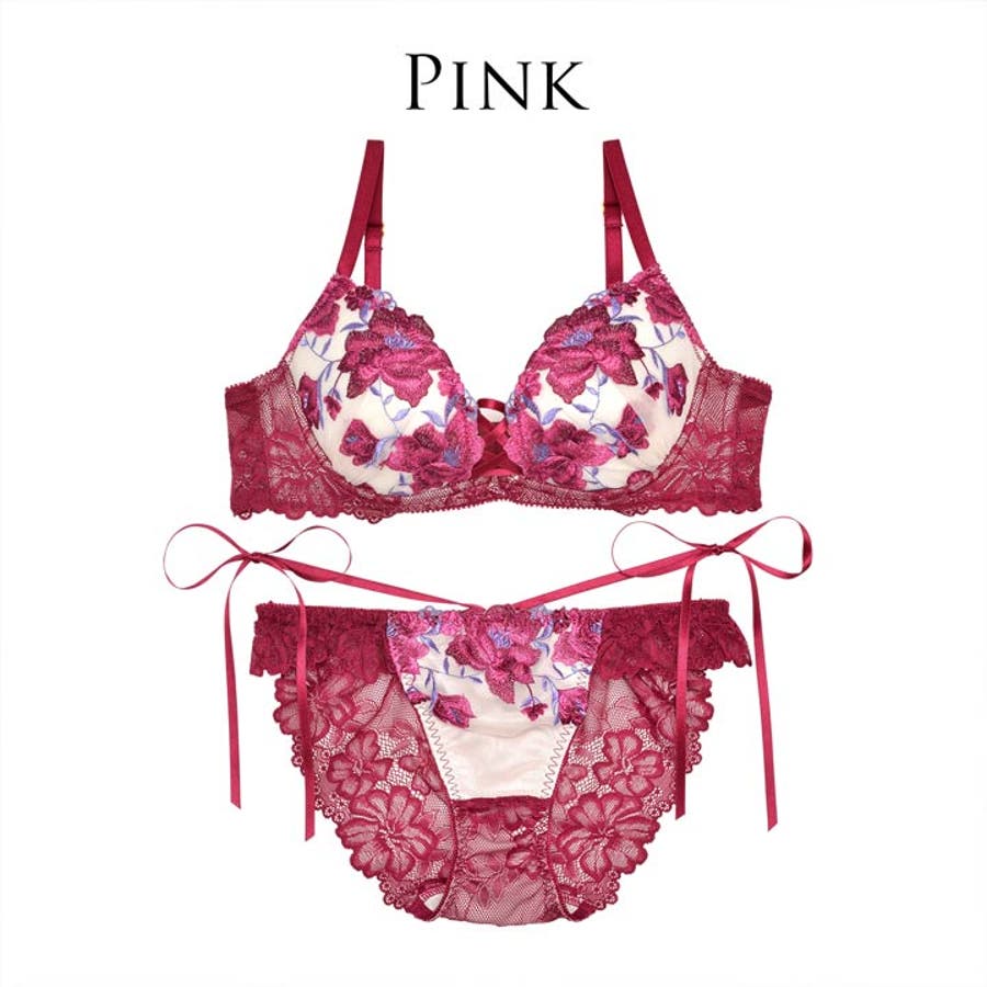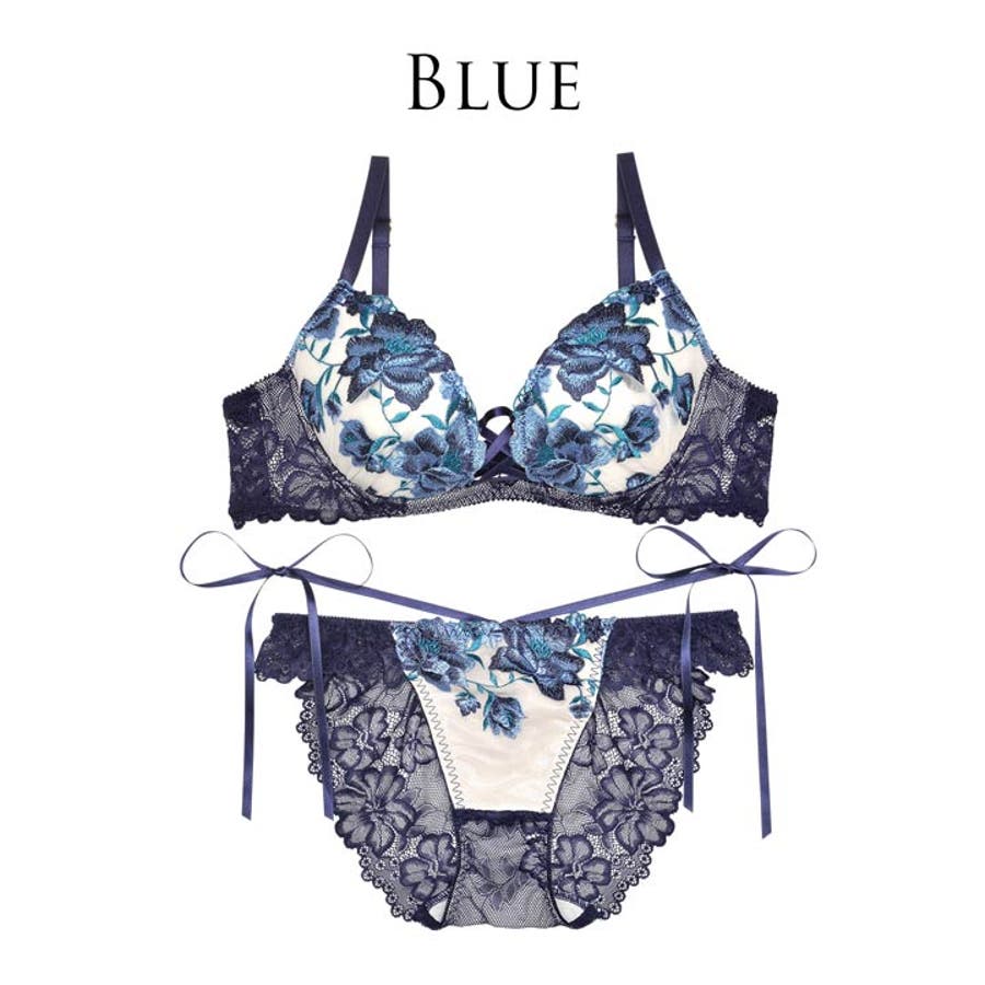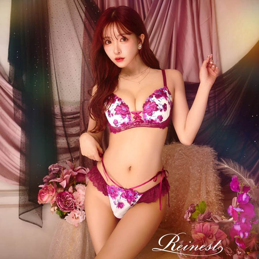 色鮮やかなフラワー刺繍が華やかなランジェリー。谷間魅せカット&レースアップデザインで色気抜群◎ サイドフリルレースの上に重ねた紐リボンコードのWラインが可愛らしさも欠かさない1着です。