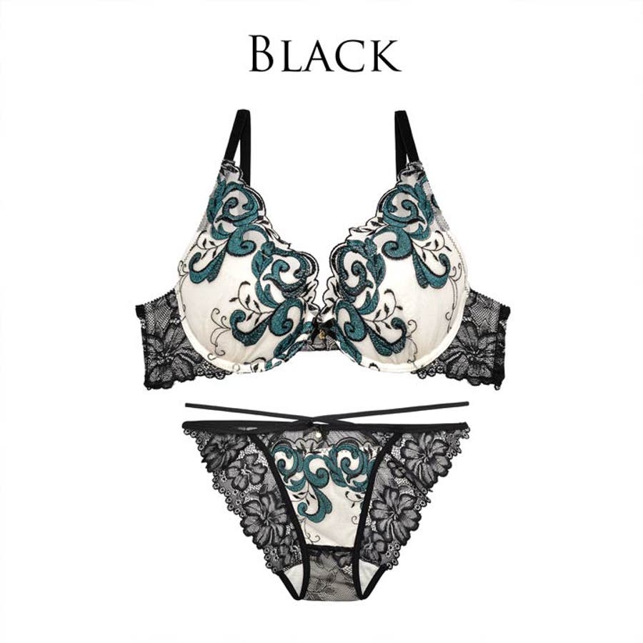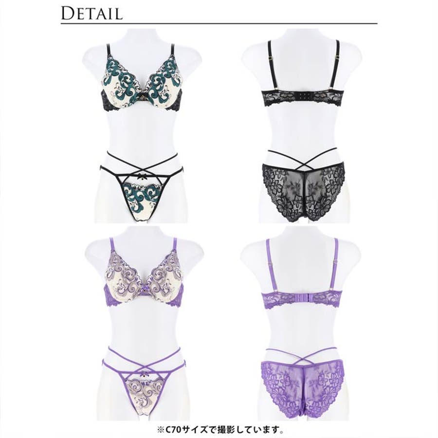 美しい曲線を描く上品なツタ柄の刺繍を施したランジェリー。中央のサテンリボンとゴールドチャームが可愛らしいアクセントに。ショーツフロントの肌見せと交差する華奢なコードデザインがセクシーな一着です。