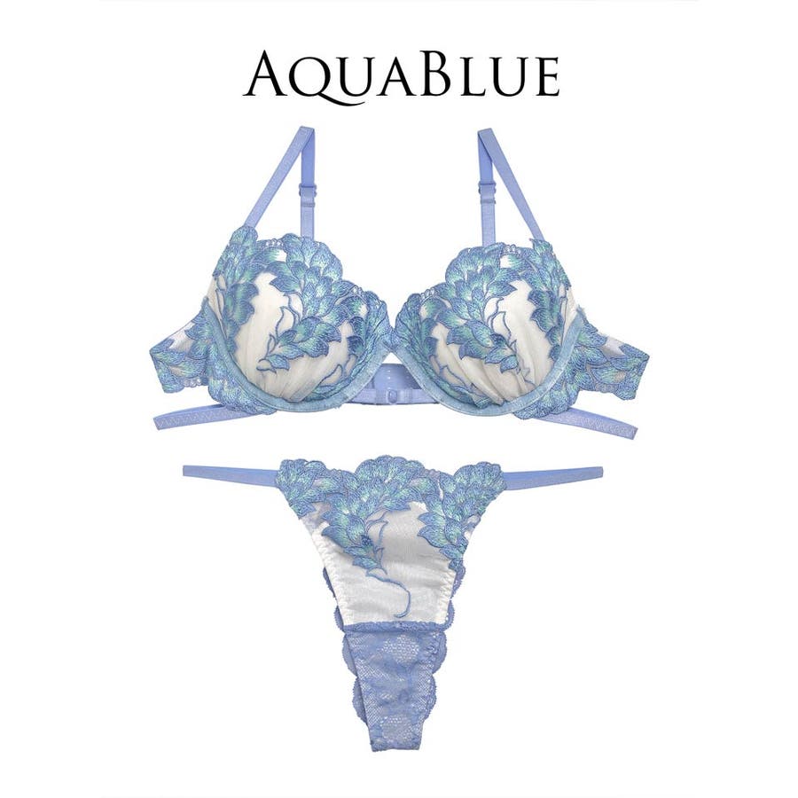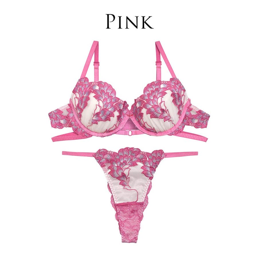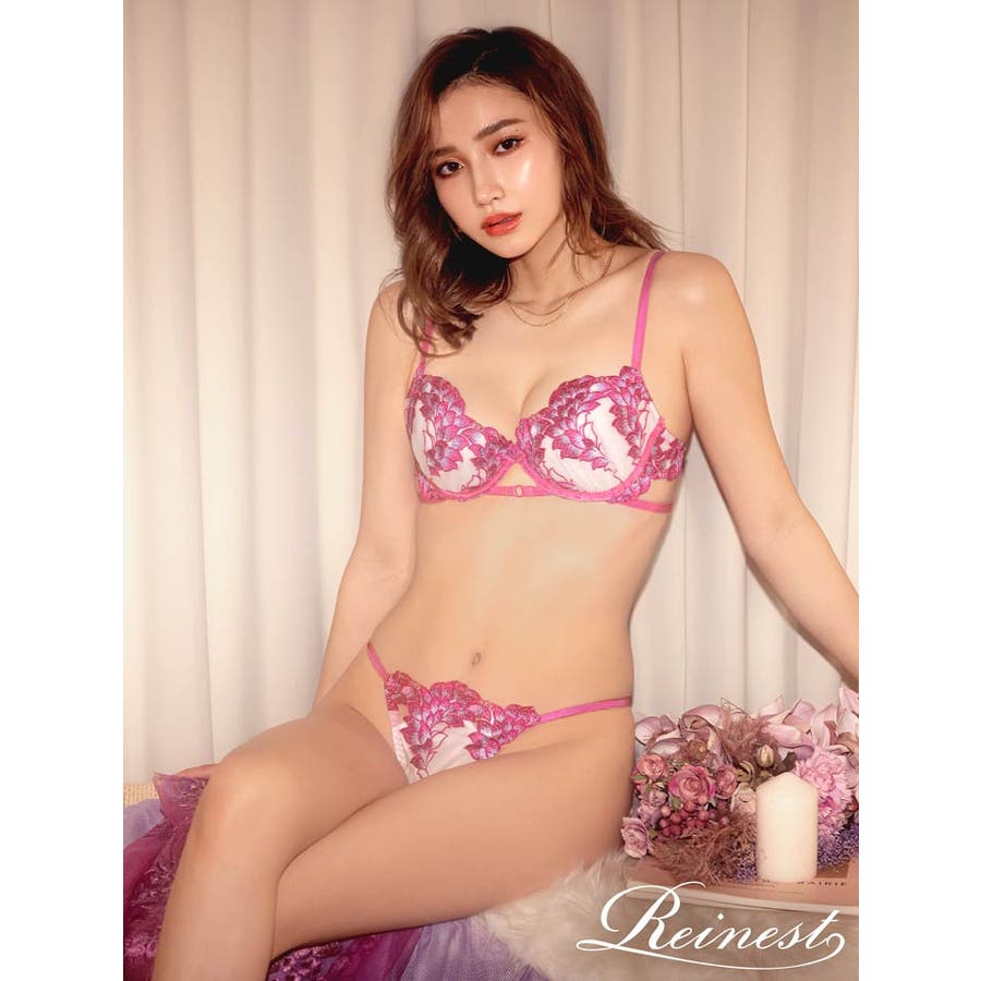 ジンジャーフラワーの刺繍が鮮やかなランジェリー。ブラジャーのバックベルトがダブルストリング、ショーツがストリングラインになっていて、サイドからバックにかけてのボディラインをセクシーに魅せてくれます。