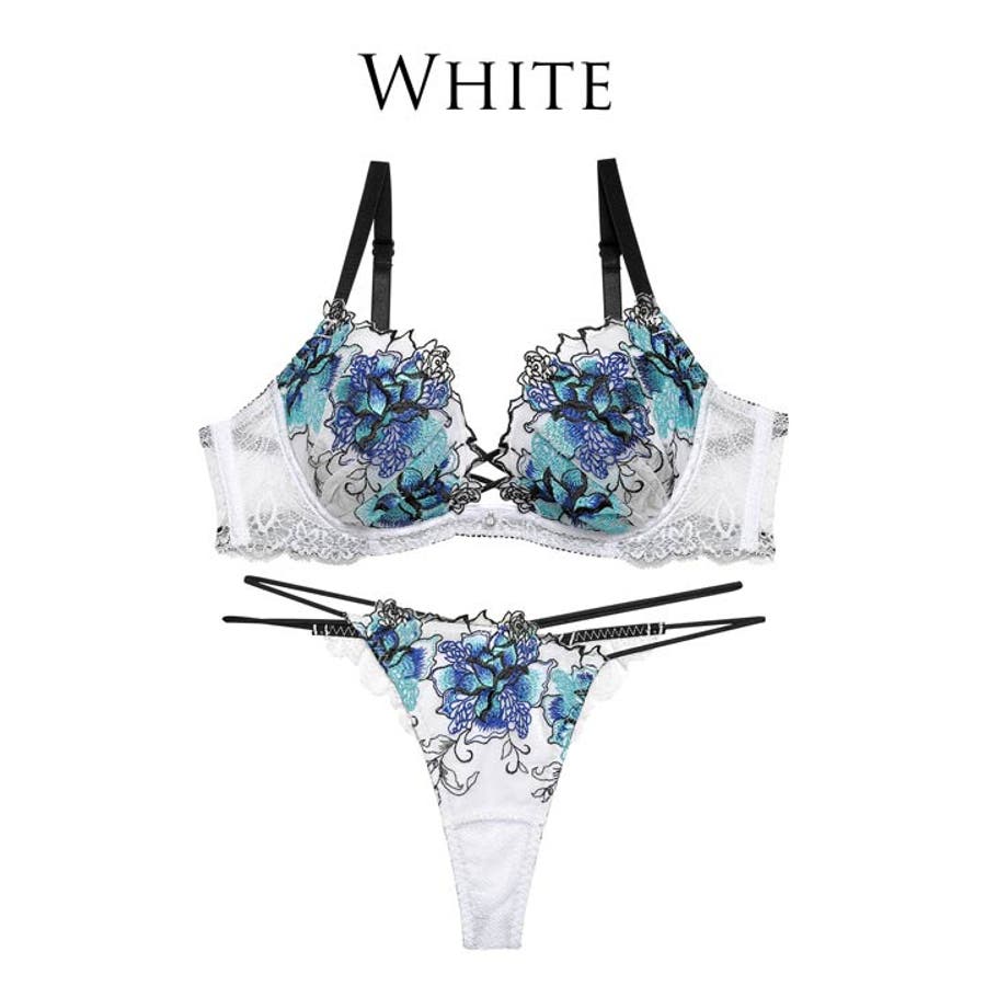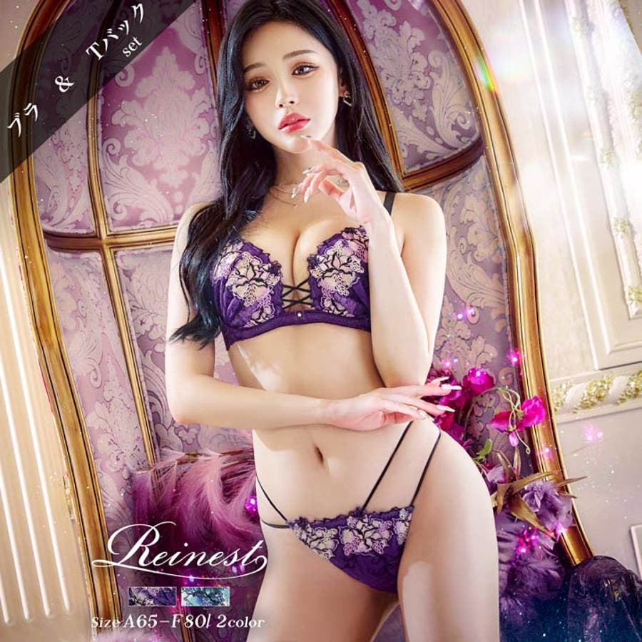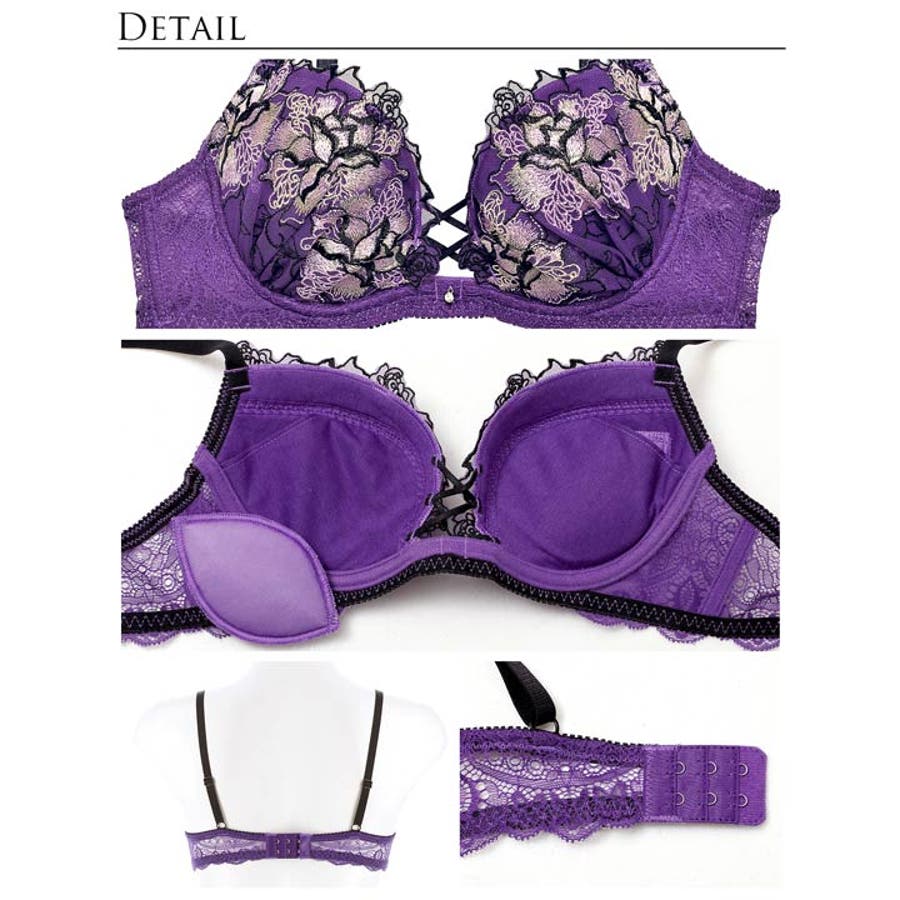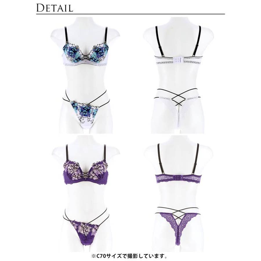 色鮮やかなフラワー刺?に透け感のあるローズを重ねたランジェリー。大胆なレースアップデザインは谷間からセクシーさ溢れるアクセントに◎ アシンメトリーにカットされたショーツはこなれ感を演出する1着です。
