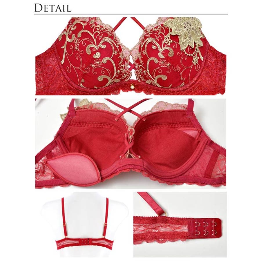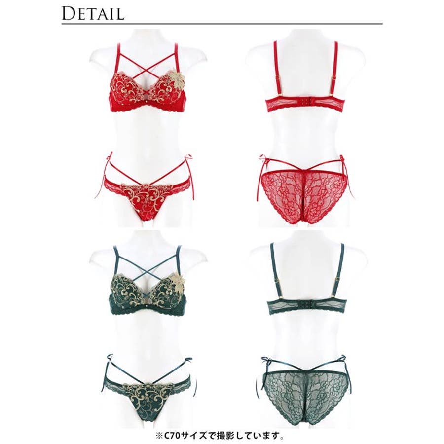 可愛らしい小花や曲線を描く上品な刺繍を施したホリデーシーズンにぴったりのランジェリー。カップ脇のフラワーモチーフや、胸元のセクシーなクロスコードがアクセントに。ショーツは腰元で結ぶサテンリボンをあしらいほどよく甘さをプラスしました。