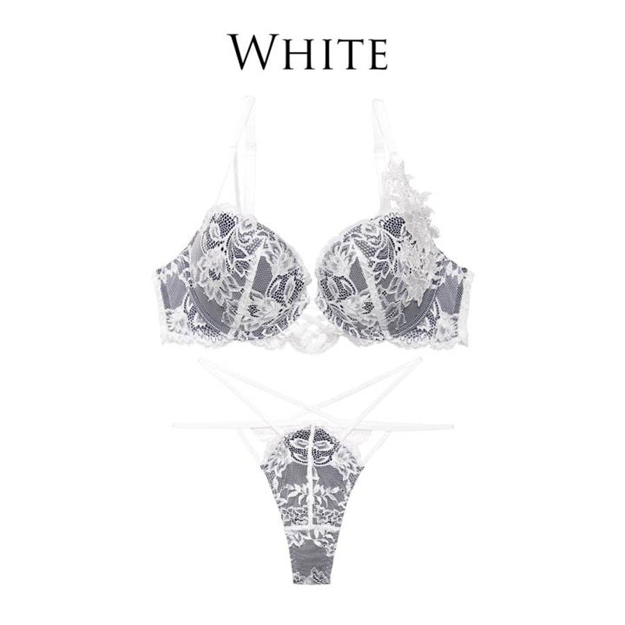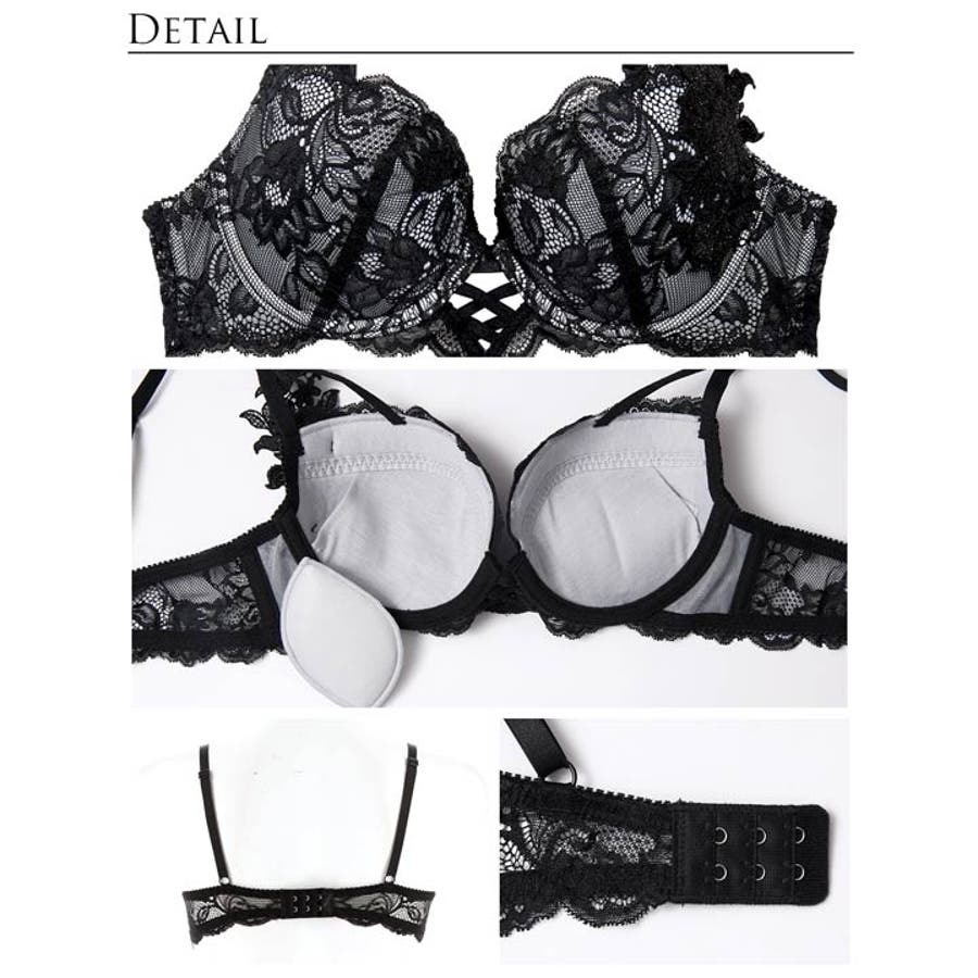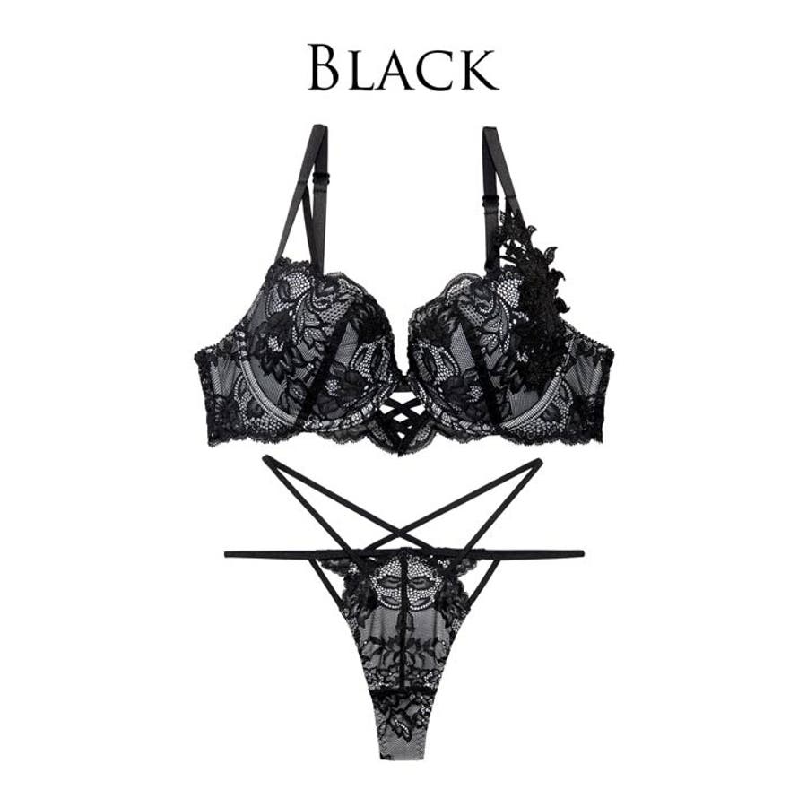 大ぶりのフラワーレースを贅沢に使用したゴージャスで大人な雰囲気のランジェリー。カップ脇に添えたケミカルレースのフラワーモチーフが華やかなアクセントに。谷間部分やショーツバックにはレースアップ風のクロスコードがあしらわれ360度セクシーさ漂うデザインです。