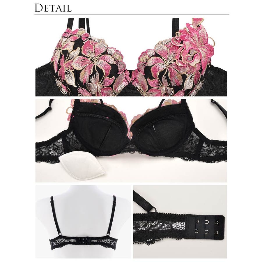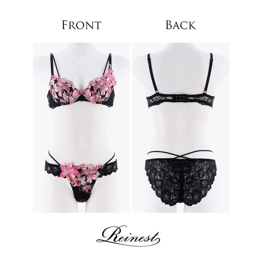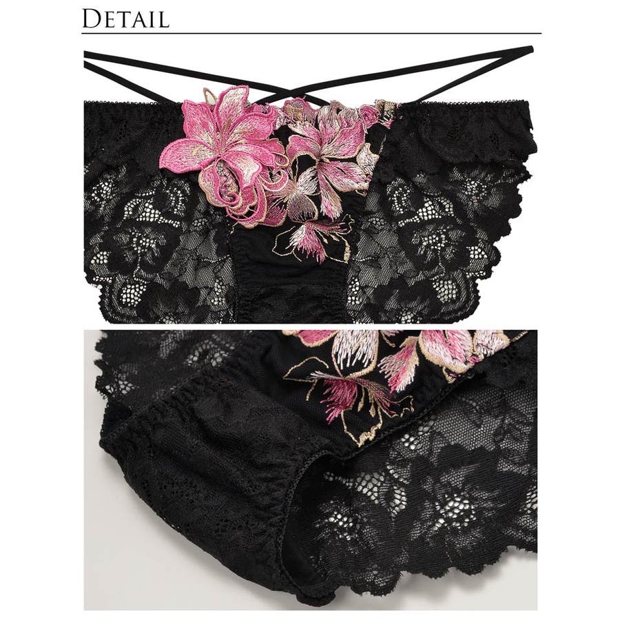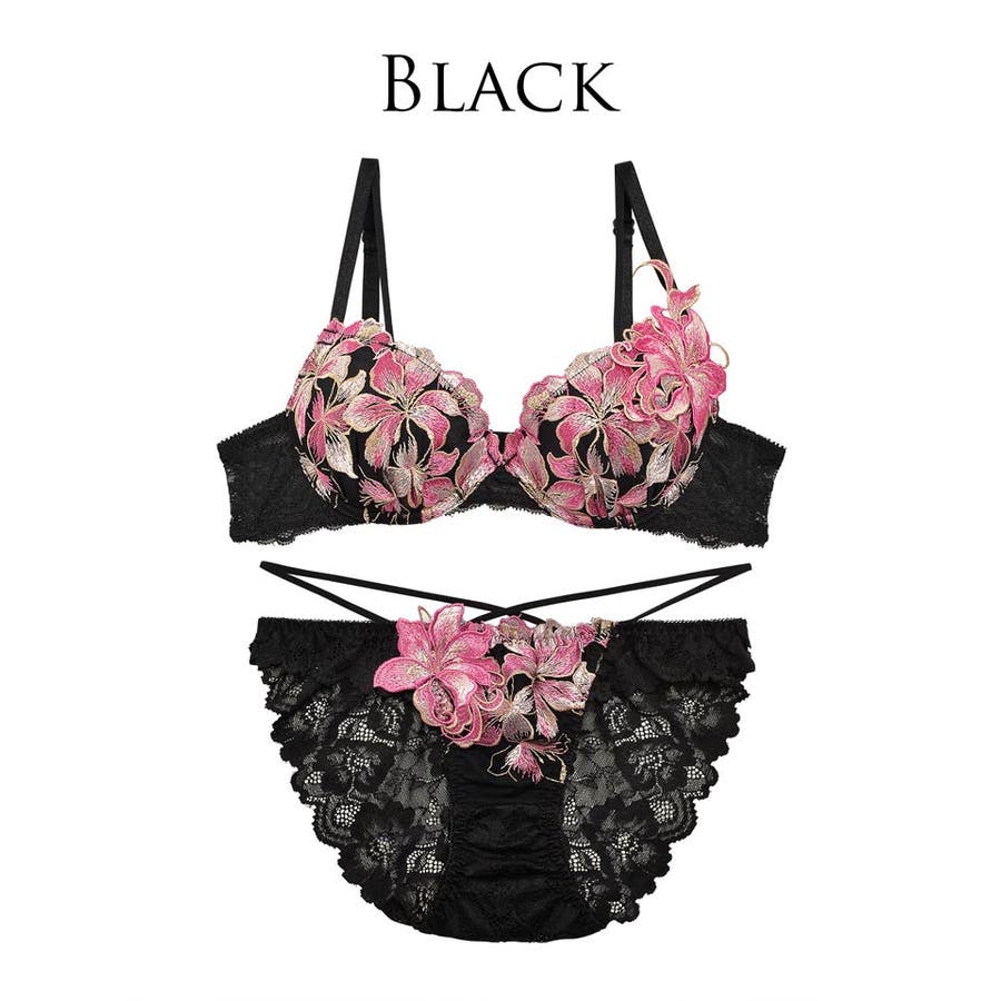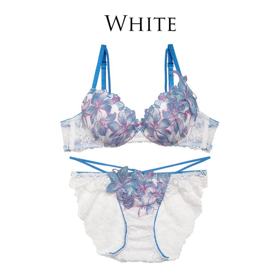 溢れるほどのリリー刺繍が素肌を華やかに彩るランジェリー。シックなブラックと爽やかなホワイトの2色展開。レースライン&ストリングで腰回りを飾るショーツはバック透け仕様で後ろ姿まで色気を漂わせます。