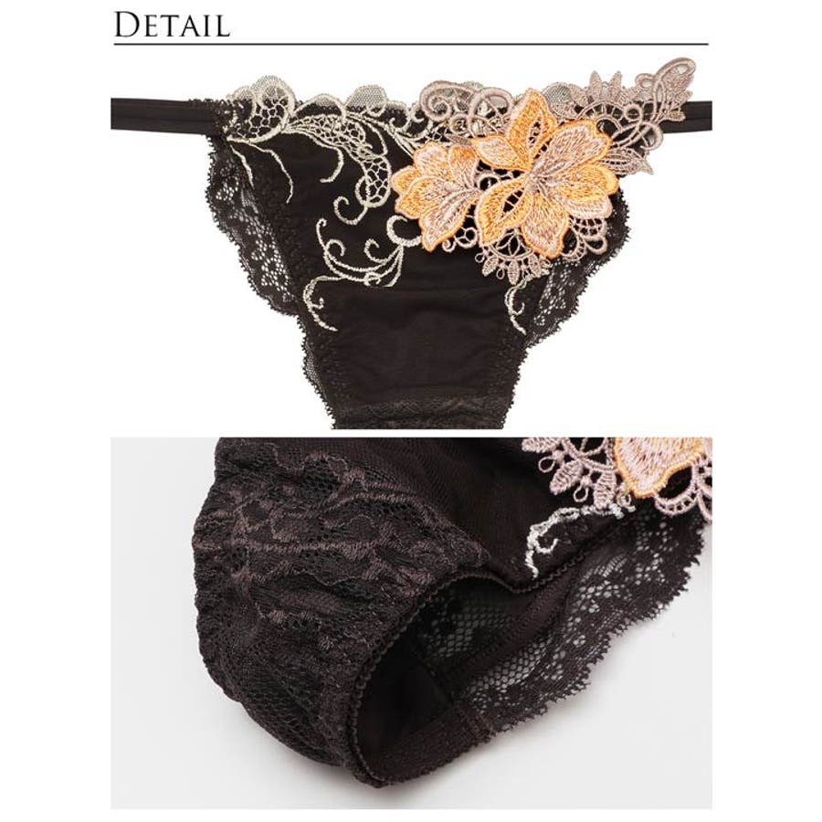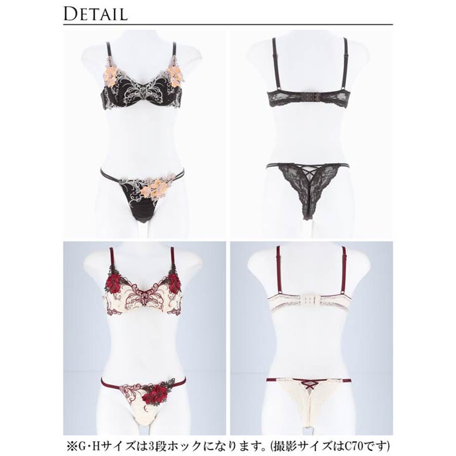 立体的で色鮮やかなフラワーモチーフが目を引くランジェリー。谷間部分とヒップのクロスコードデザインが色気を引き立たせるアクセントに♪ショーツサイドは2本のストリングをあしらい華奢なウエストを演出します。
