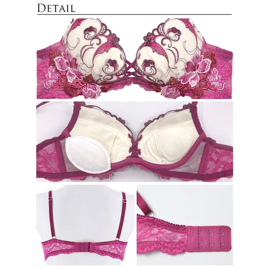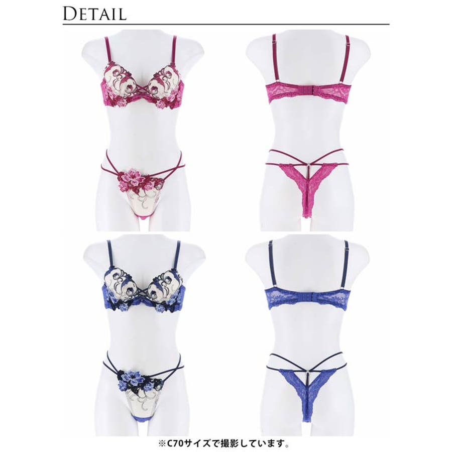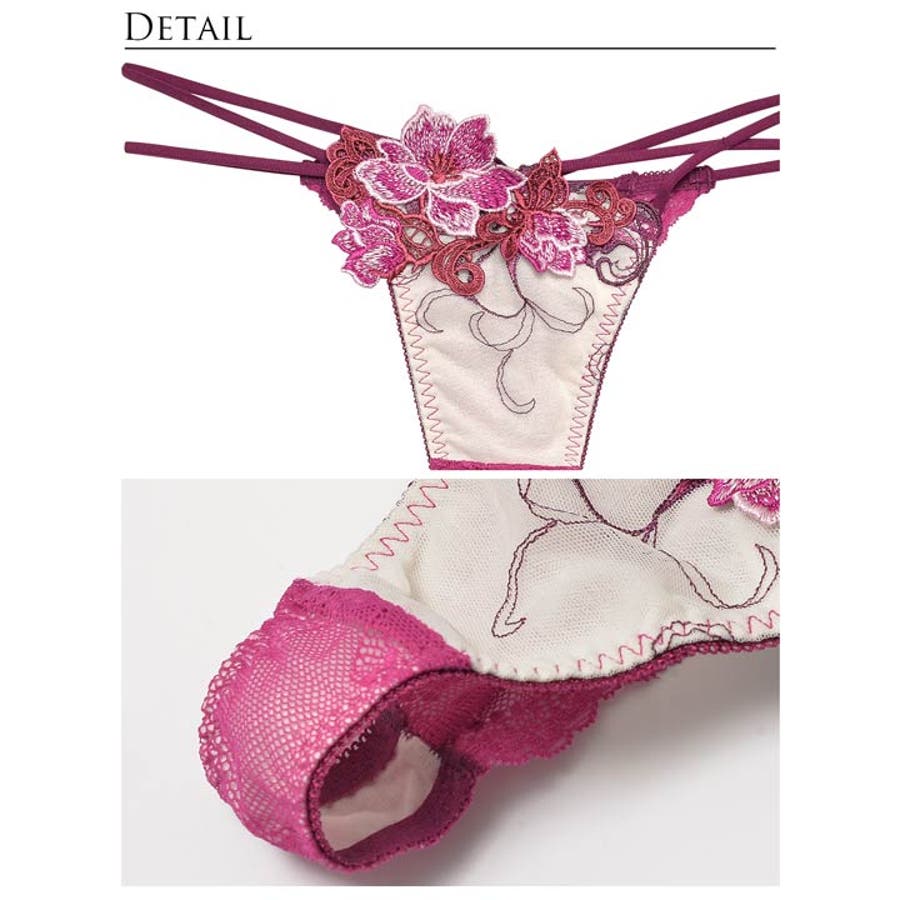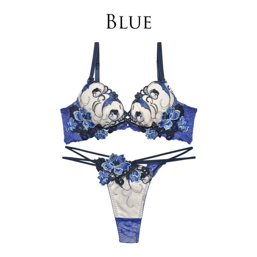 ピンクとブルーの高発色な立体フラワー刺繡が美しいランジェリー。大胆な谷間レースアップや絡み合うショーツのストリングが妖艶さを醸し出します。バックカットアウトにレースの透け感が360度セクシーさ溢れる1着です。