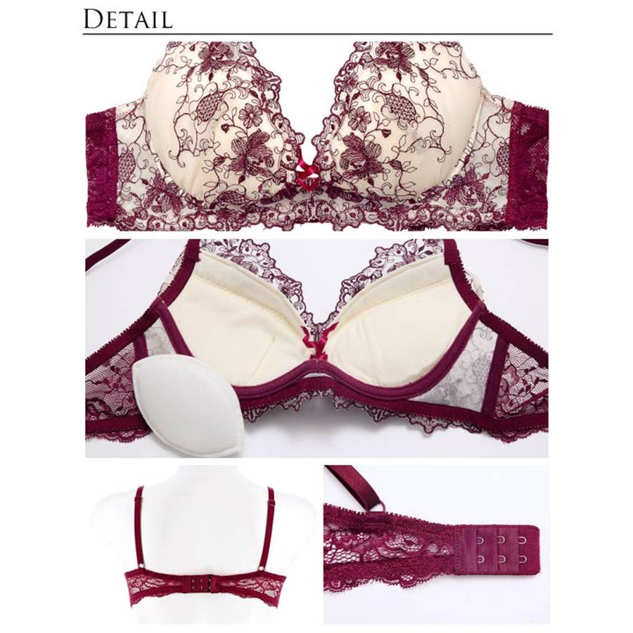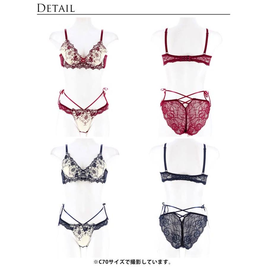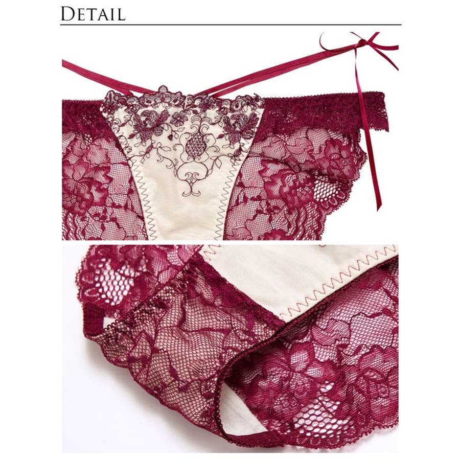 アンティークな雰囲気漂うディープカラーのアイビー刺繍が美しいランジェリー。バスト中央やショーツサイドにあしらわれた華奢なストリングデザインで女性らしい曲線美をしっかりアピール出来ちゃいます◎ レース越しに透ける素肌見せが女性らしさ溢れる1着です。