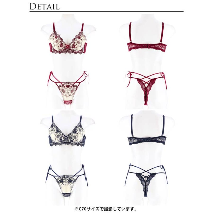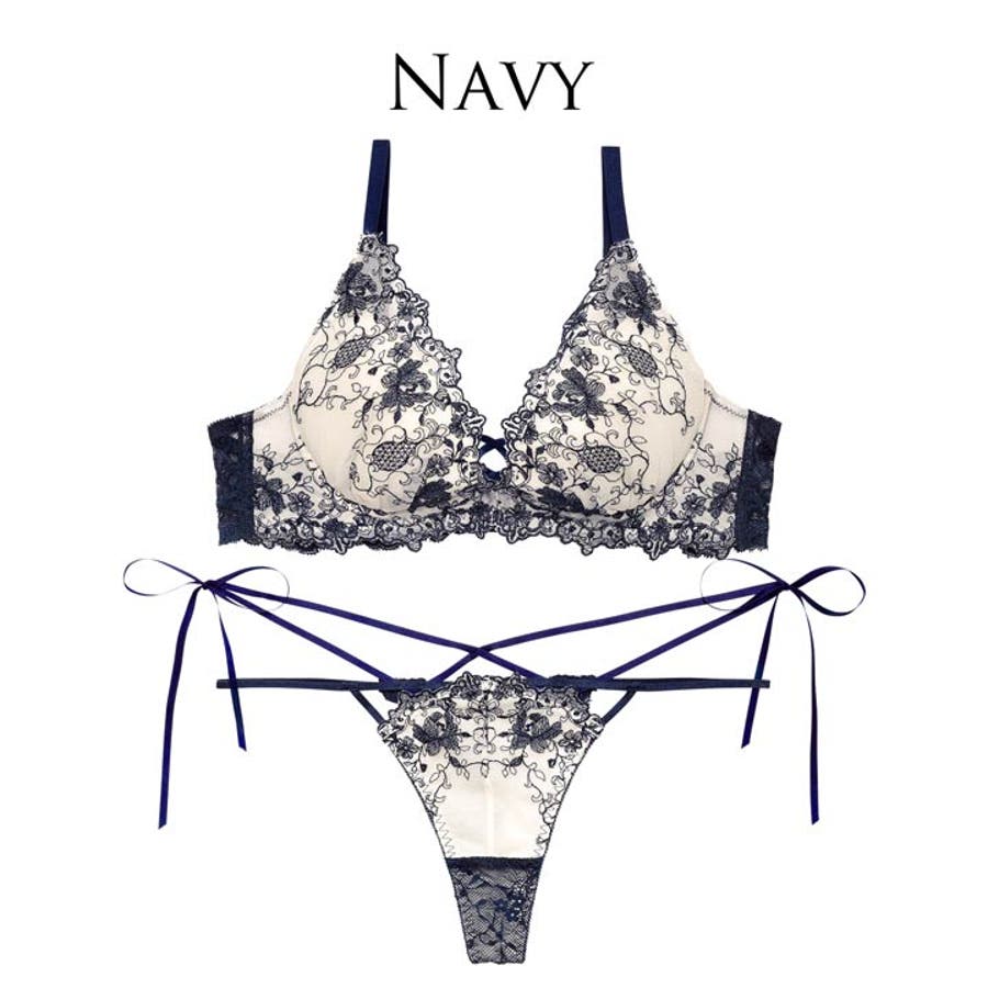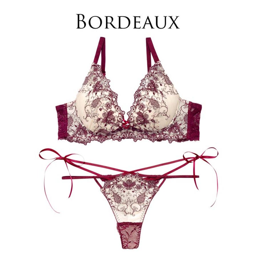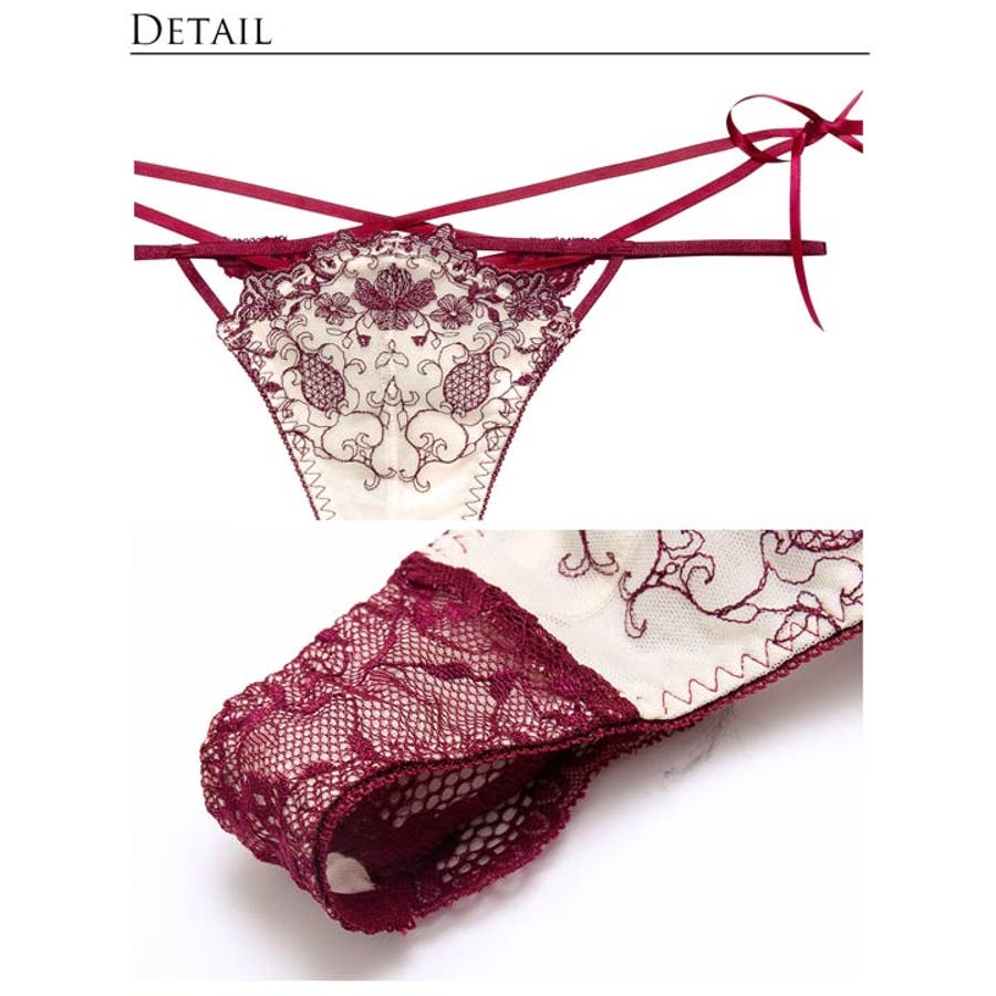 アンティークな雰囲気漂うディープカラーのアイビー刺繍が美しいランジェリー。バスト中央やショーツサイドにあしらわれた華奢なストリングデザインで女性らしい曲線美をしっかりアピール出来ちゃいます◎ レース越しに透ける素肌見せが女性らしさ溢れる1着です。