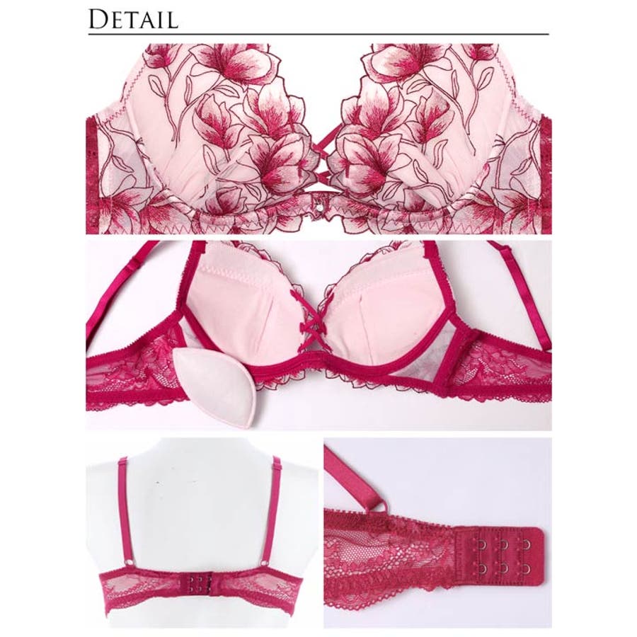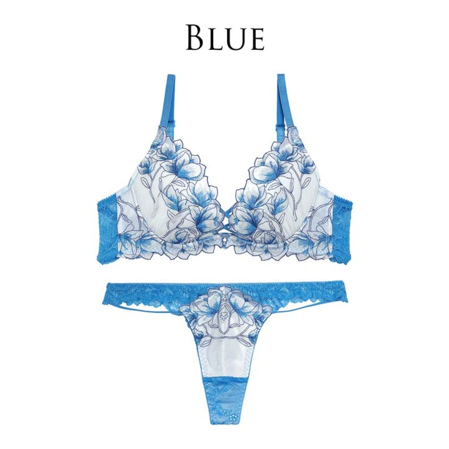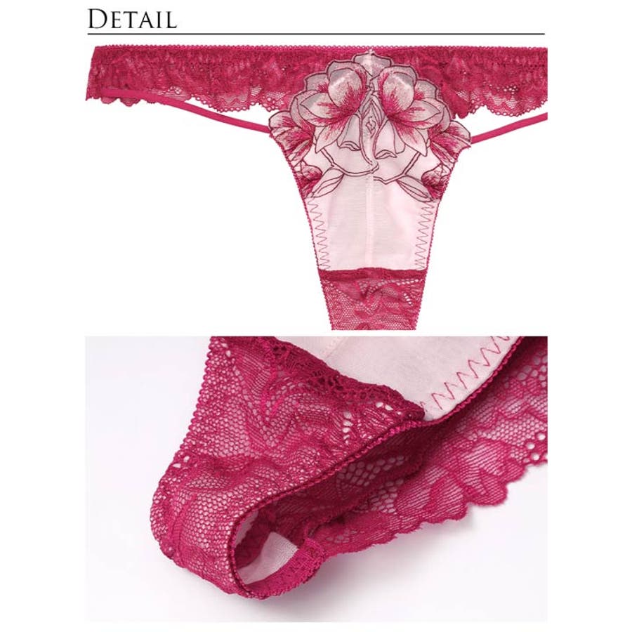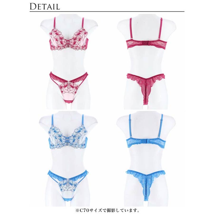 明るい色使いで描かれた大輪の花々が胸元を飾るラグジュアリーなランジェリー。谷間にかかるクロスデザインやきらりと光るシルバーチャームがアクセントに。ショーツフロントはストリングとレースの間から素肌を見せるセクシーな仕様で大人な色気を演出します。