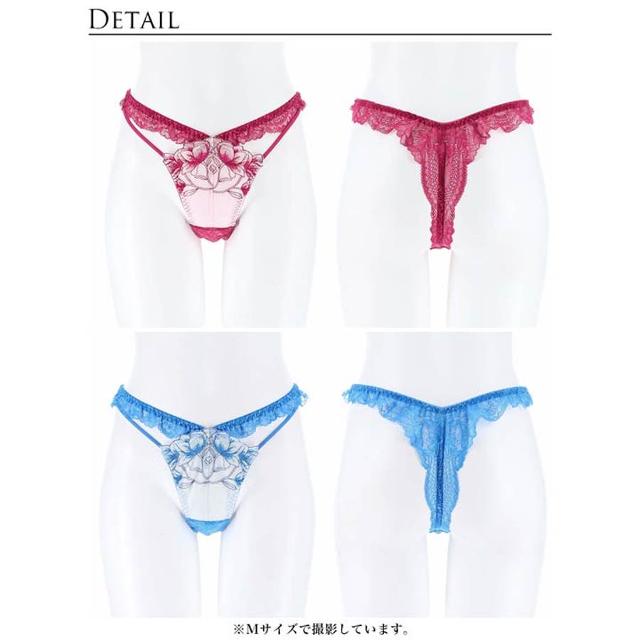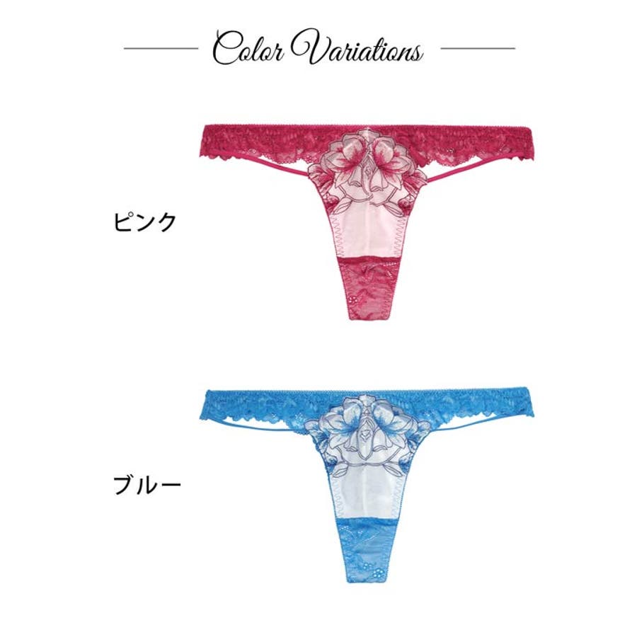 明るい色使いで描かれた大輪の花々が腰元を飾るラグジュアリーなランジェリー。ストリングとレースの間から素肌を見せるセクシーなデザインで大人な色気を演出。バックは上品な透け感のシアーレースで後ろ姿まで華やかに見せてくれます。