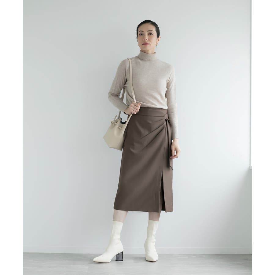 ホワイトのインナーとダークカラーのスカートやパンツと組み合わせて、モノトーンコーディネート。