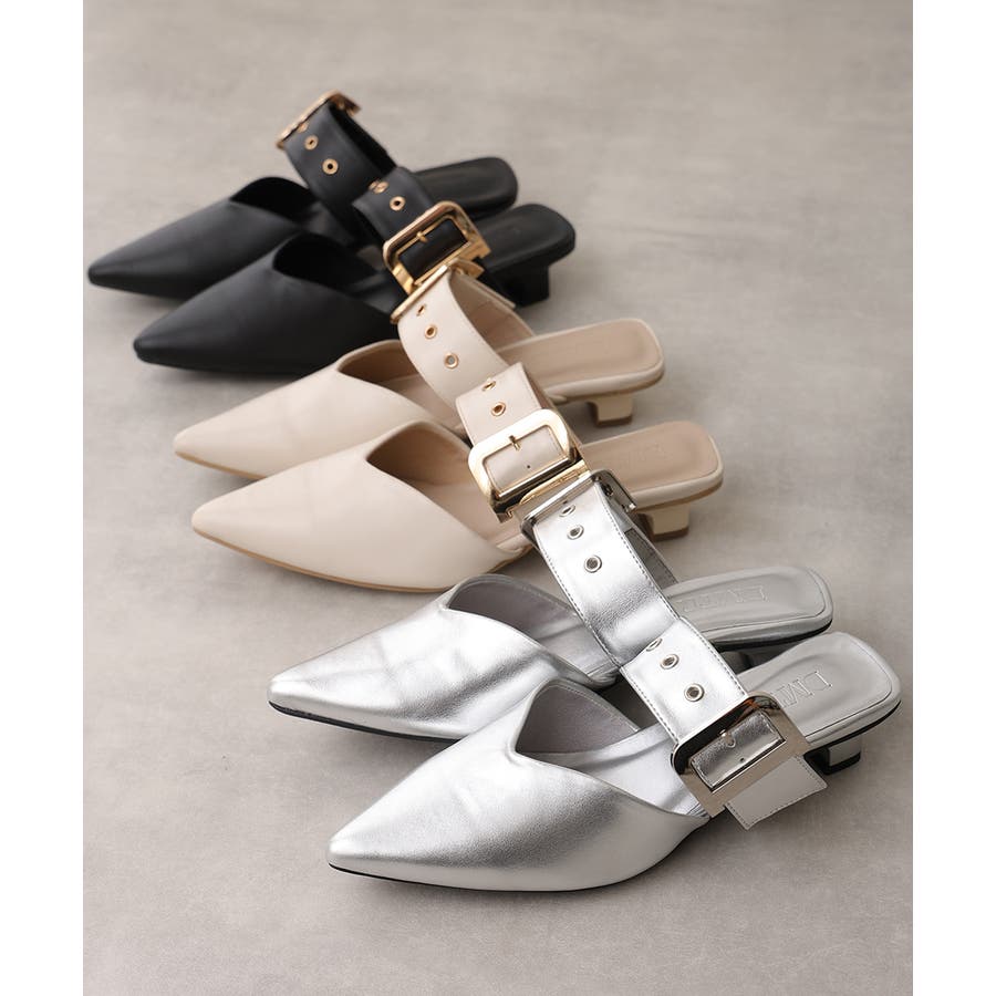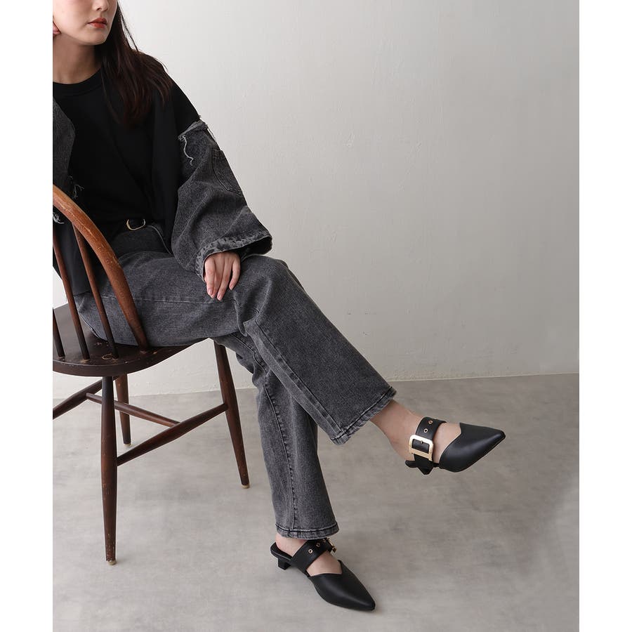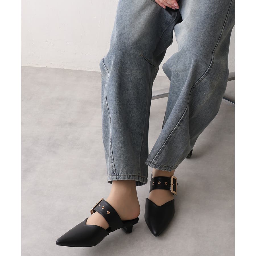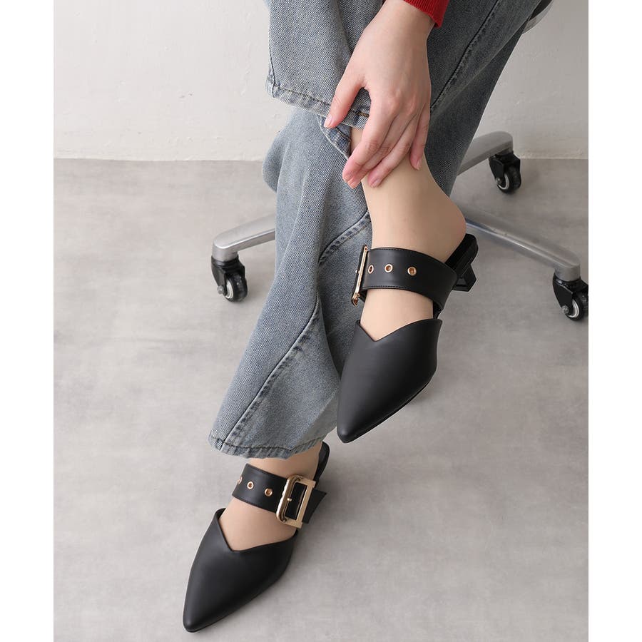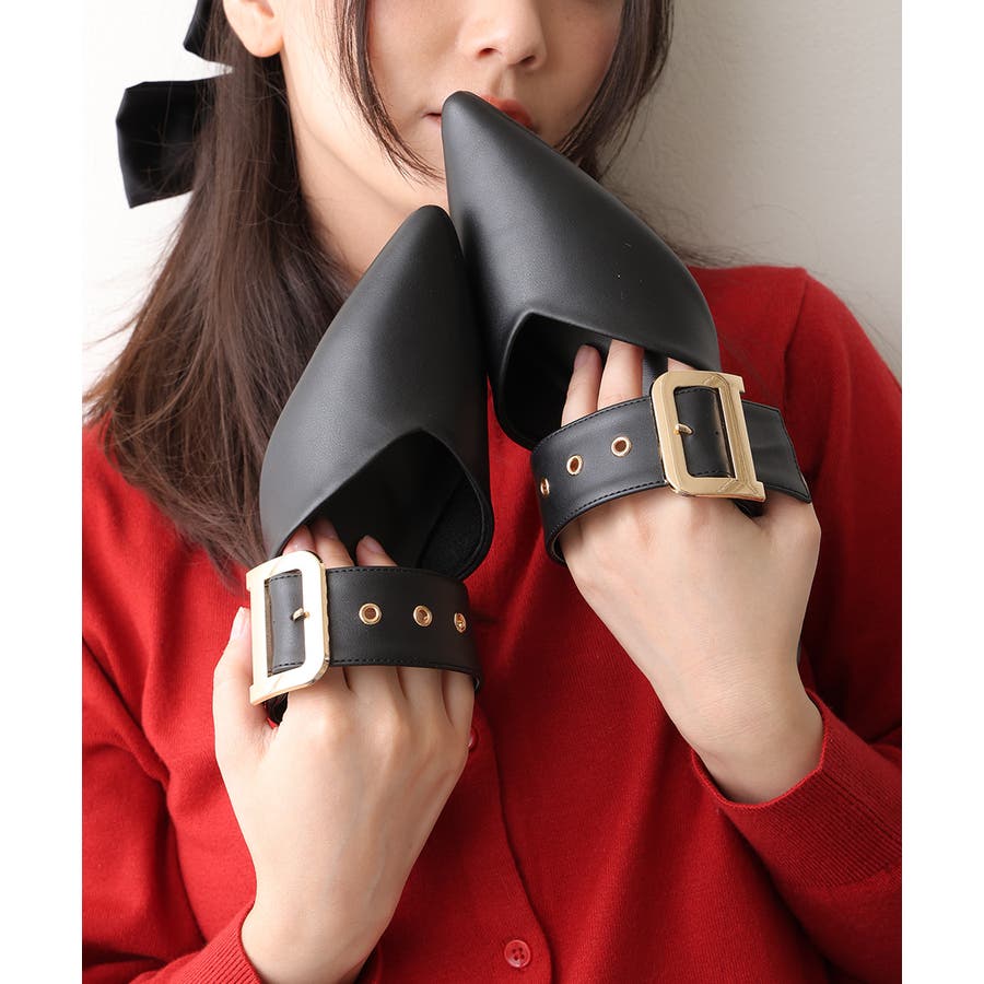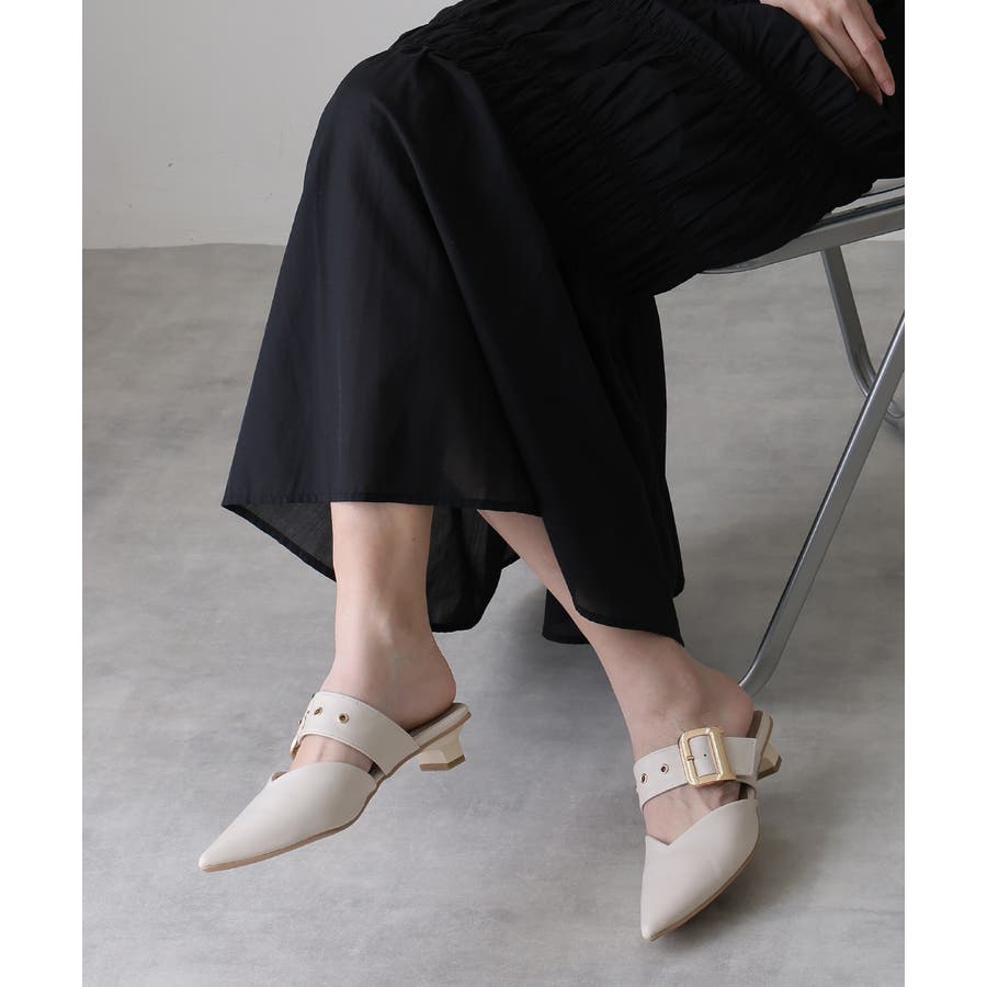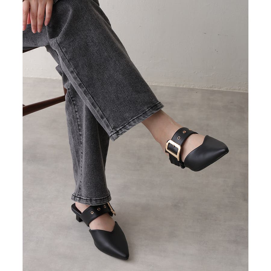 【25年春夏新作】ポインテッドトゥ バックルベルト ミュールパンプス
