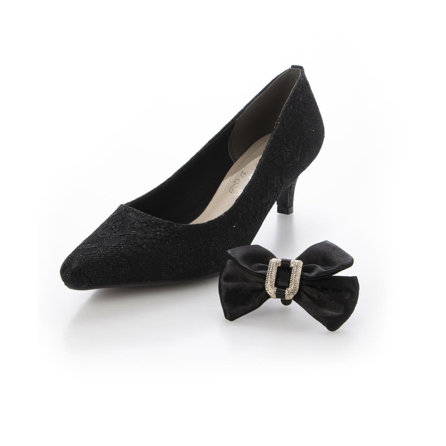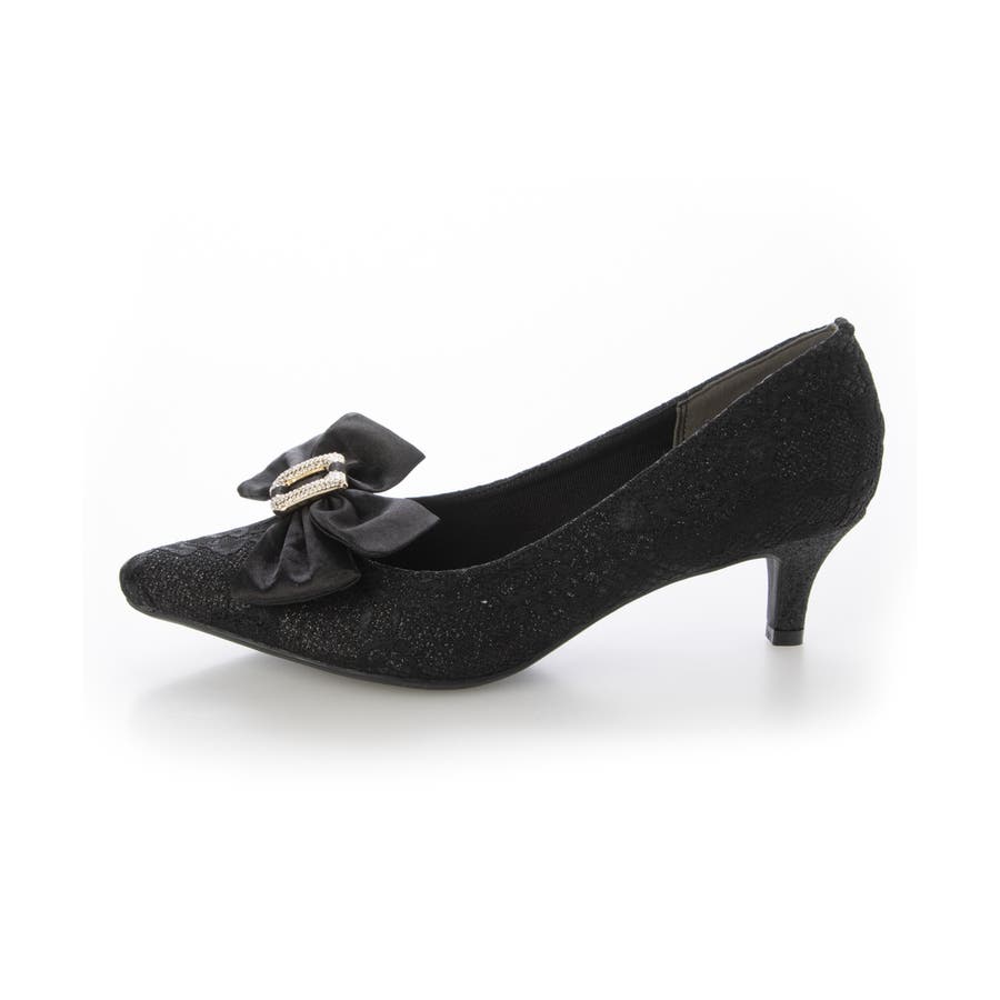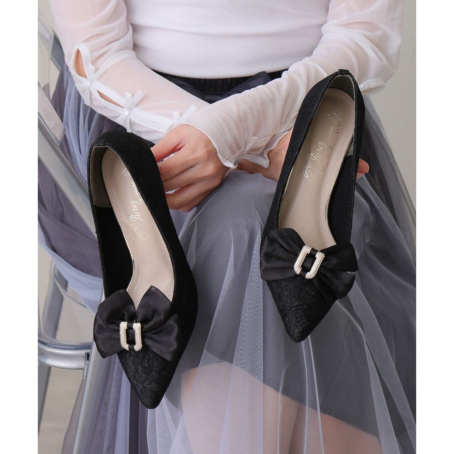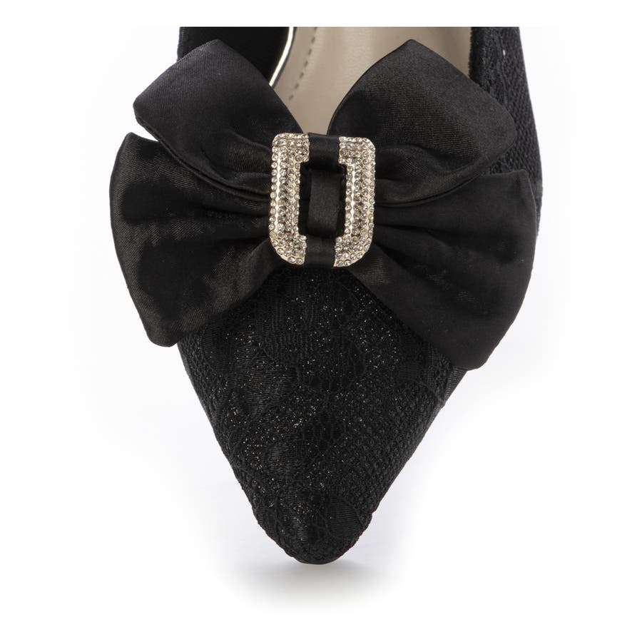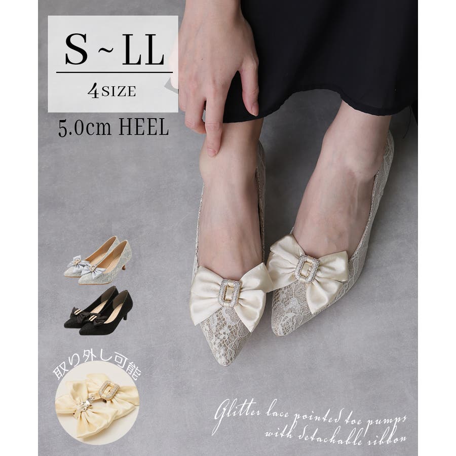 取り外しリボン付き グリッターレース素材 ポインテッドトゥ