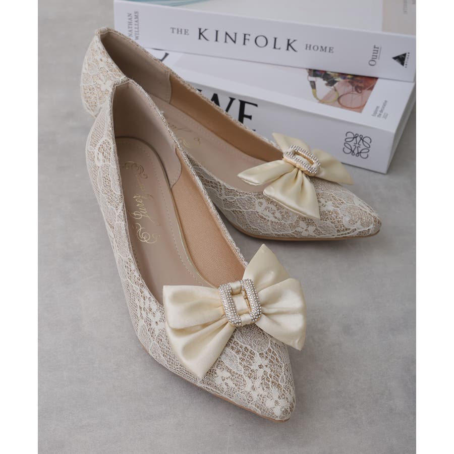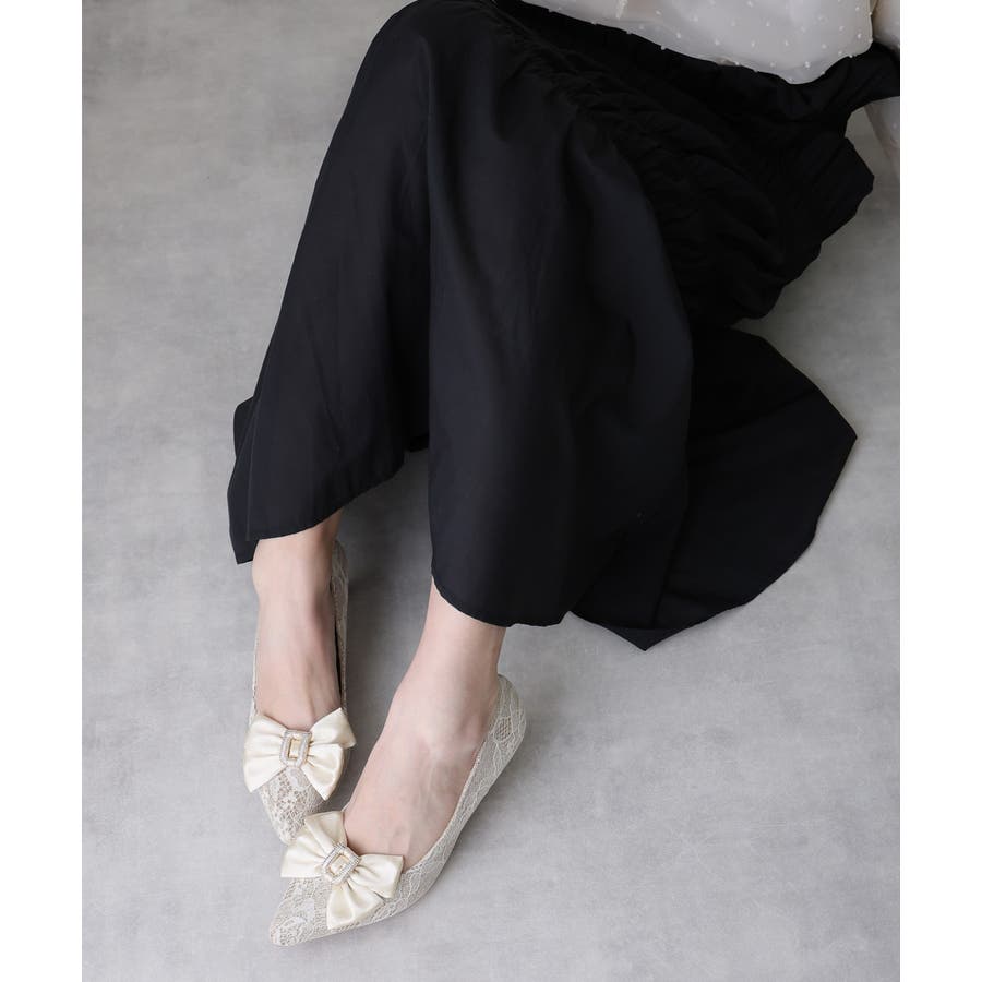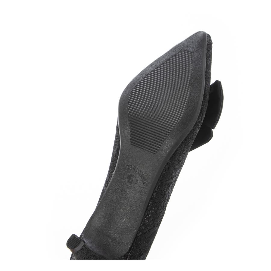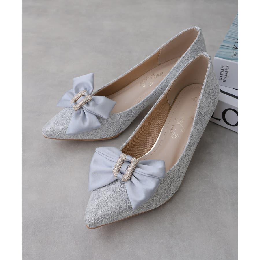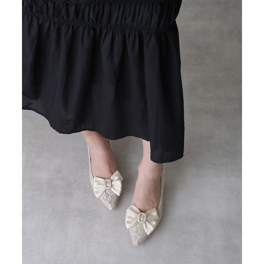 取り外しリボン付き グリッターレース素材 ポインテッドトゥ