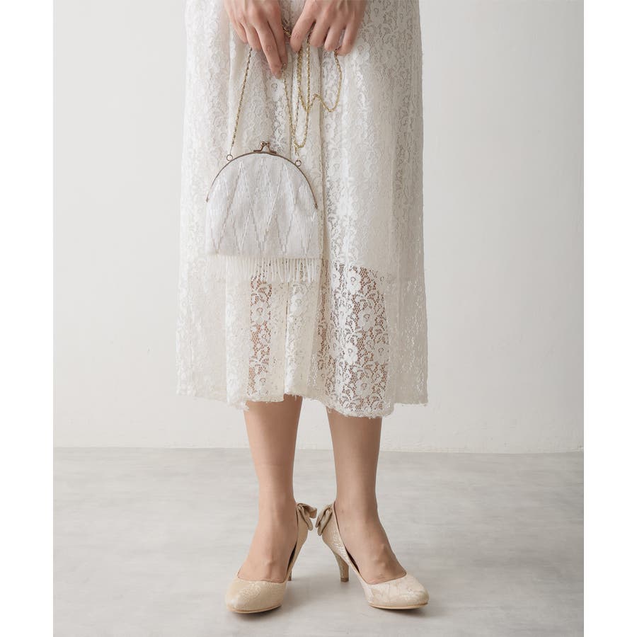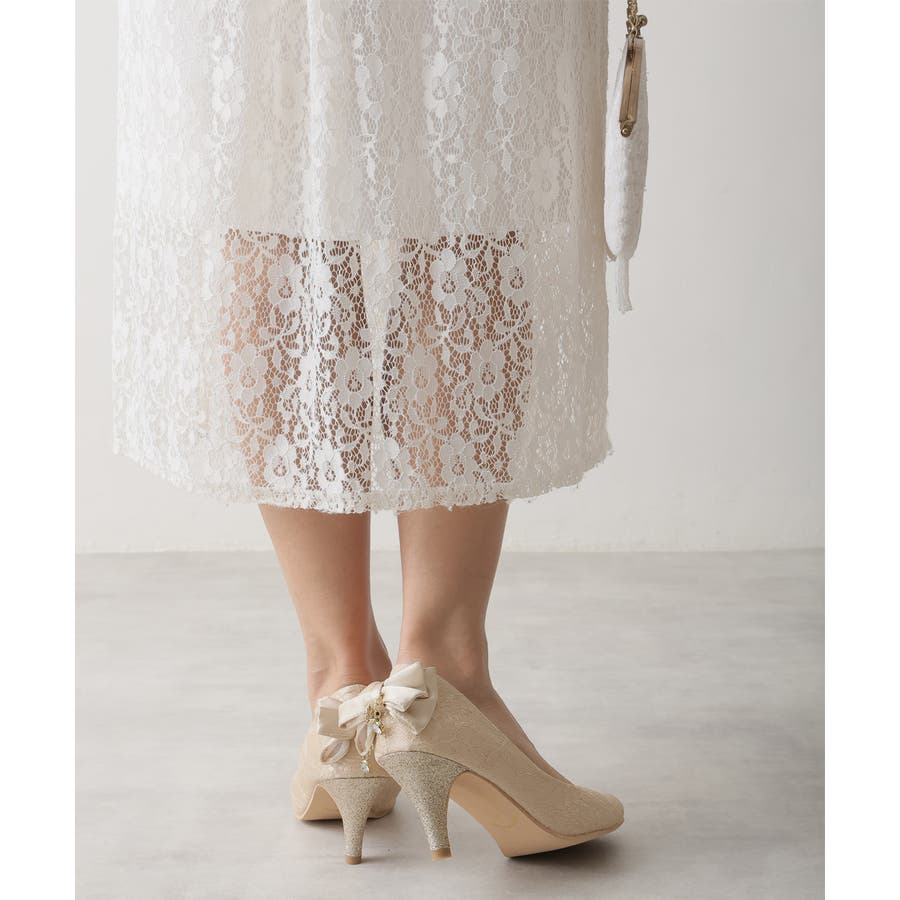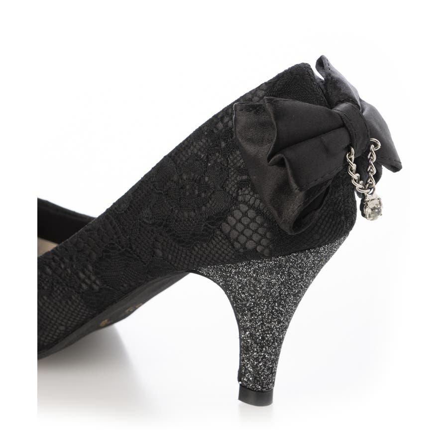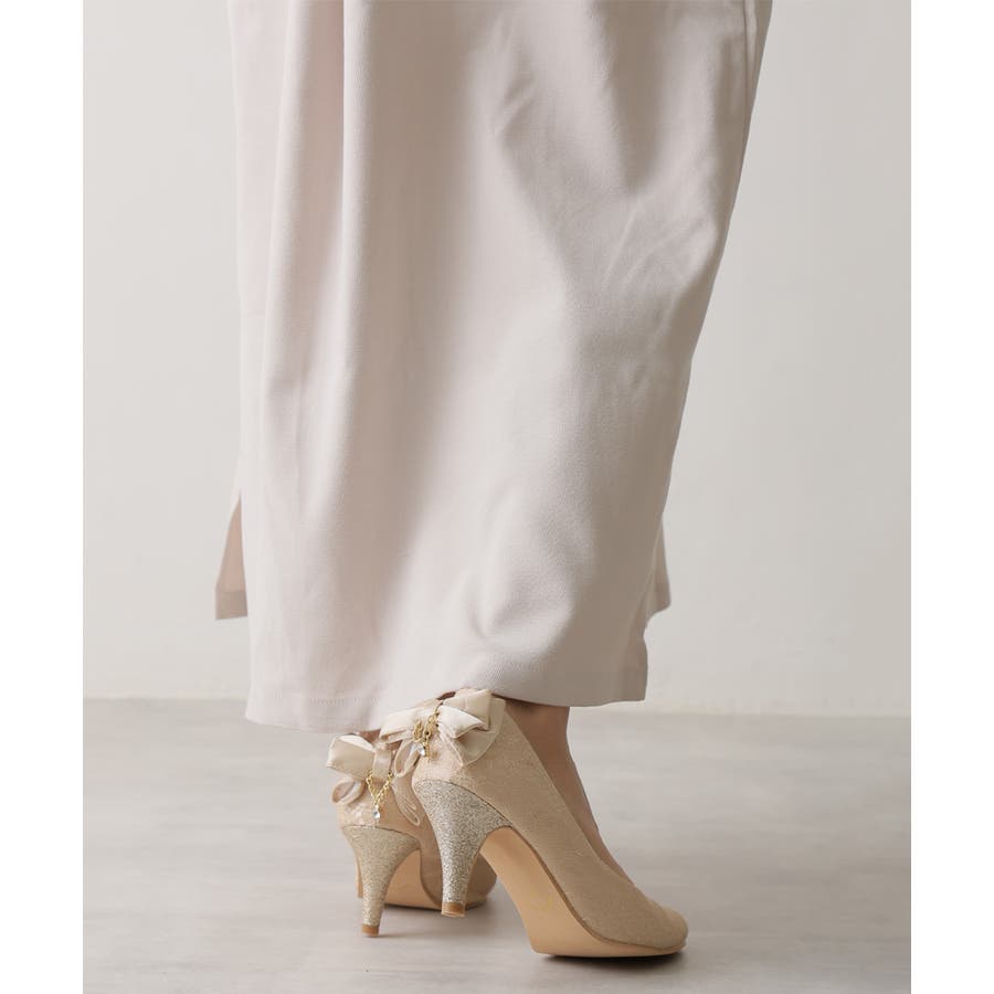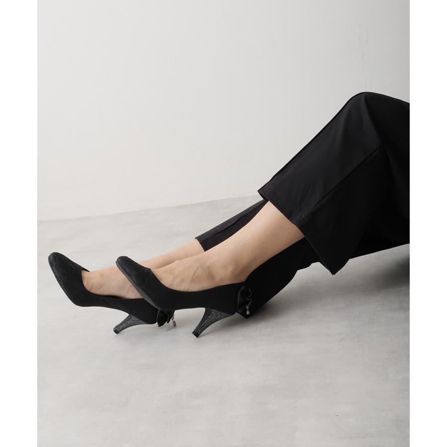 キラリと光るラメヒールと立体感のあるバックリボンに揺れるチャームで360度どこから見てもかわいいフェミニンパンプス♪