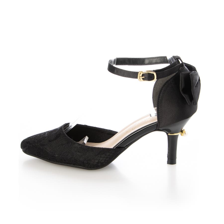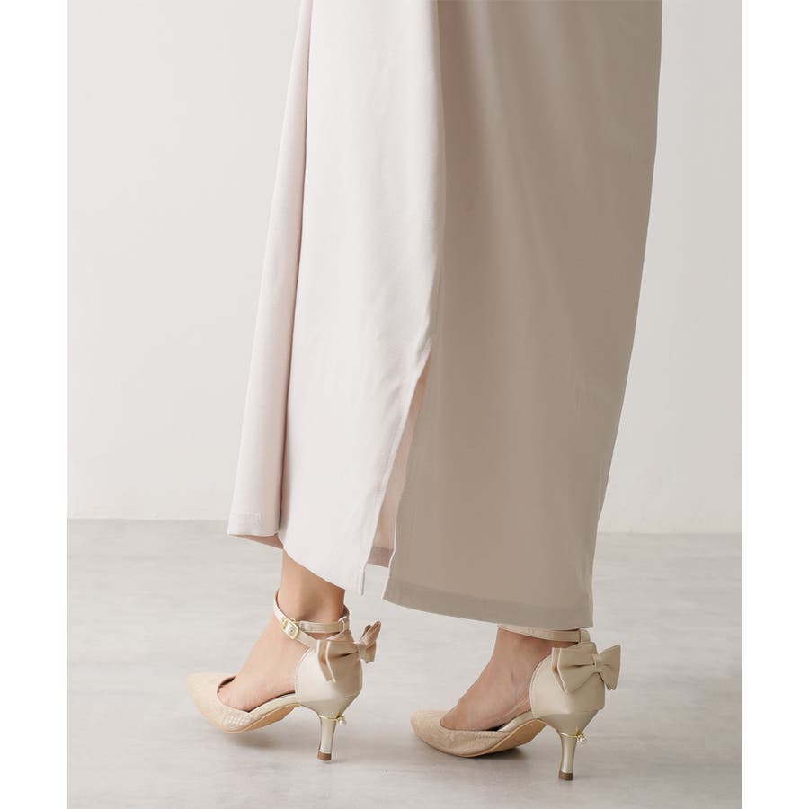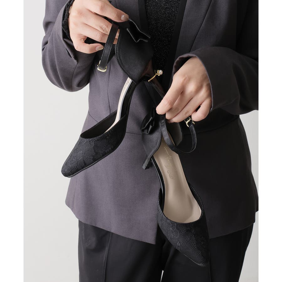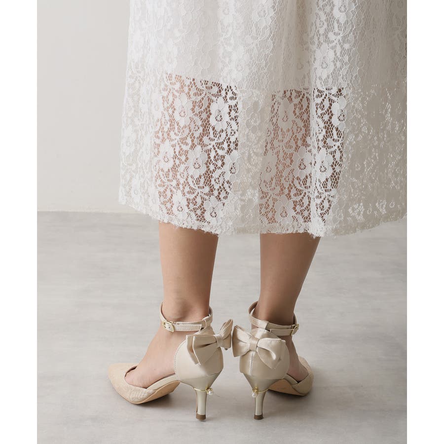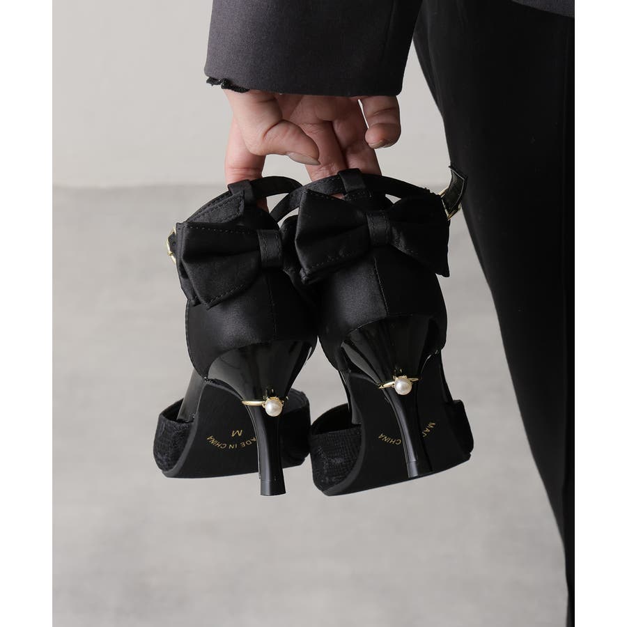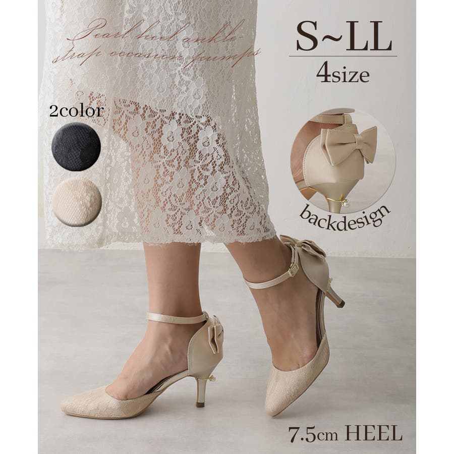程良い高さの7.5cmピンヒールで安定感もあり、立体感のあるバックリボンとパールリング付きヒールでエレガントな美脚を演出!