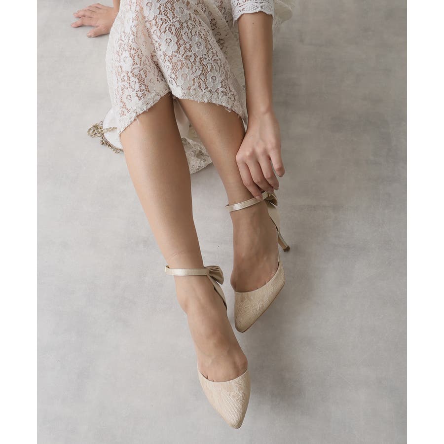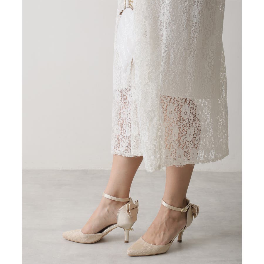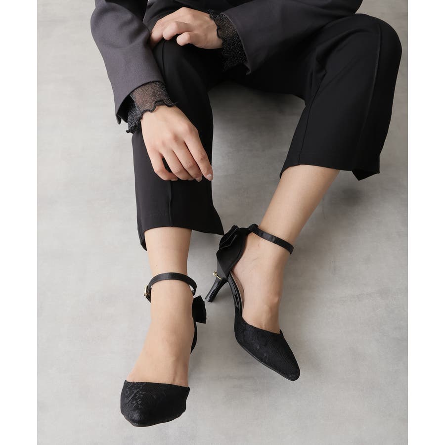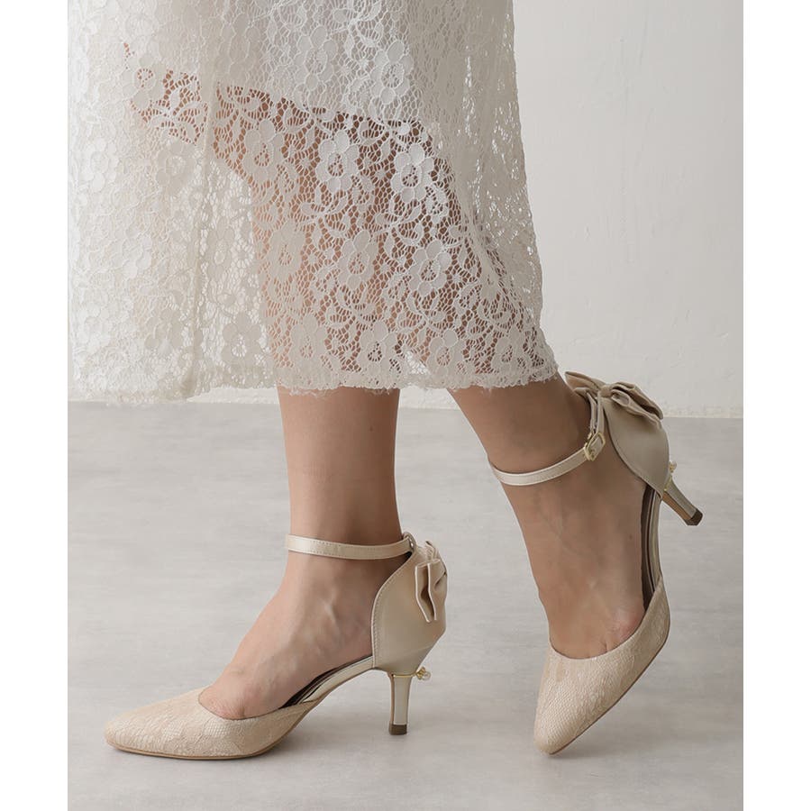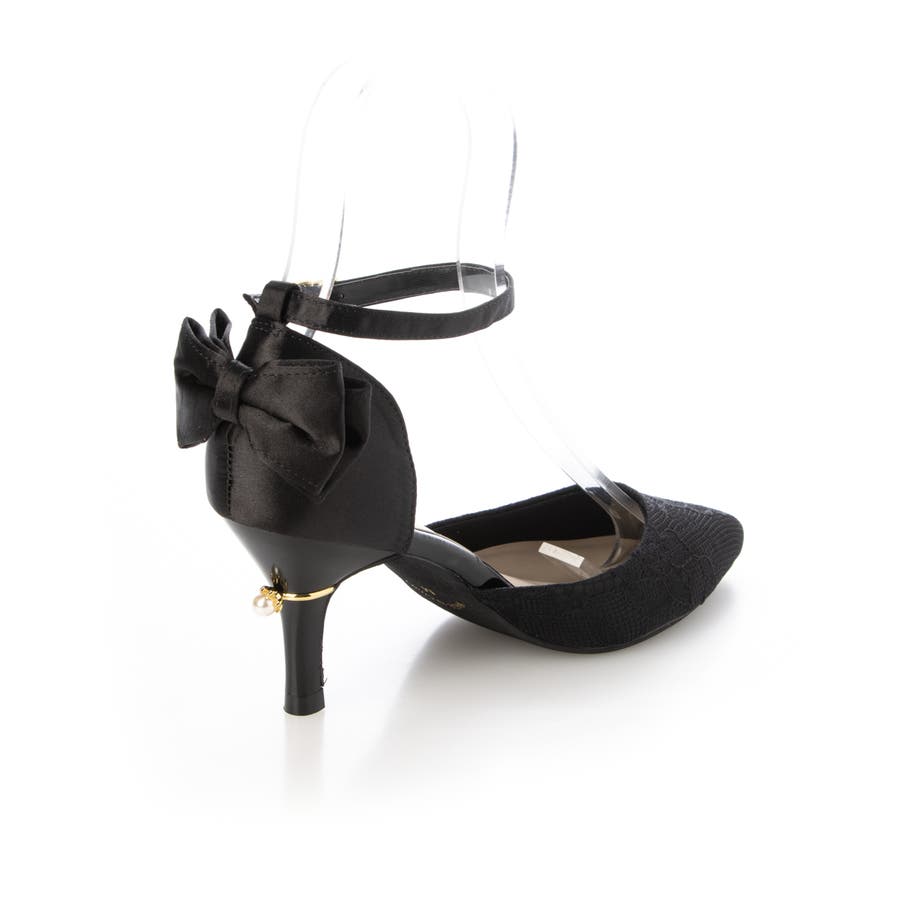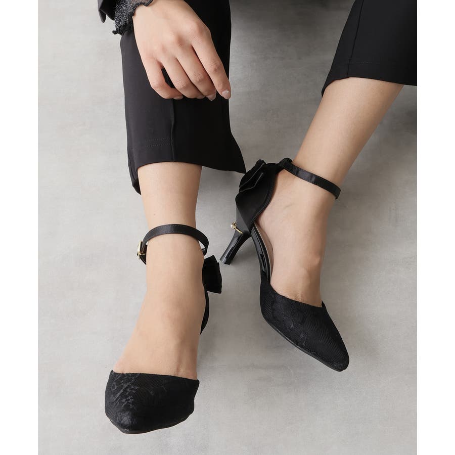 程良い高さの7.5cmピンヒールで安定感もあり、立体感のあるバックリボンとパールリング付きヒールでエレガントな美脚を演出!