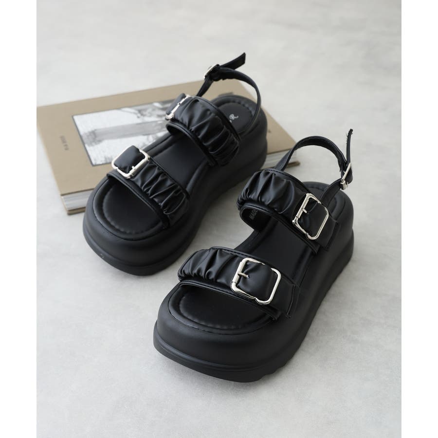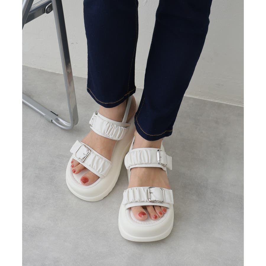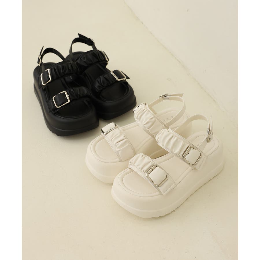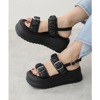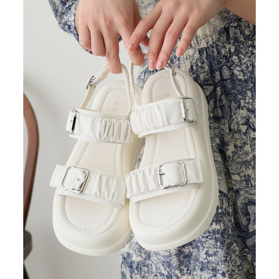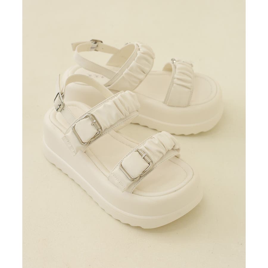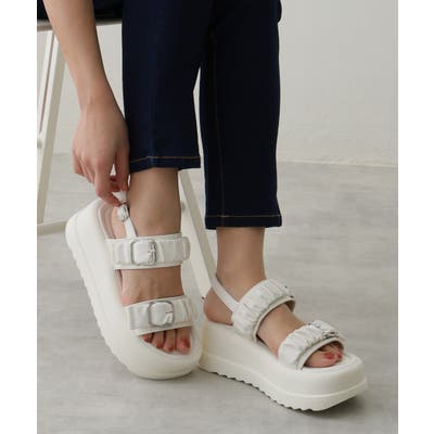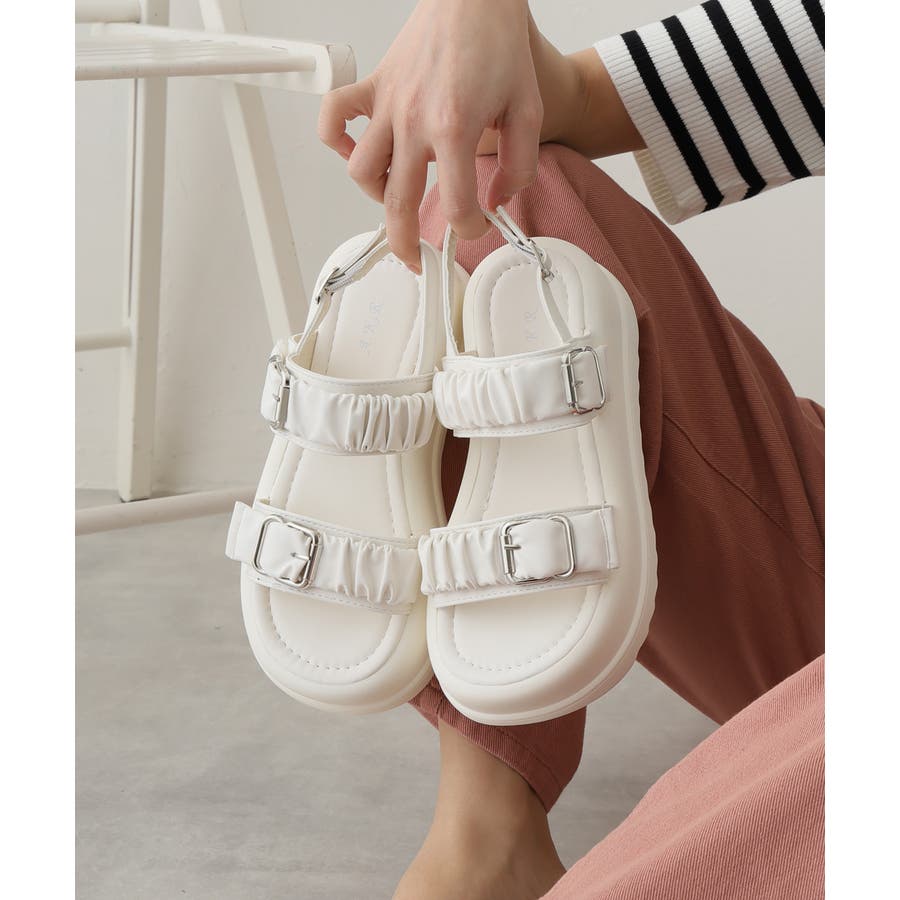 クシュっとシャーリングデザインのダブルベルトが個性的なサンダルです。