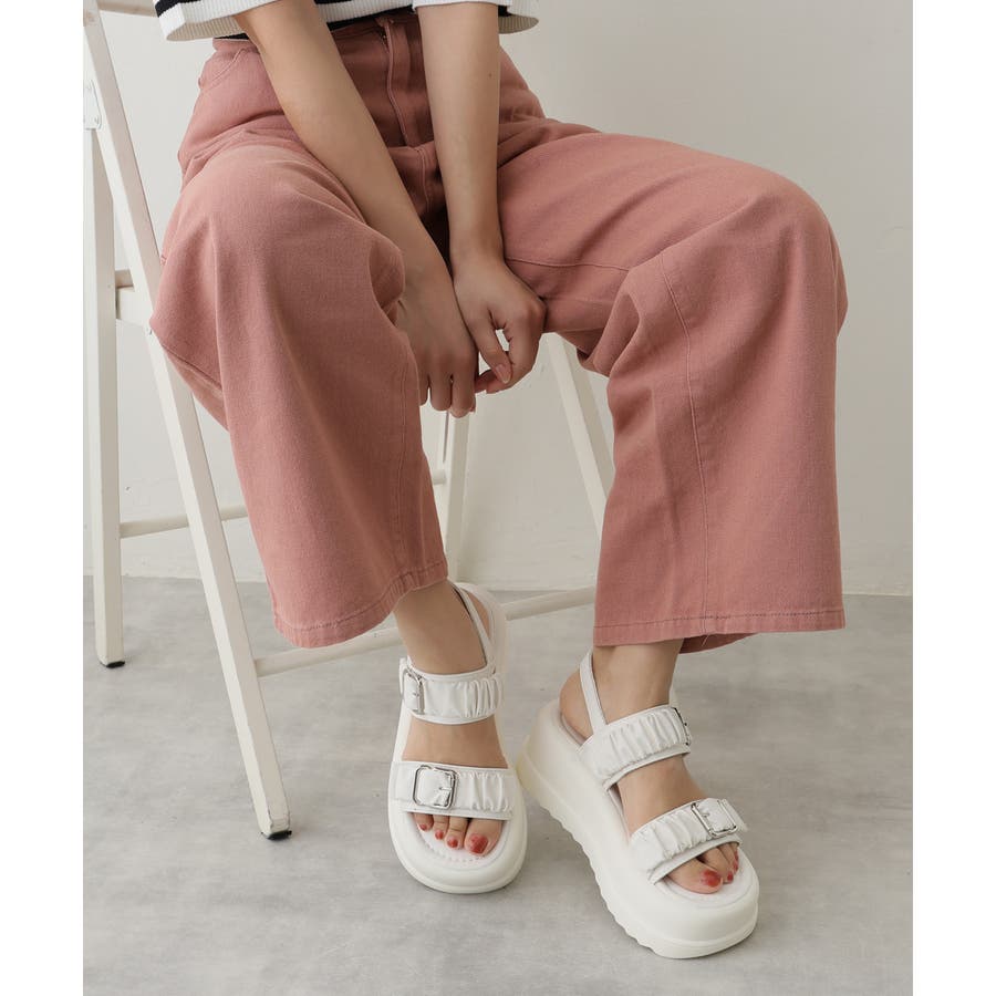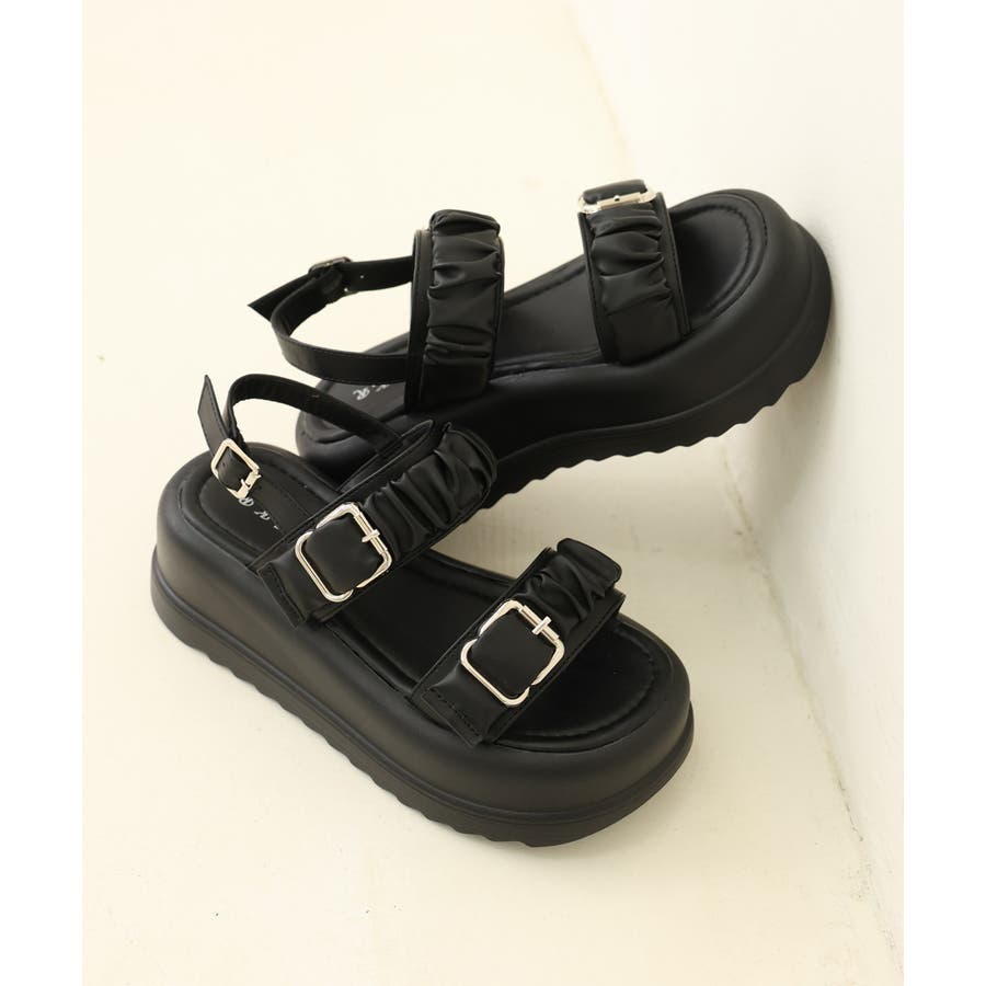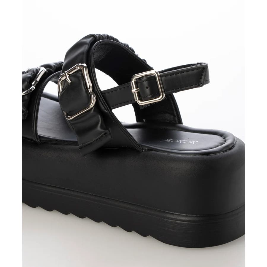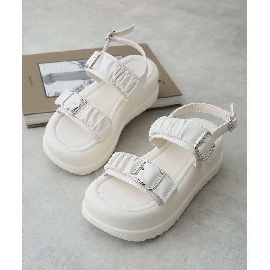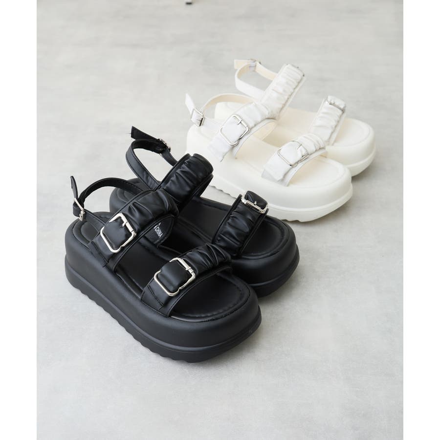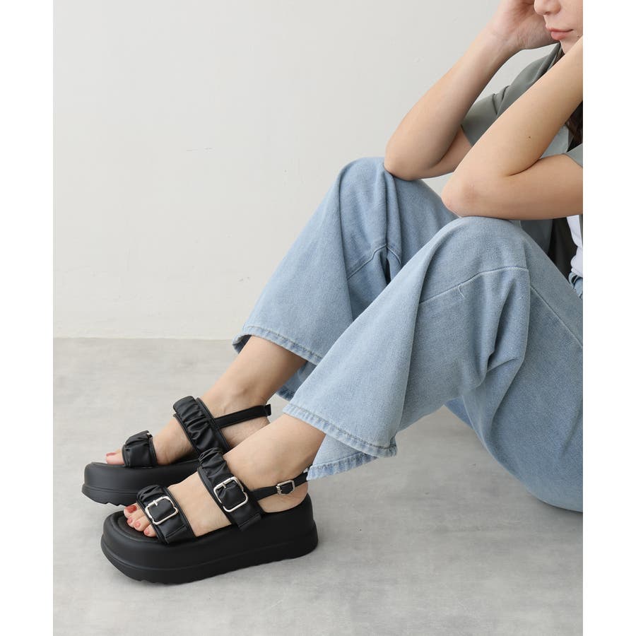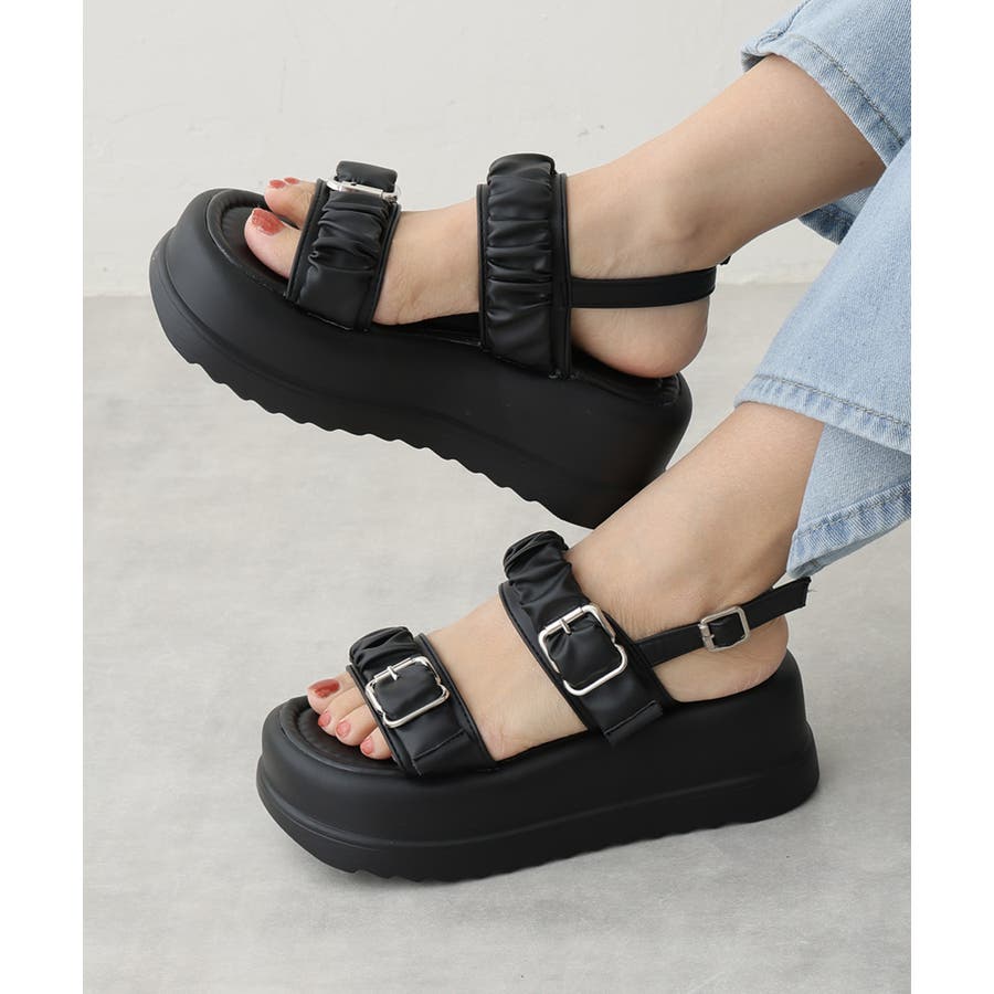 クシュっとシャーリングデザインのダブルベルトが個性的なサンダルです。