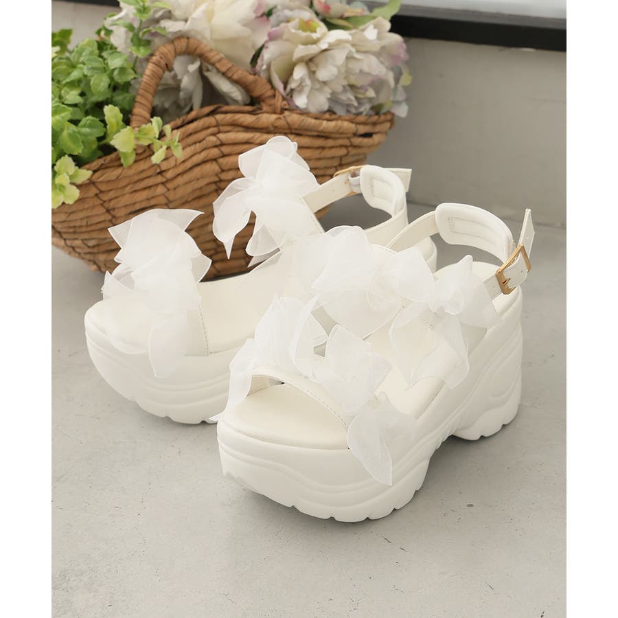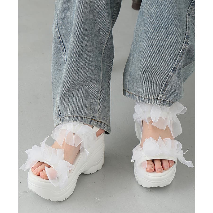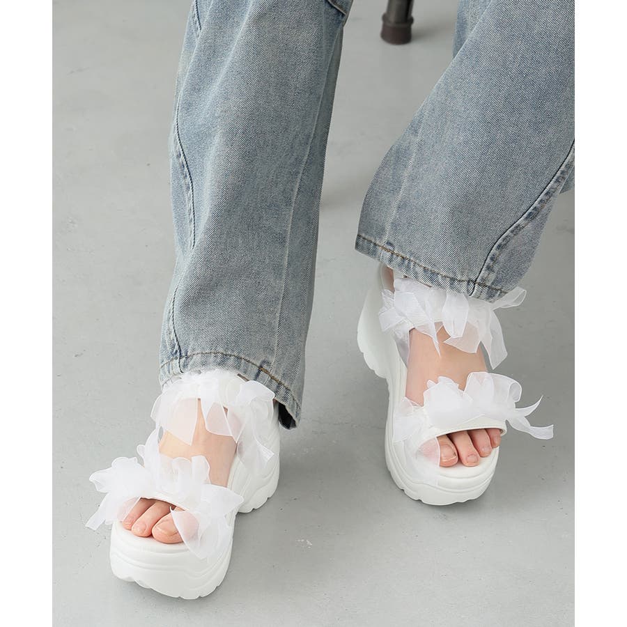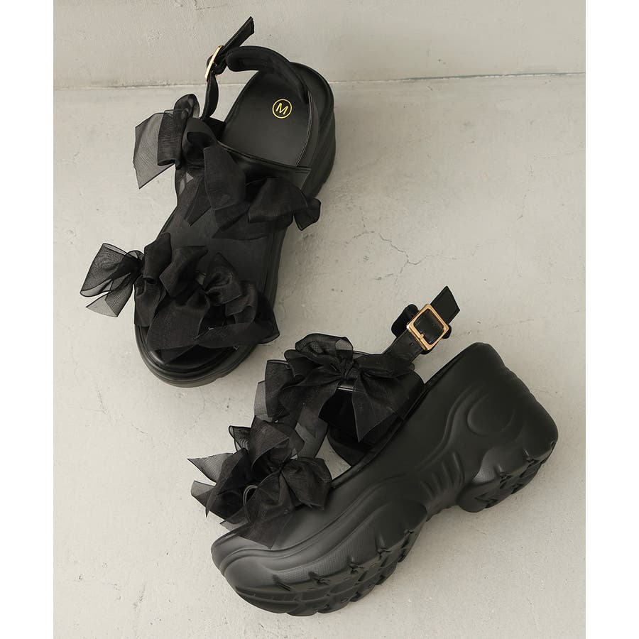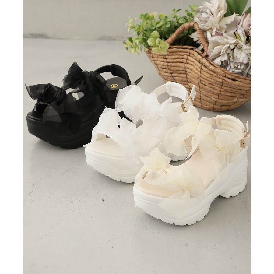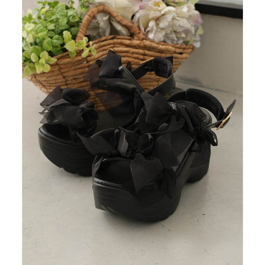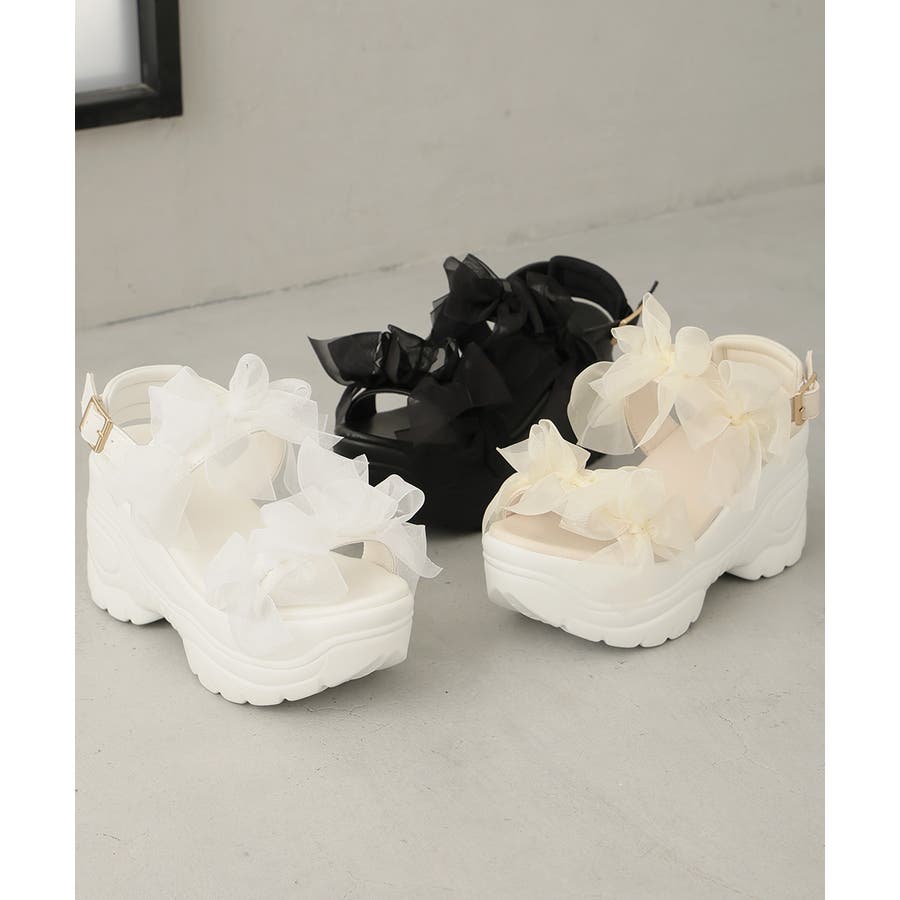 甘さと存在感を両立♪チュールリボンが愛らしい、厚底スポーツサンダル!!