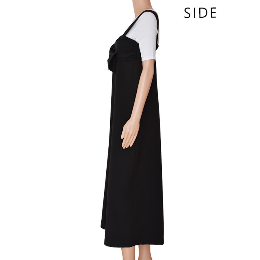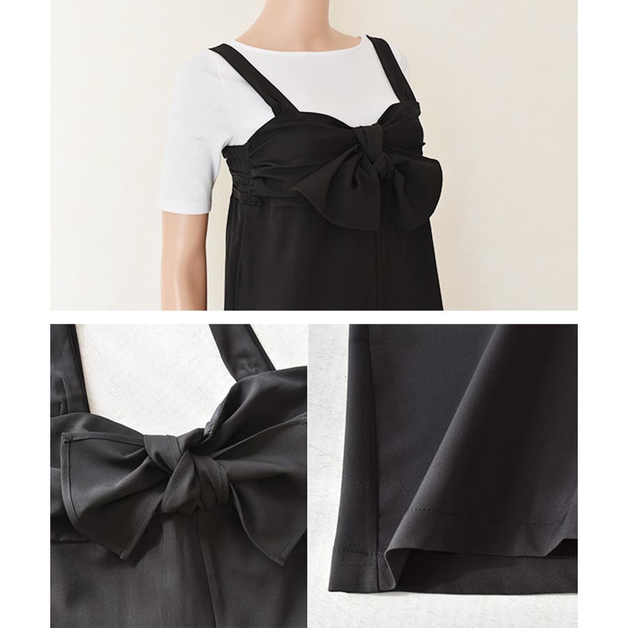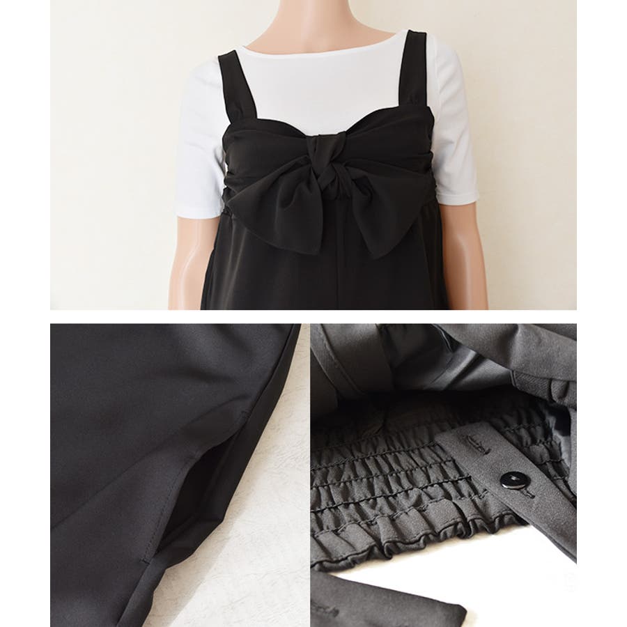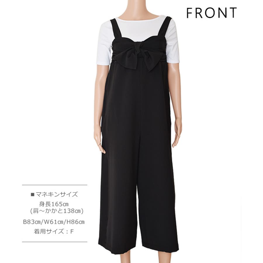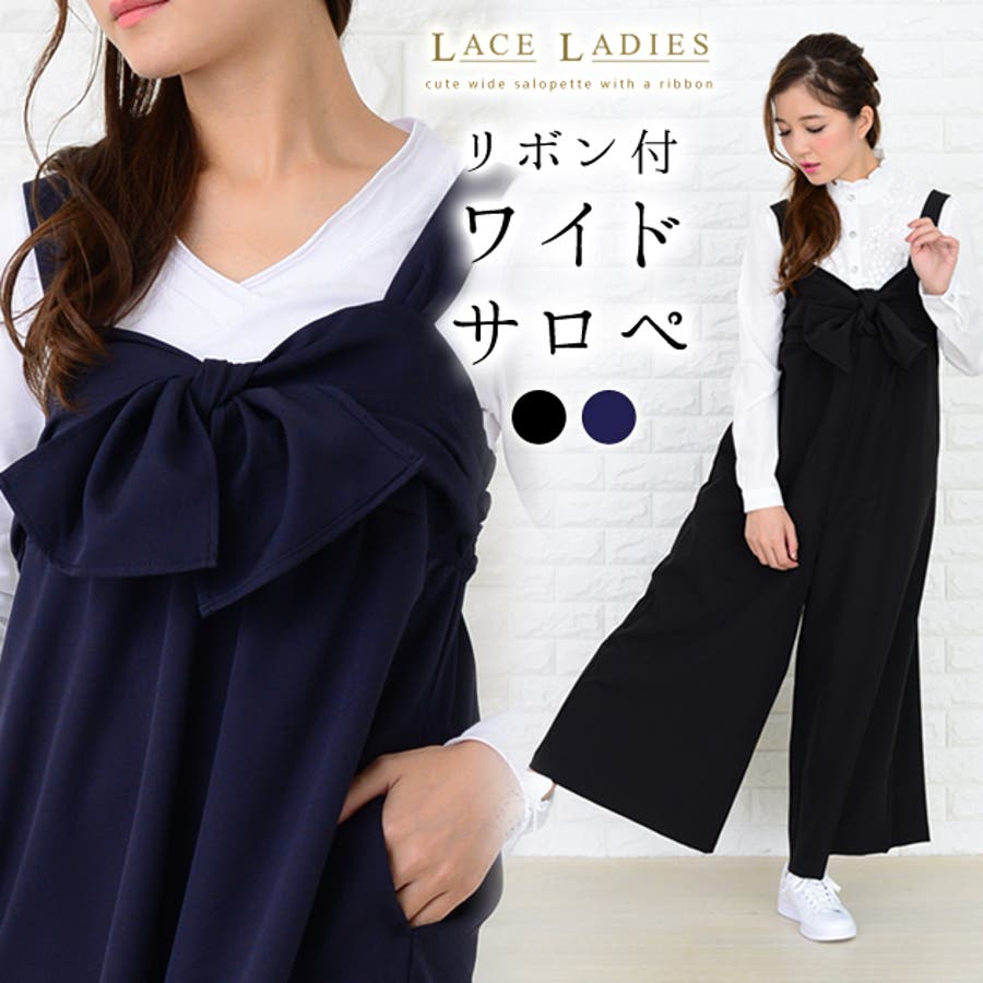 胸元にある大きなリボンが可愛い、ガーリーなワイドサロペットです。