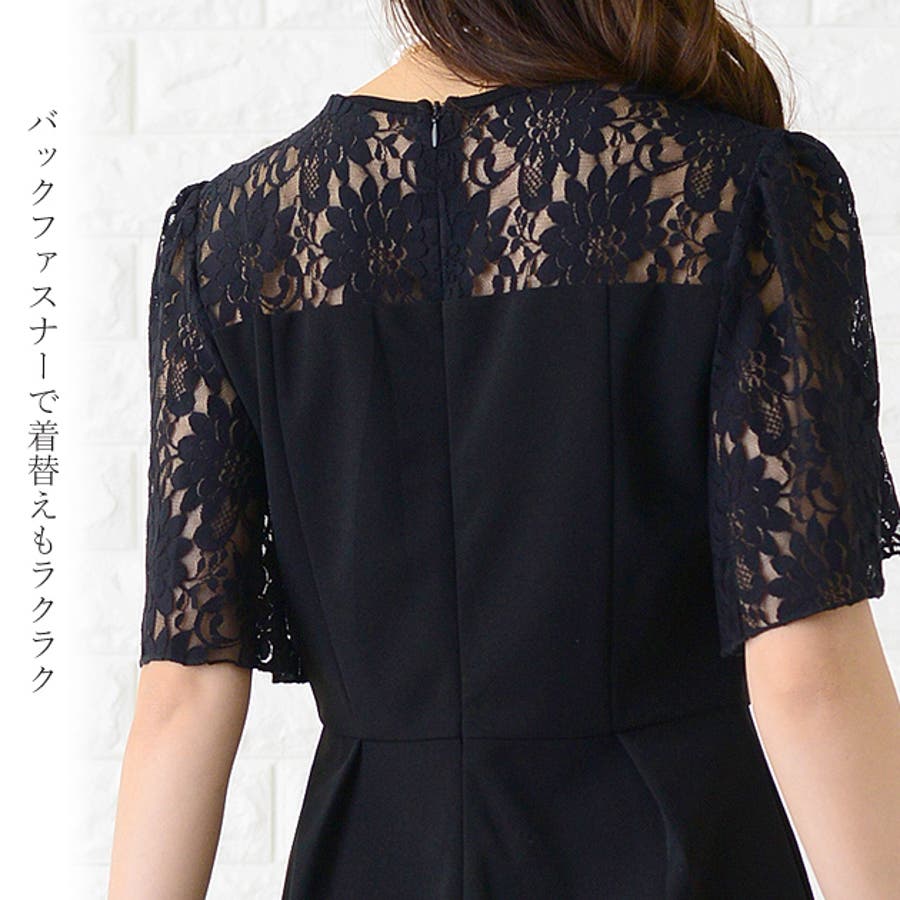 デコルテ・袖の透け感のあるレースで上品な印象のパーティードレス