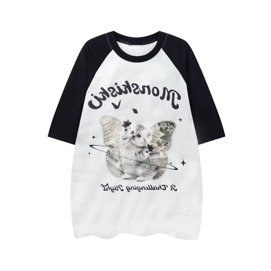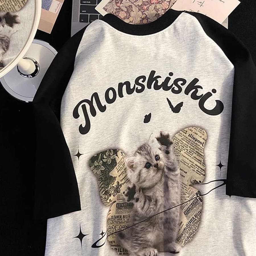 ・主張しすぎない猫モチーフのデザインとロゴプリントが、絶妙な可愛さでコーデに取り入れやすく、またボディがラグランの仕様なので着やすいのもポイント◎