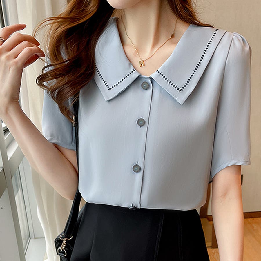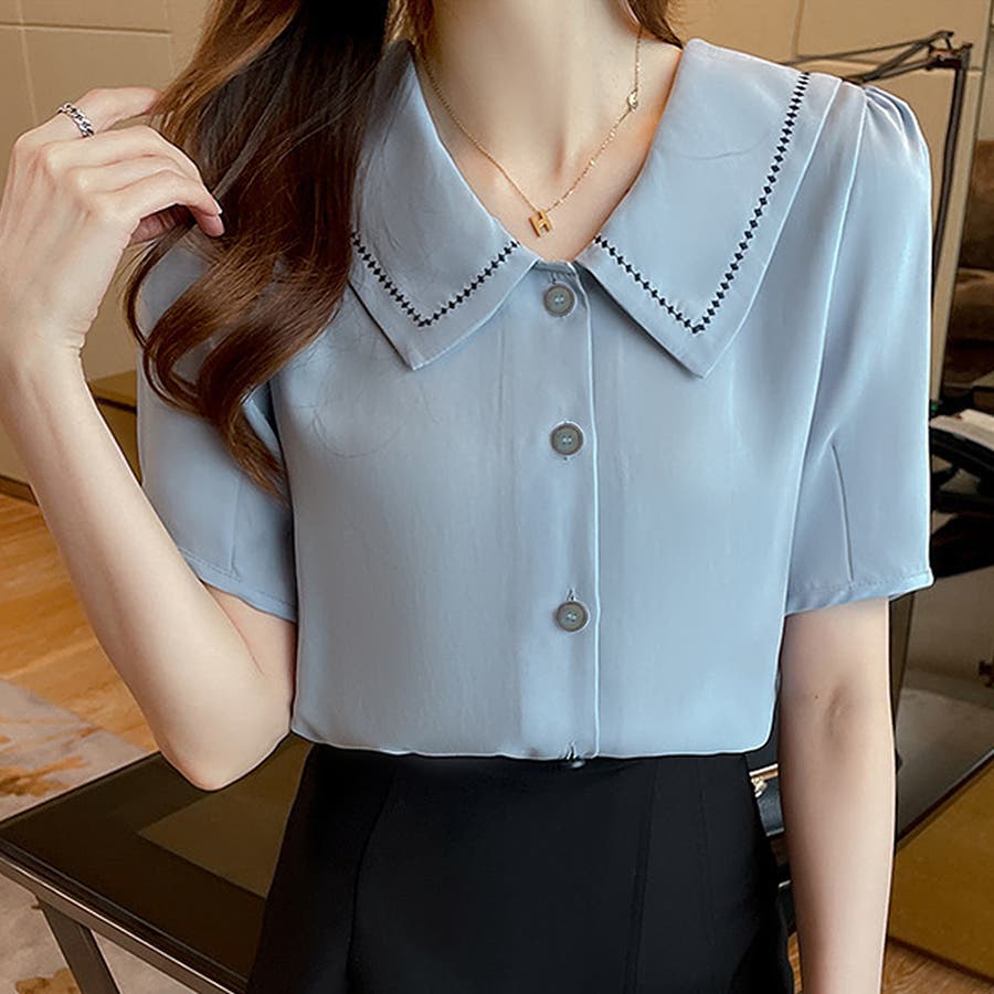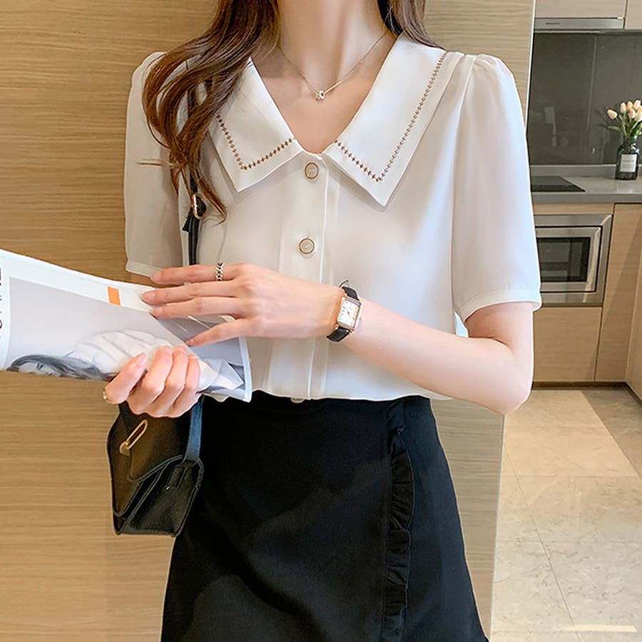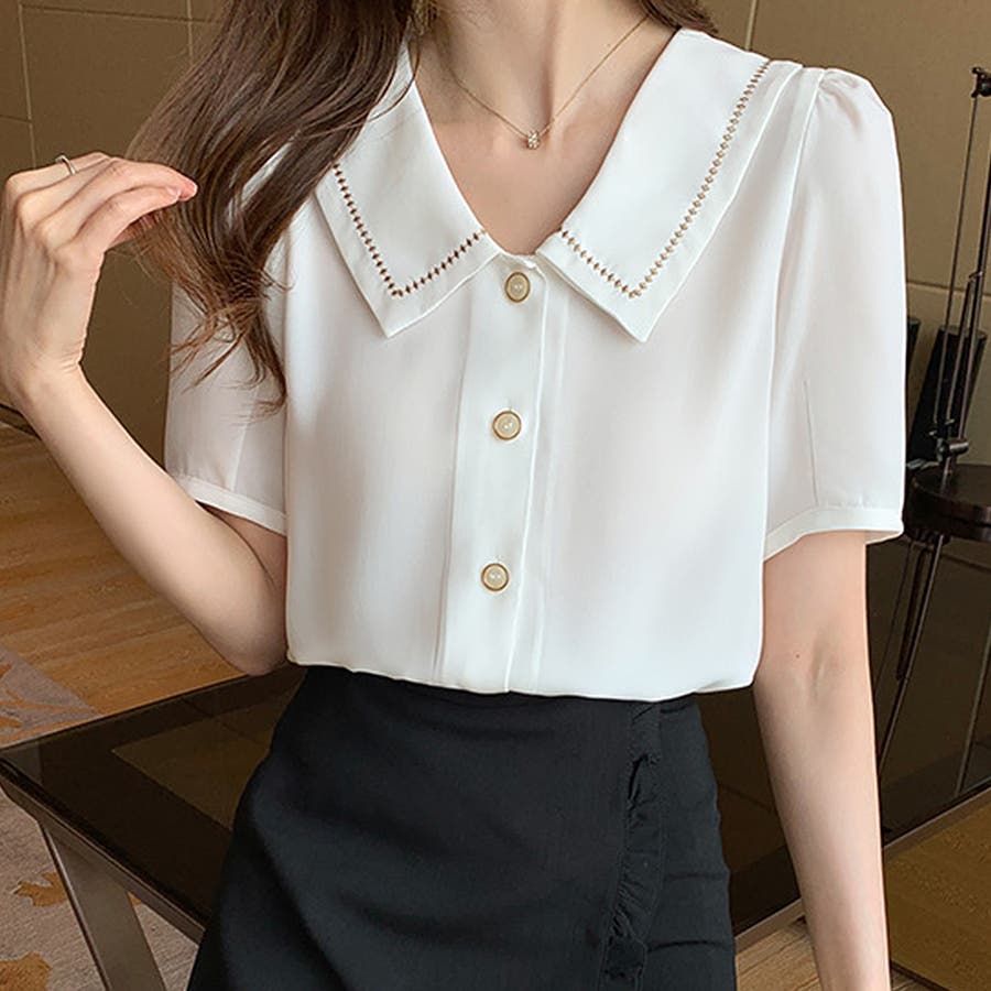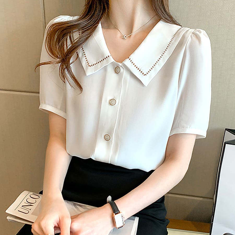 ・インパクトのある襟元のデザインが目を引くショートスリーブシャツ。