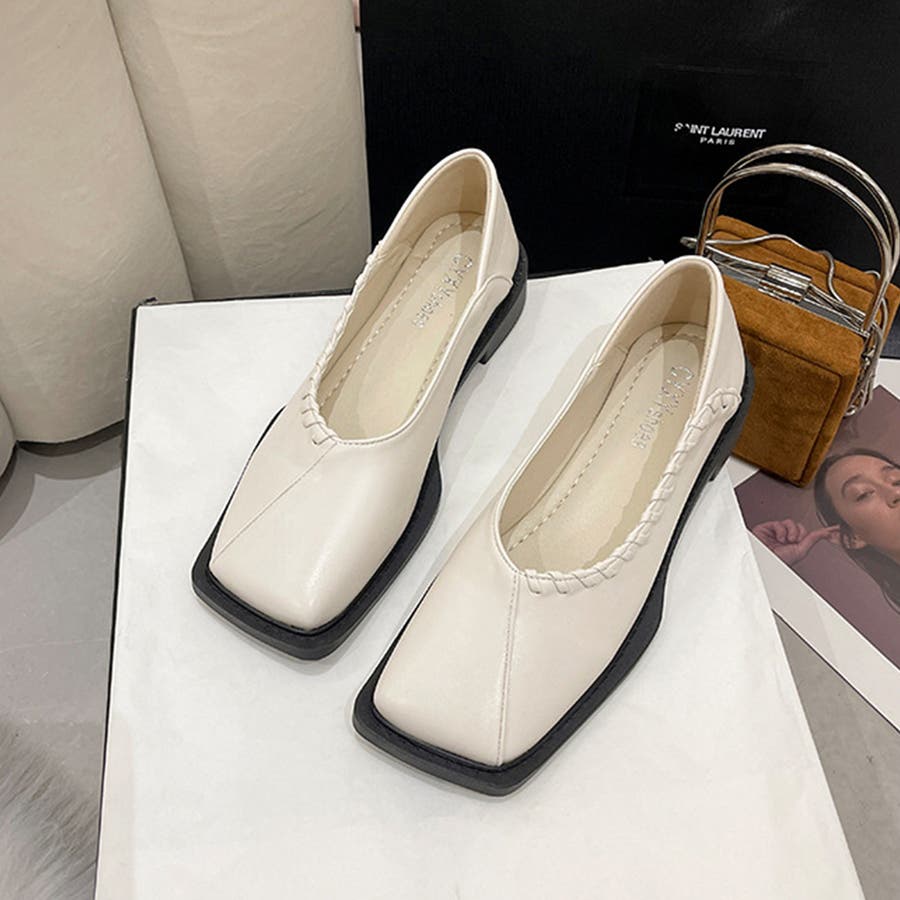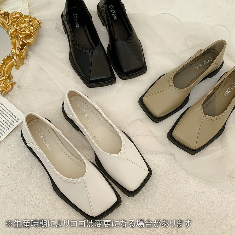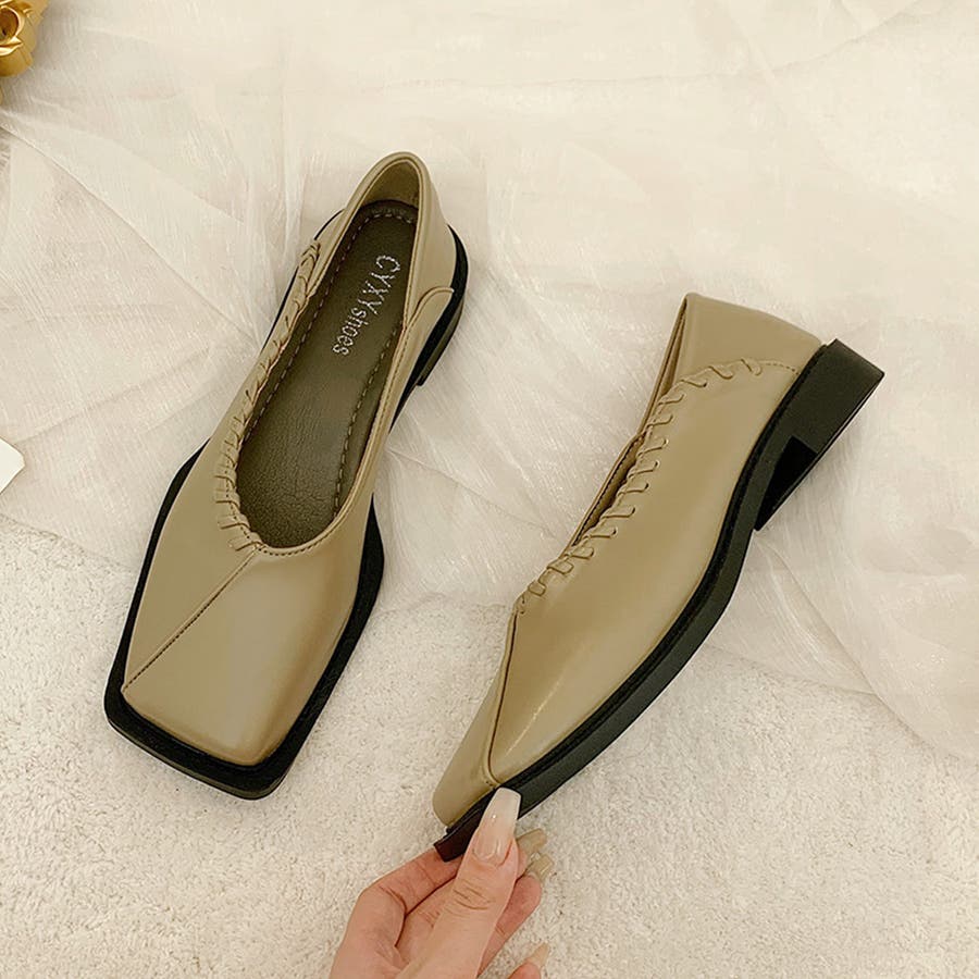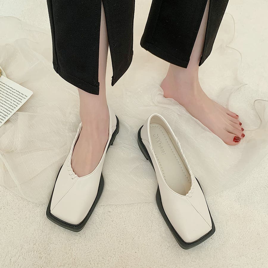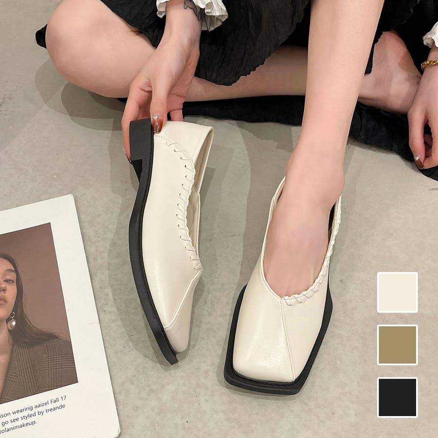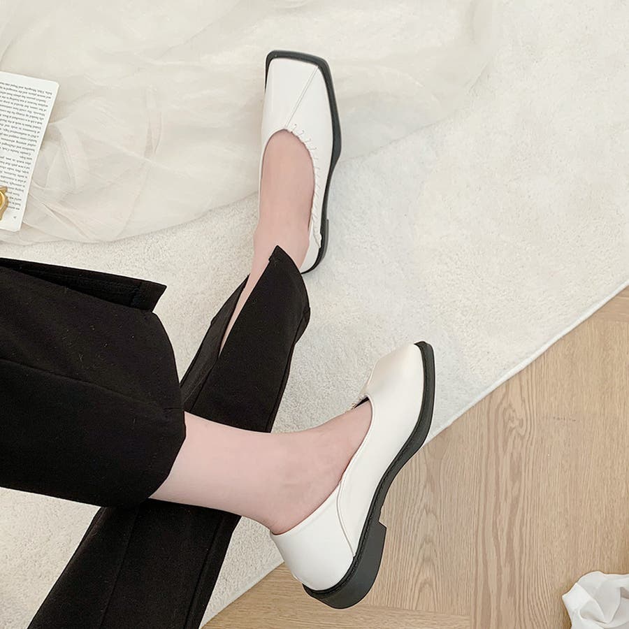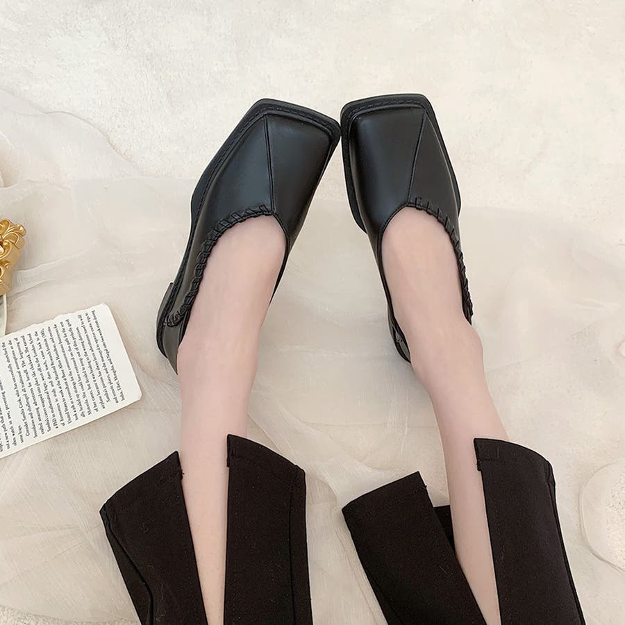 ・シンプルなのにさりげないトレンド感を感じさせるスクエアトゥ!長時間履いても疲れにくいローヒールなのも◎