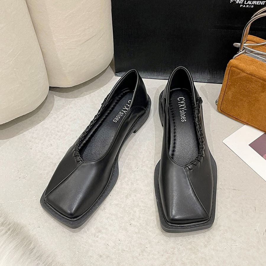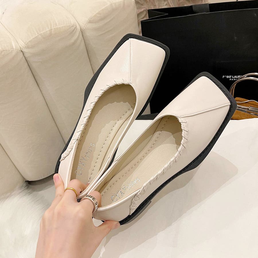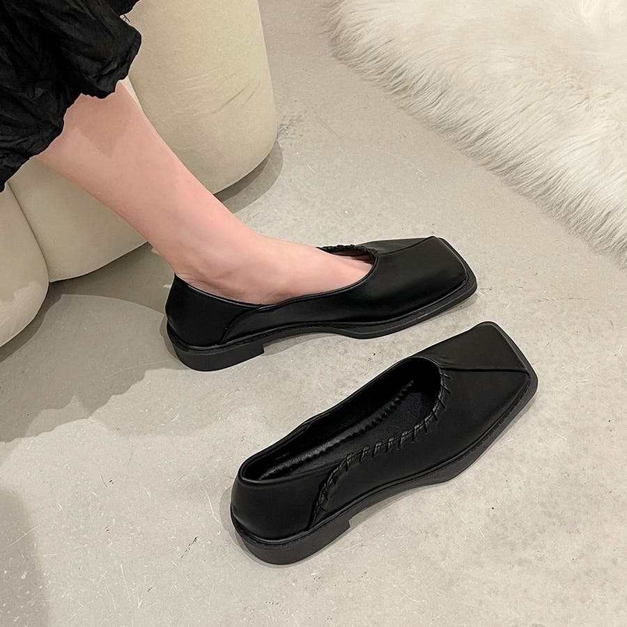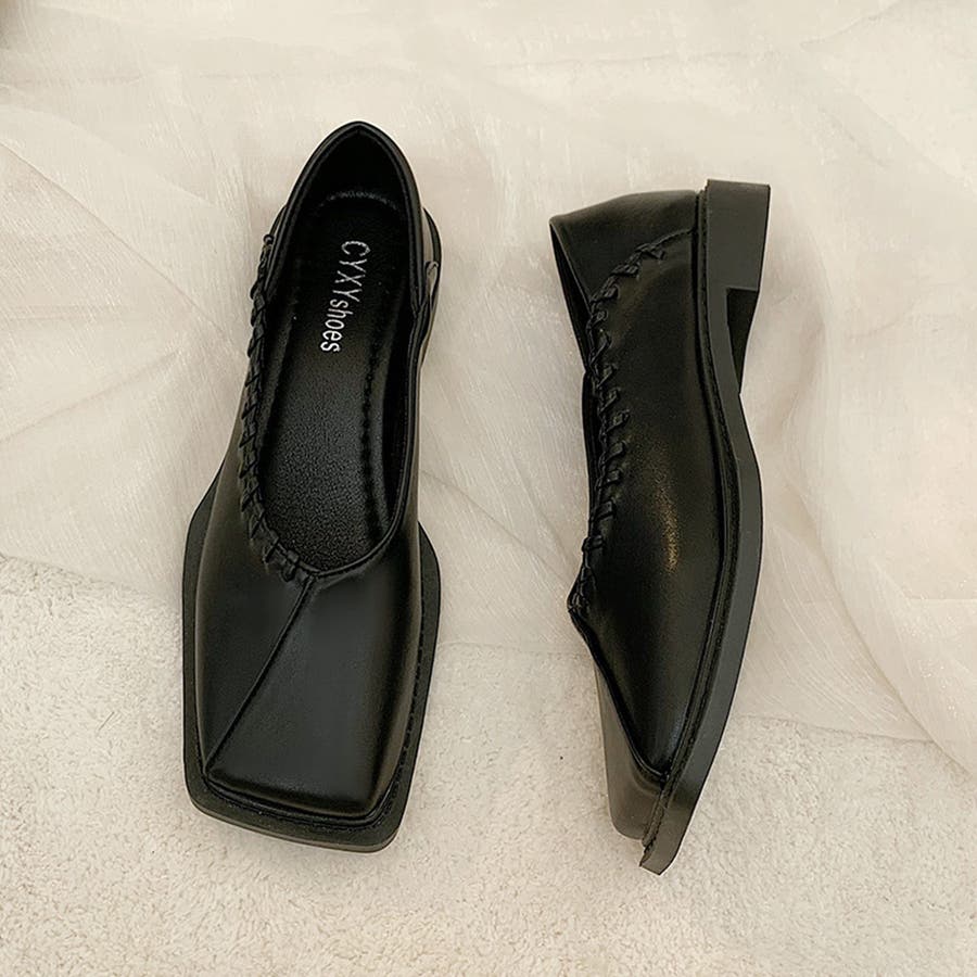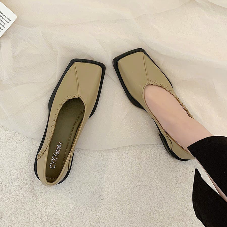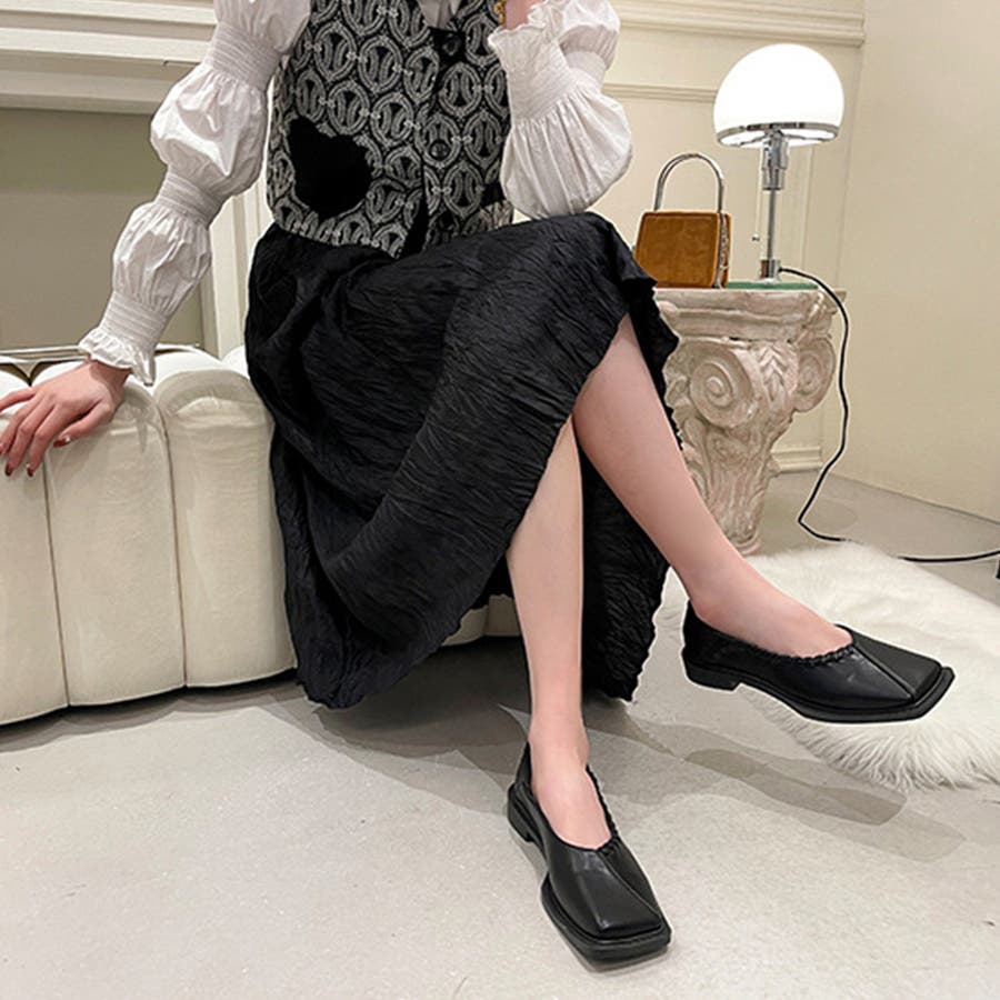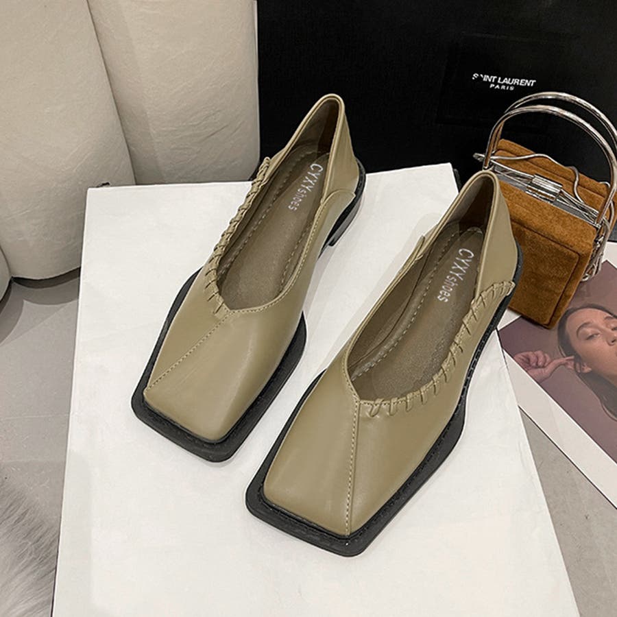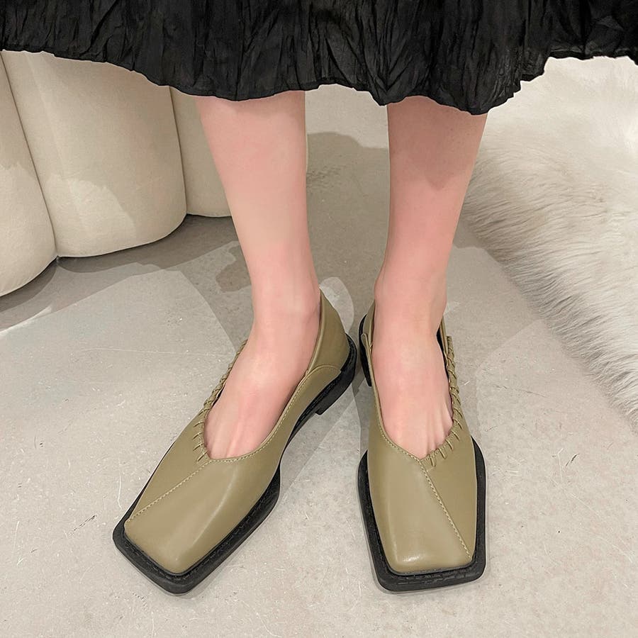 ・シンプルなのにさりげないトレンド感を感じさせるスクエアトゥ!長時間履いても疲れにくいローヒールなのも◎