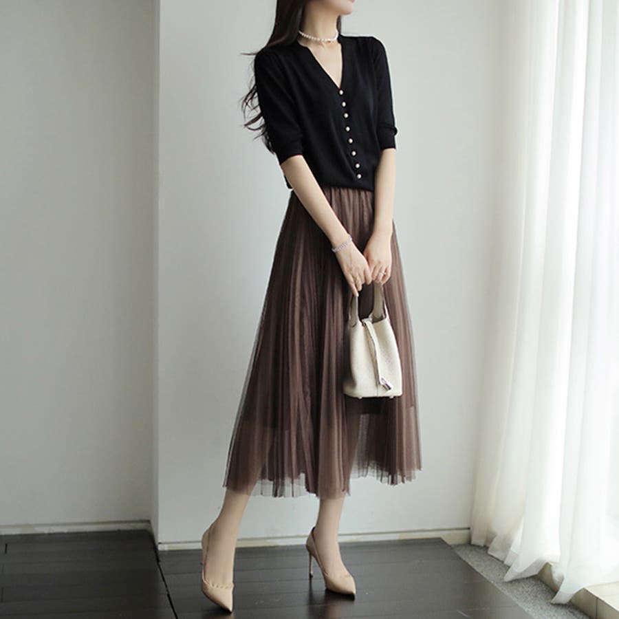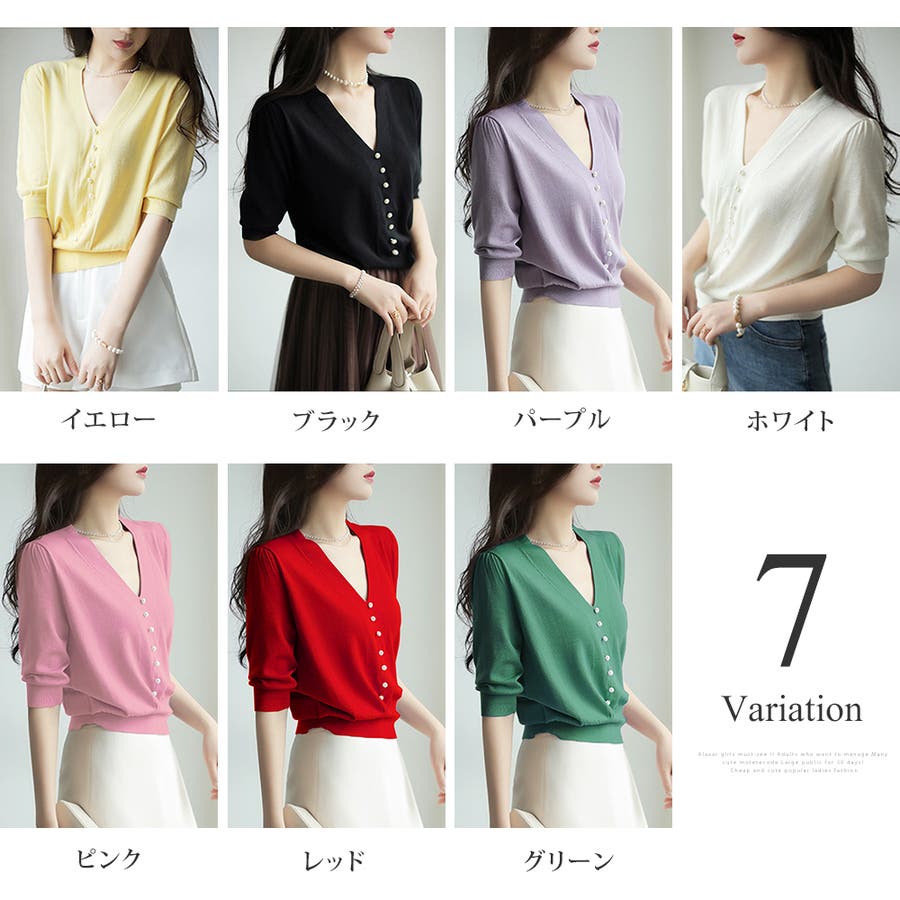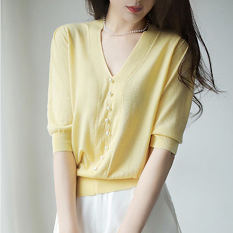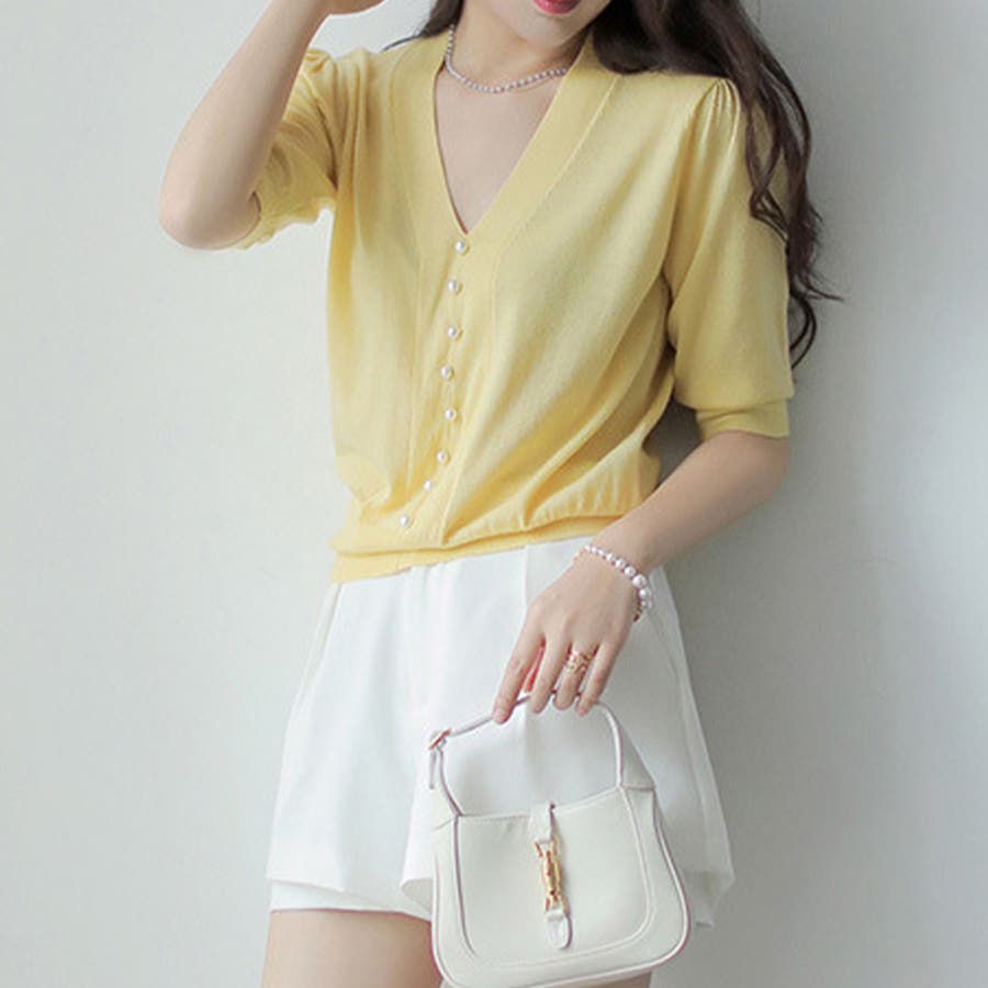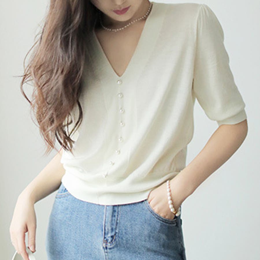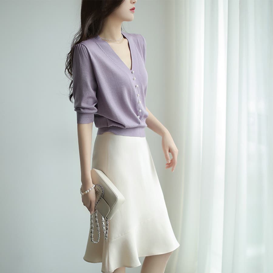 ・深めのVネックが首元を細長く見せてくれる。大人女子の雰囲気もプラス。全体的にスッキリとしたシルエットのニット!