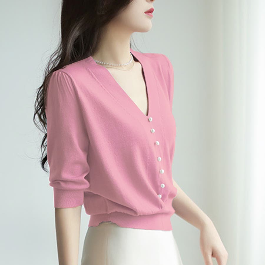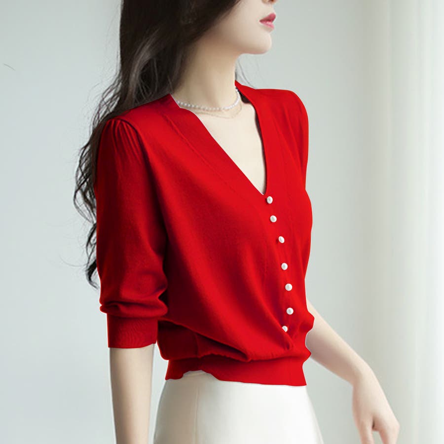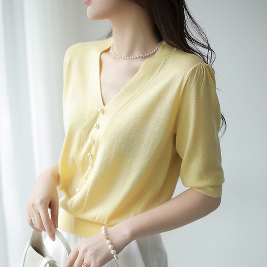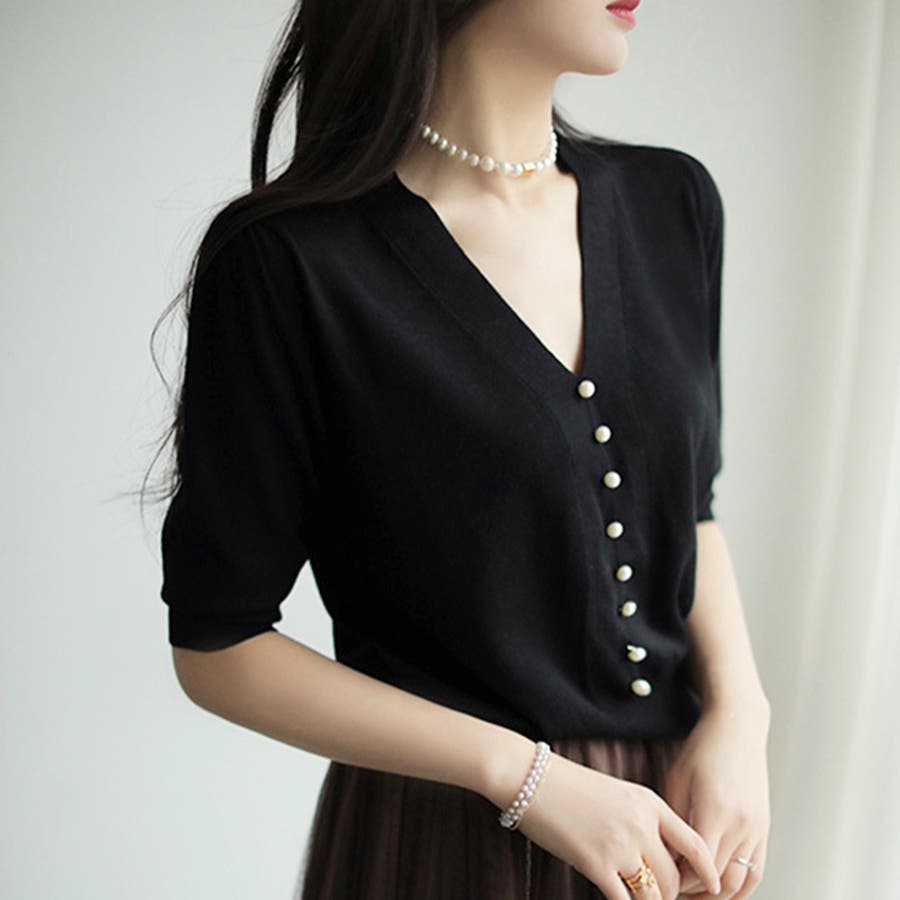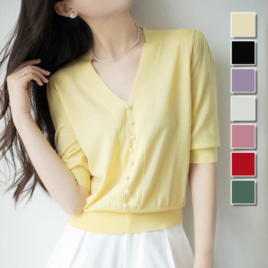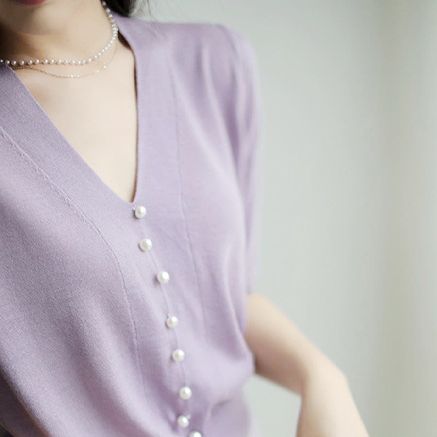 ・深めのVネックが首元を細長く見せてくれる。大人女子の雰囲気もプラス。全体的にスッキリとしたシルエットのニット!