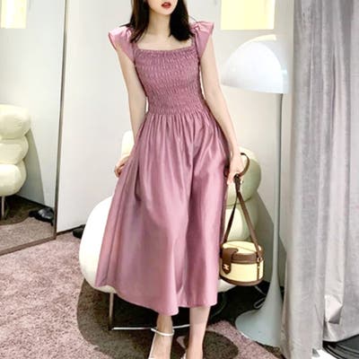 ・シャーリング加工だからウエスト周りをカバーしてくれて、引き締まって見えるデザイン♪