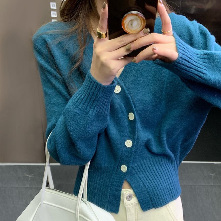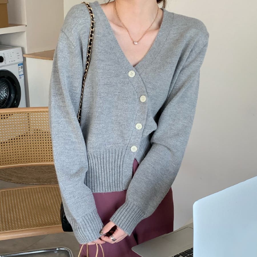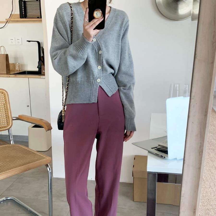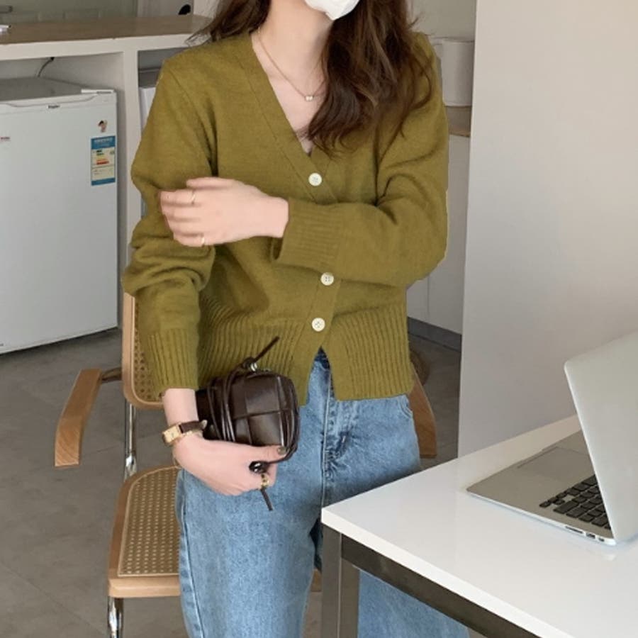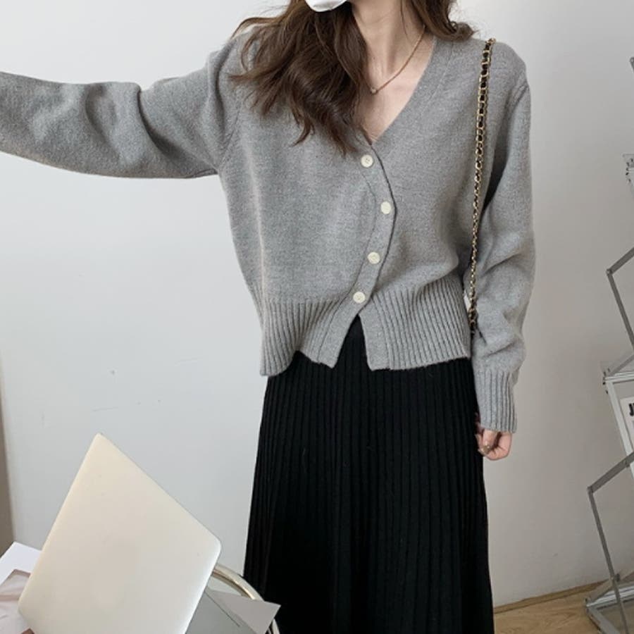 ・トレンドのクロップド丈でボタンを外せばスタイル良く脚長効果も期待できるカーディガン。