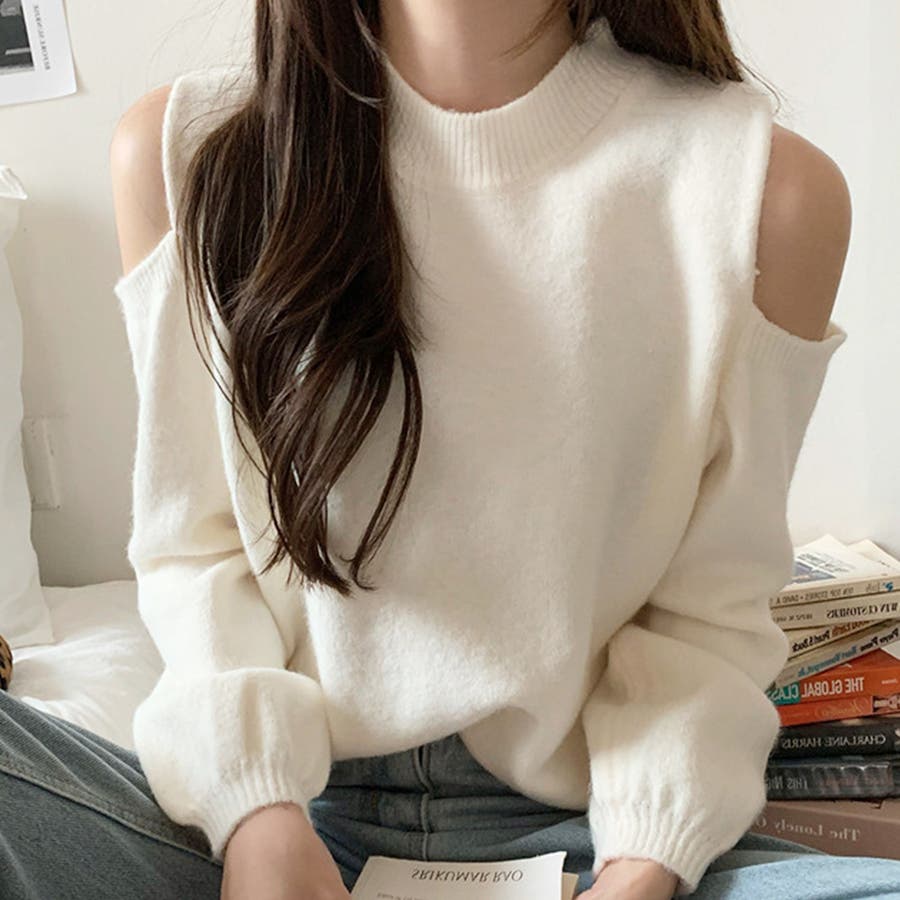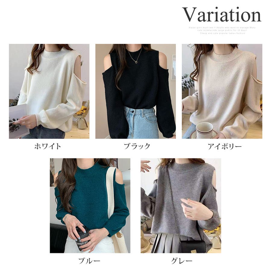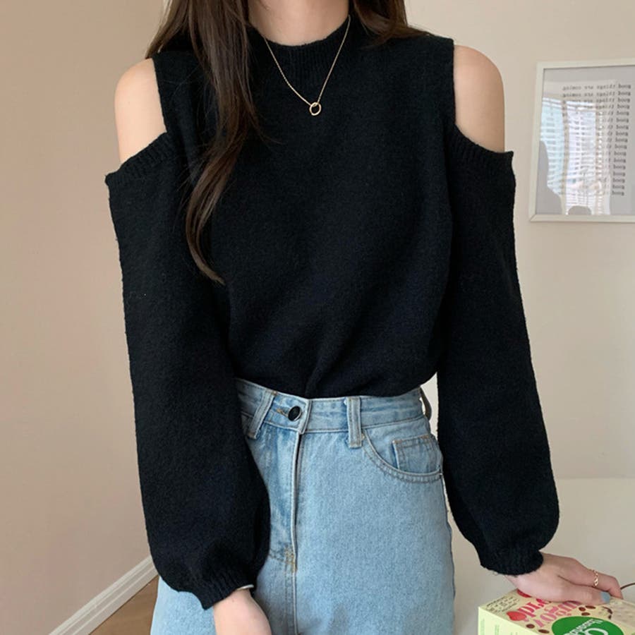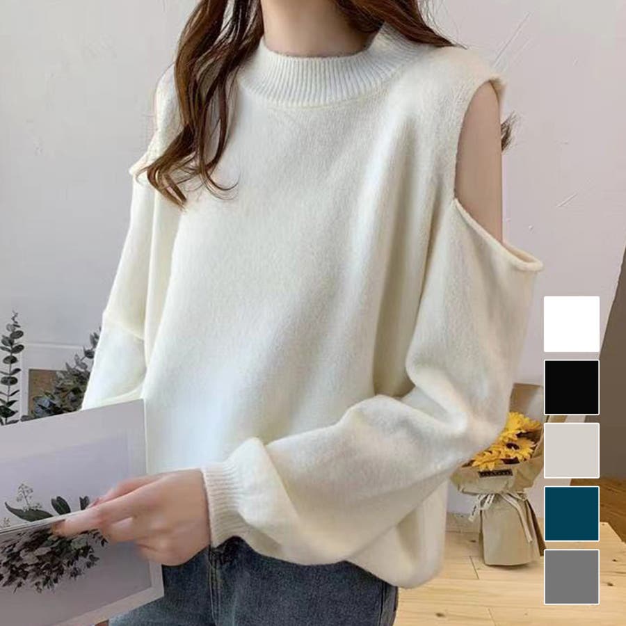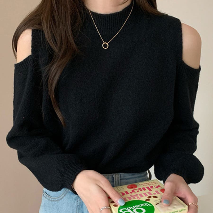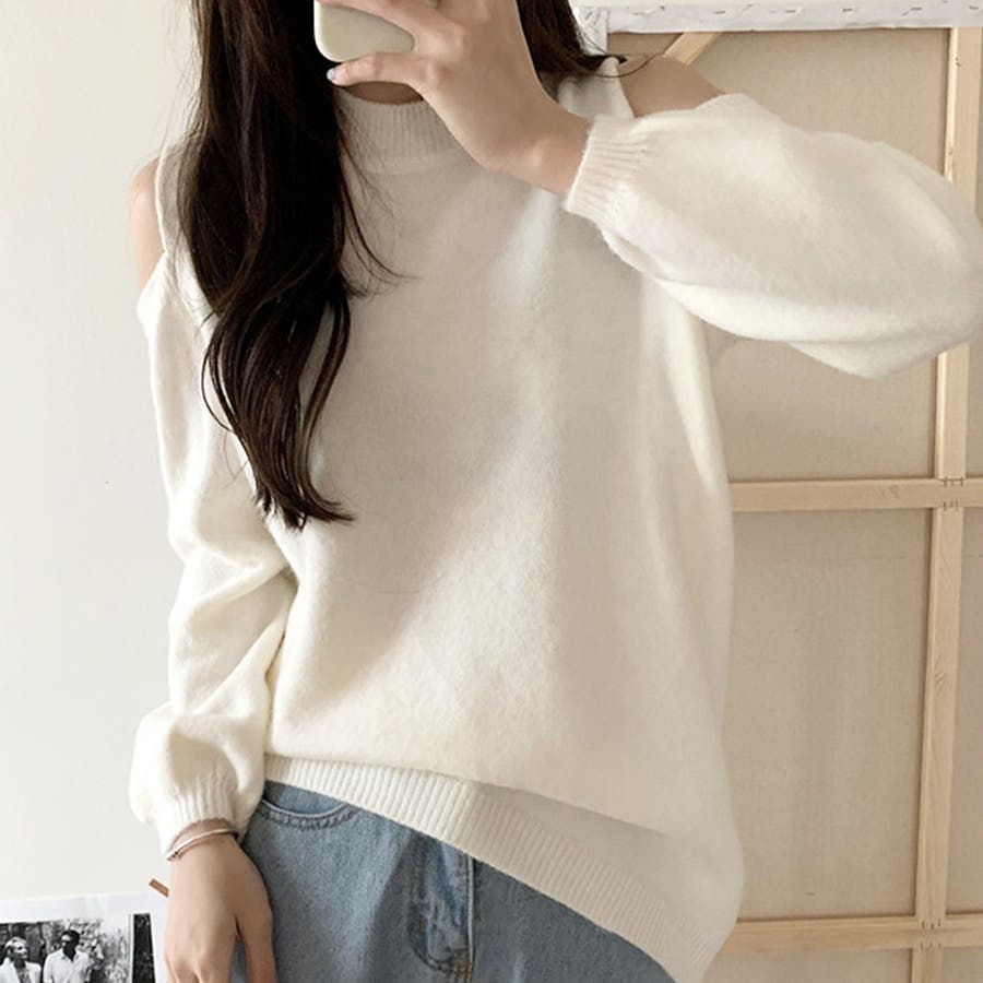 ・切りっぱなしのオープンショルダーが可愛いニット。
