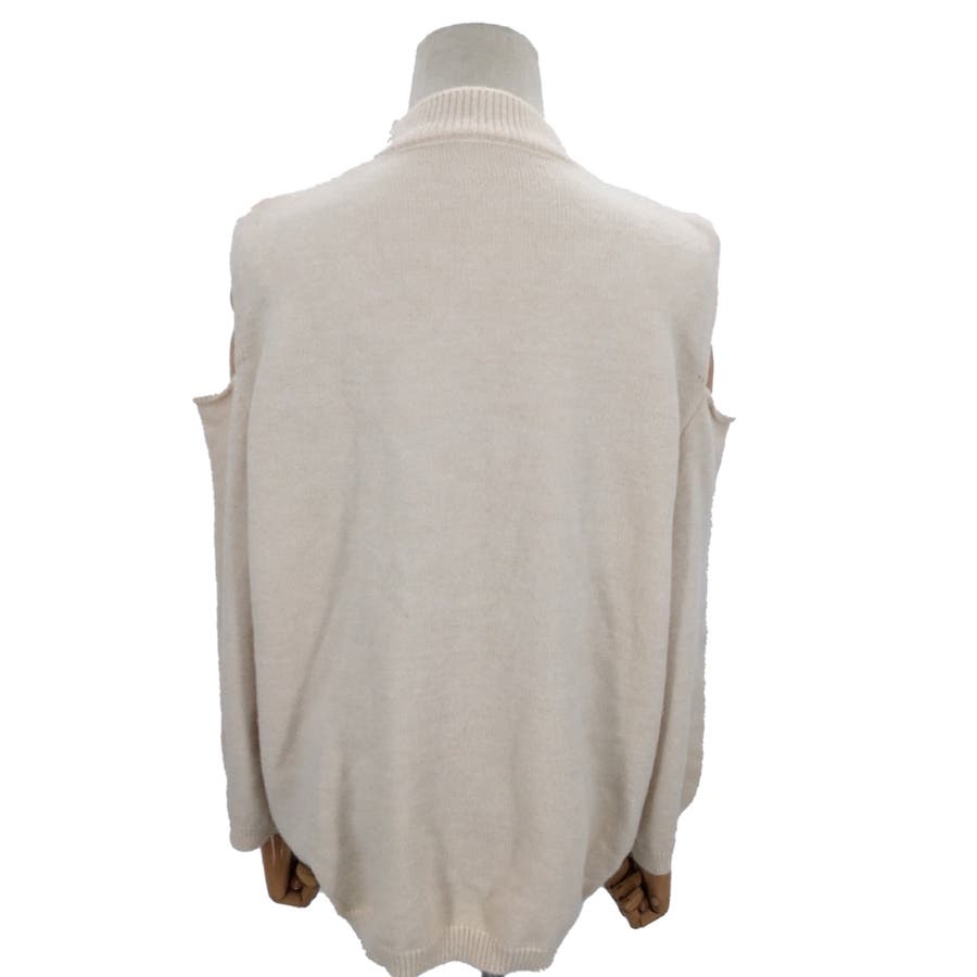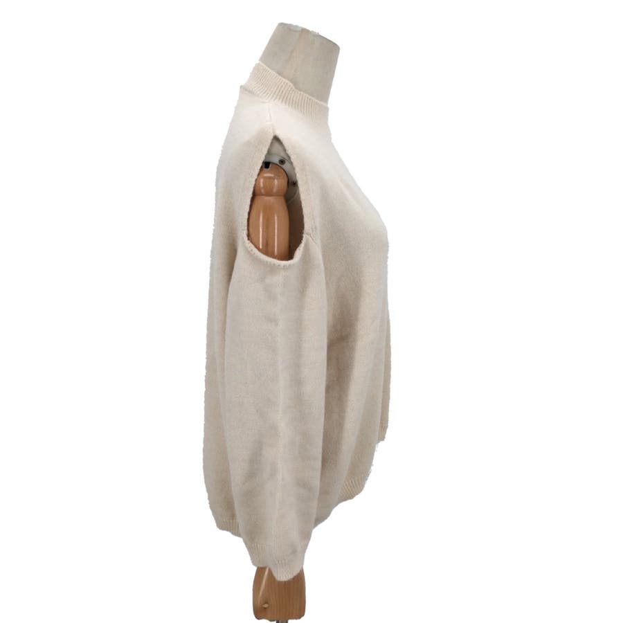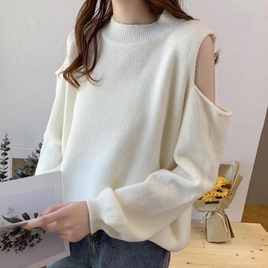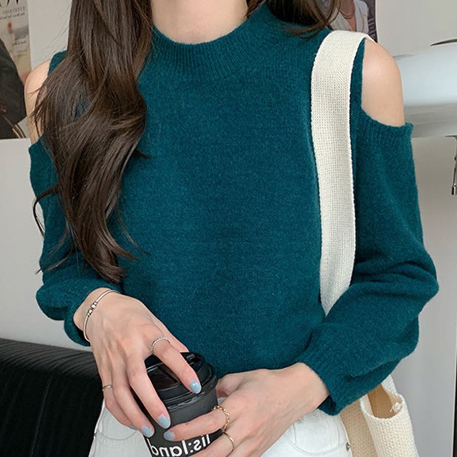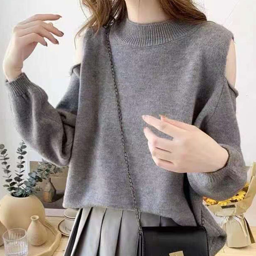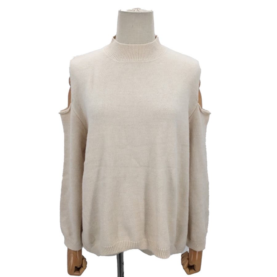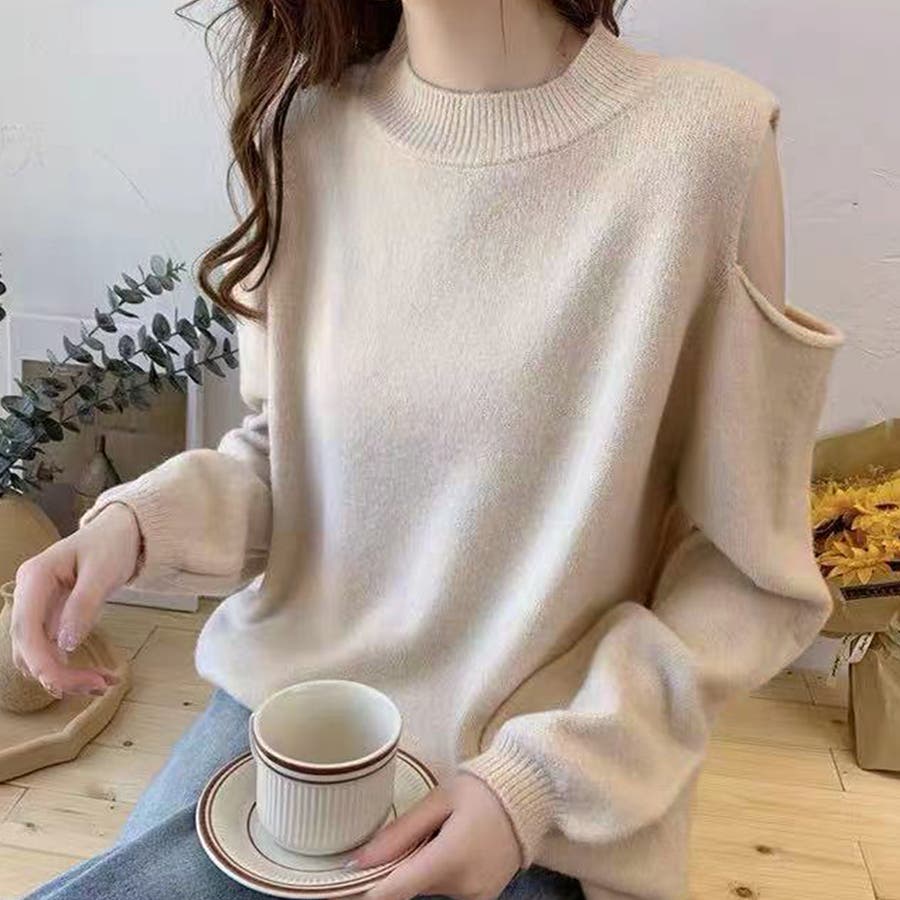 ・切りっぱなしのオープンショルダーが可愛いニット。
