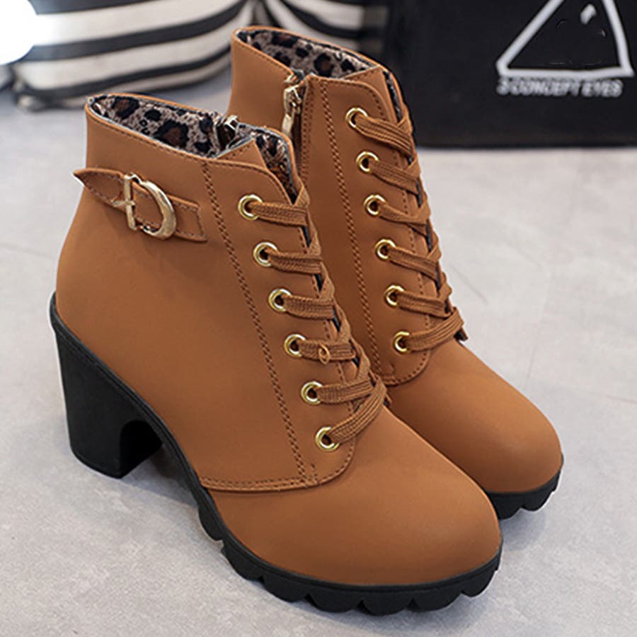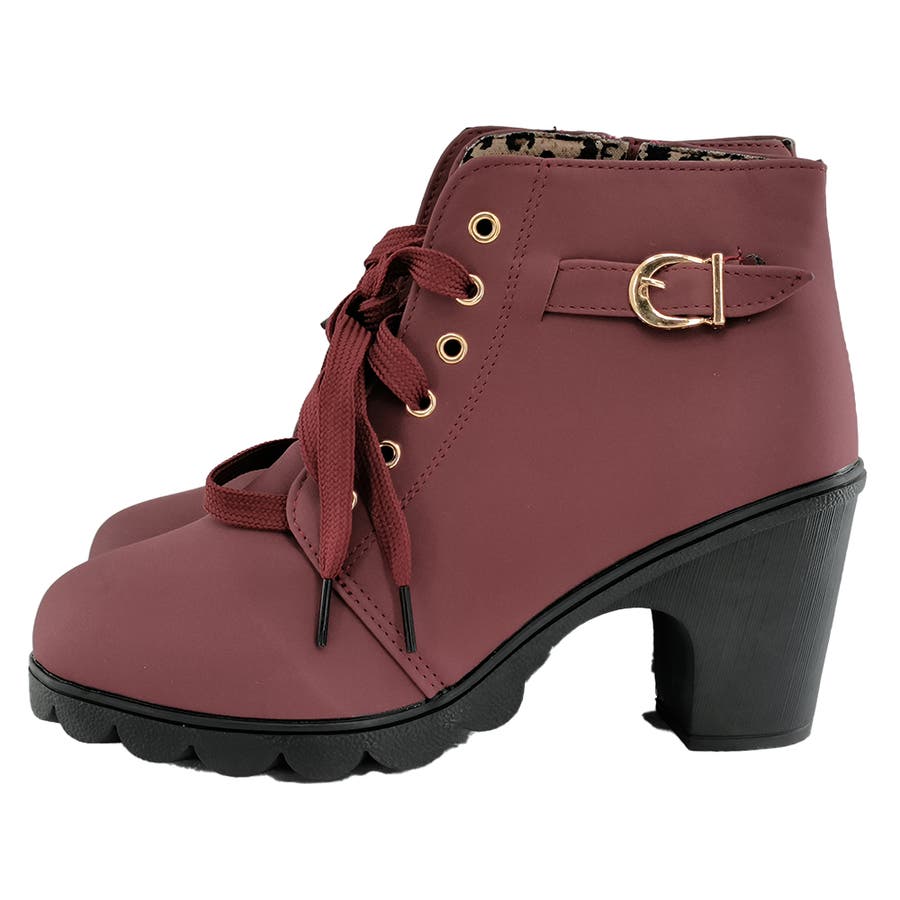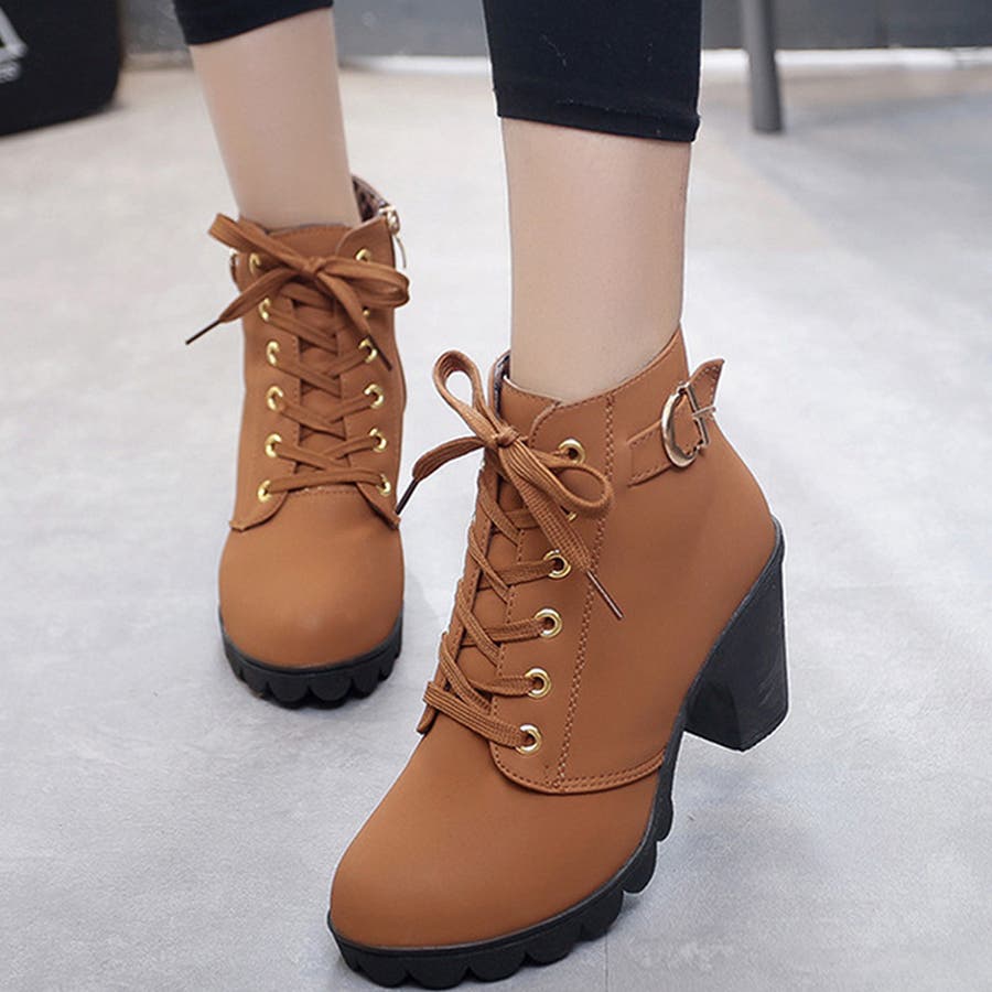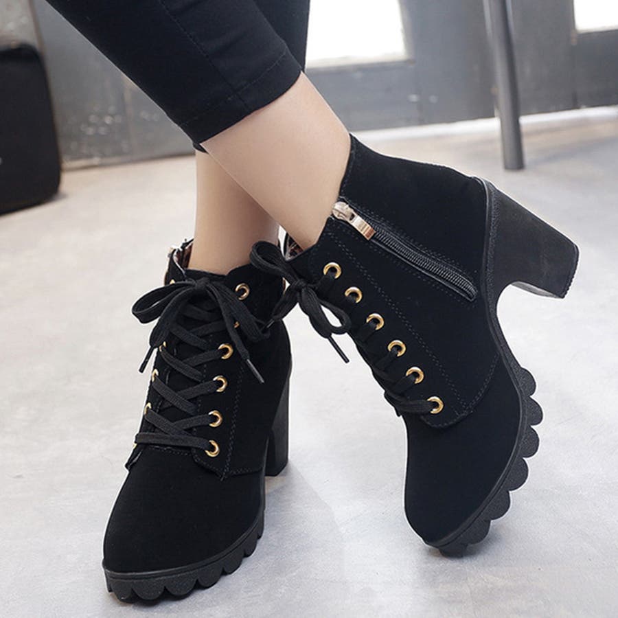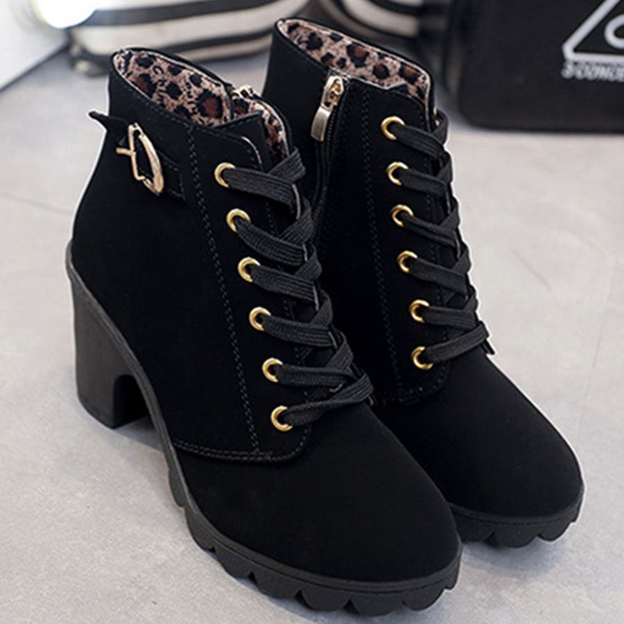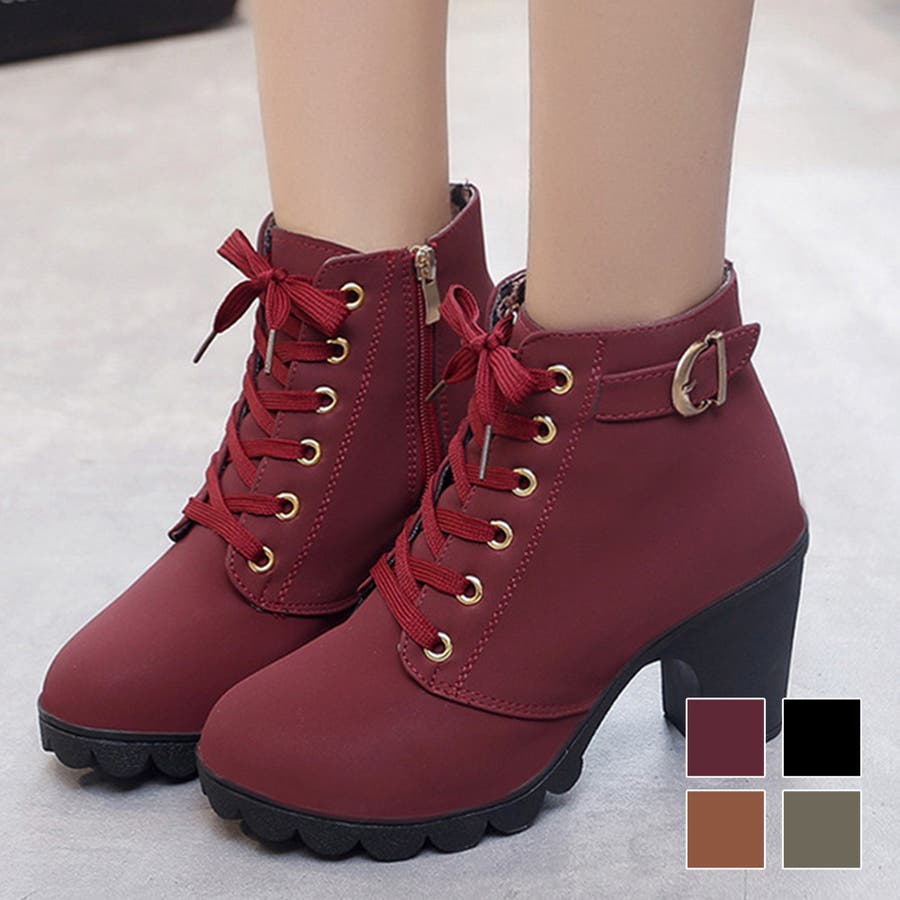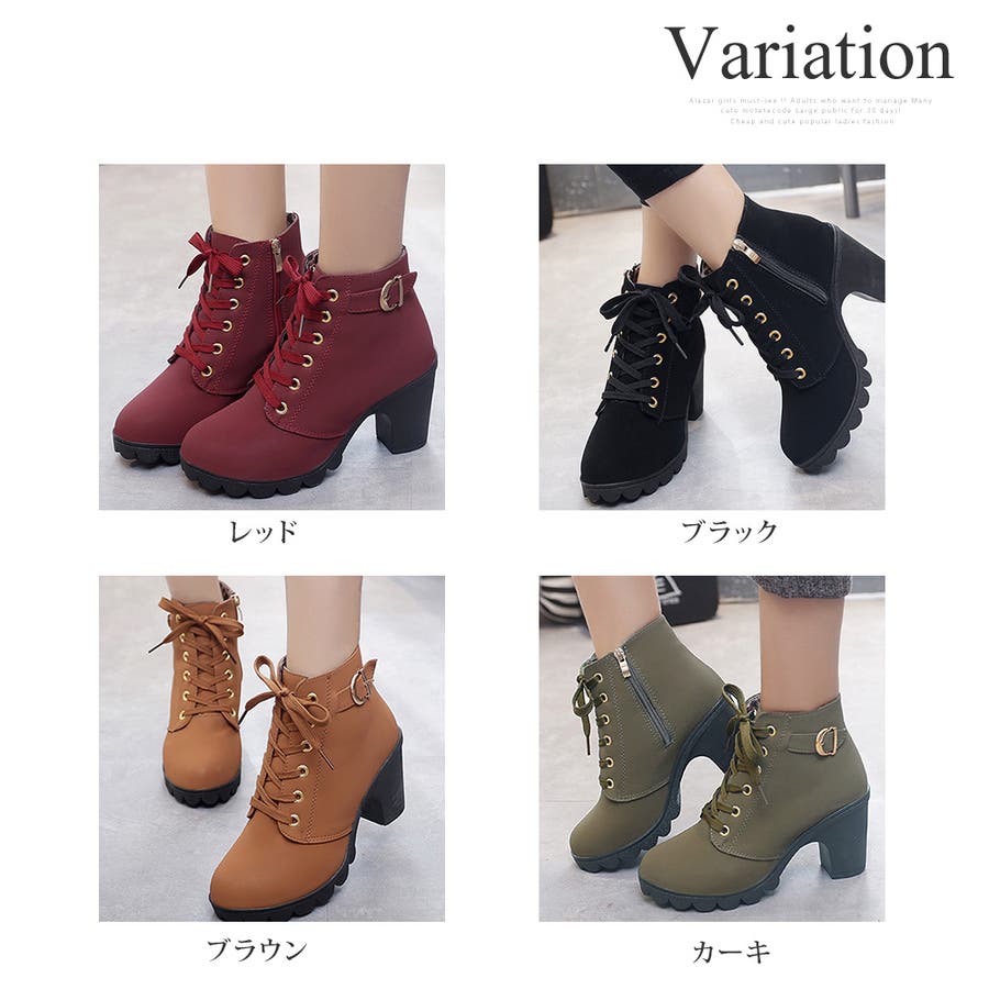 ・安定感抜群の太めヒールが特徴の編み上げショートブーツ。