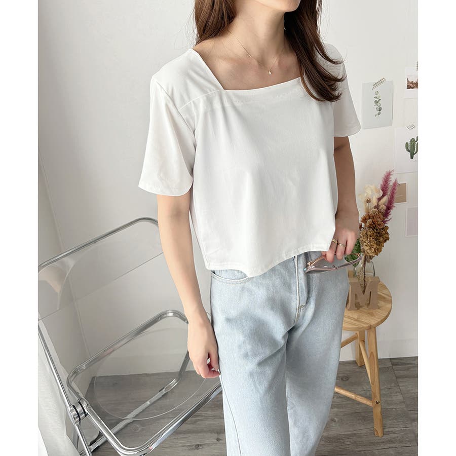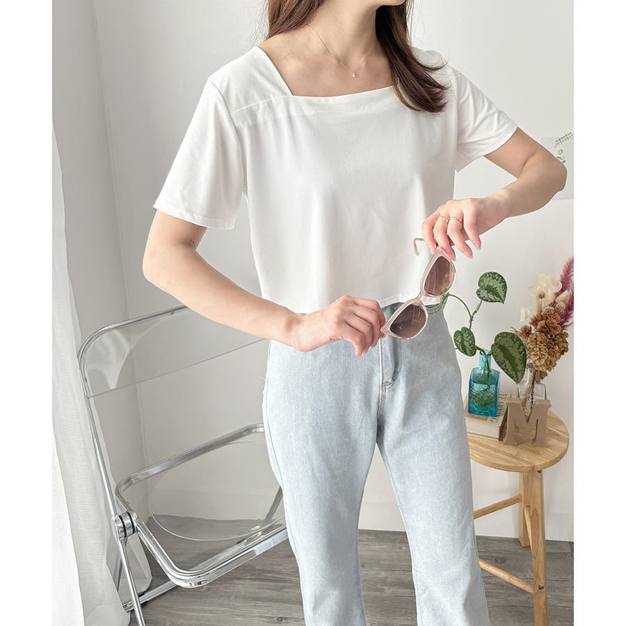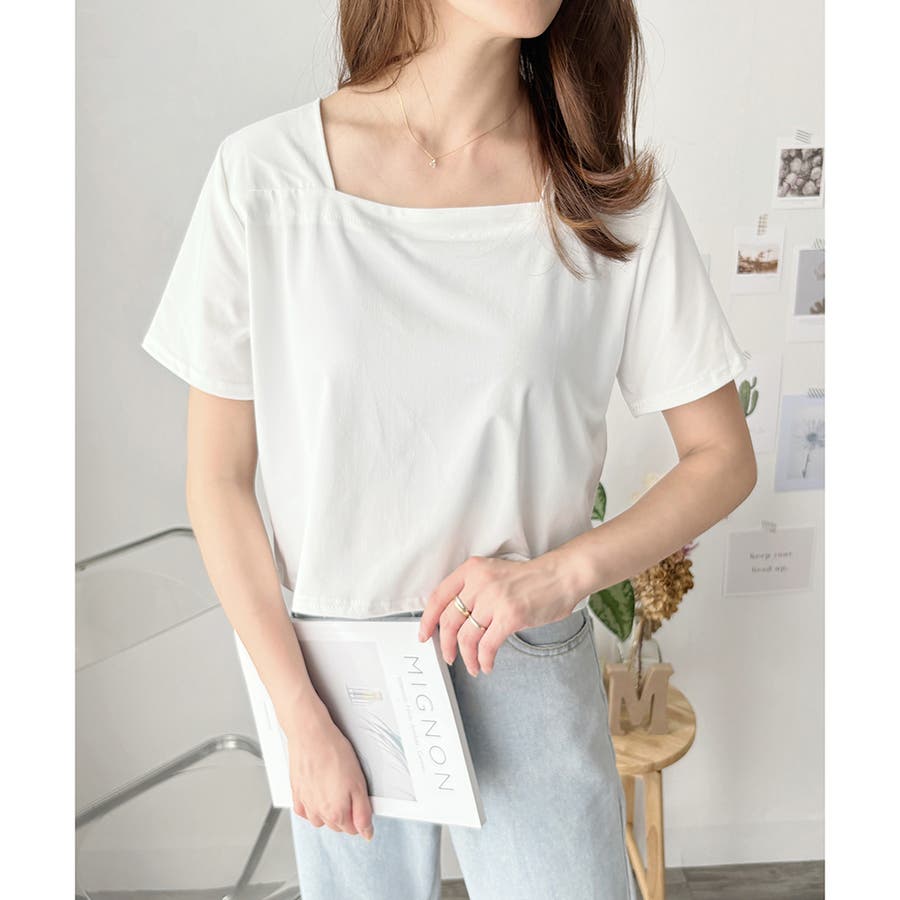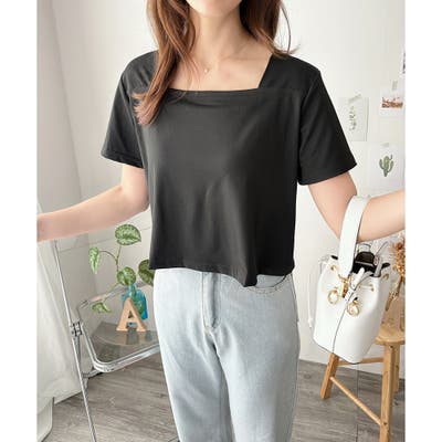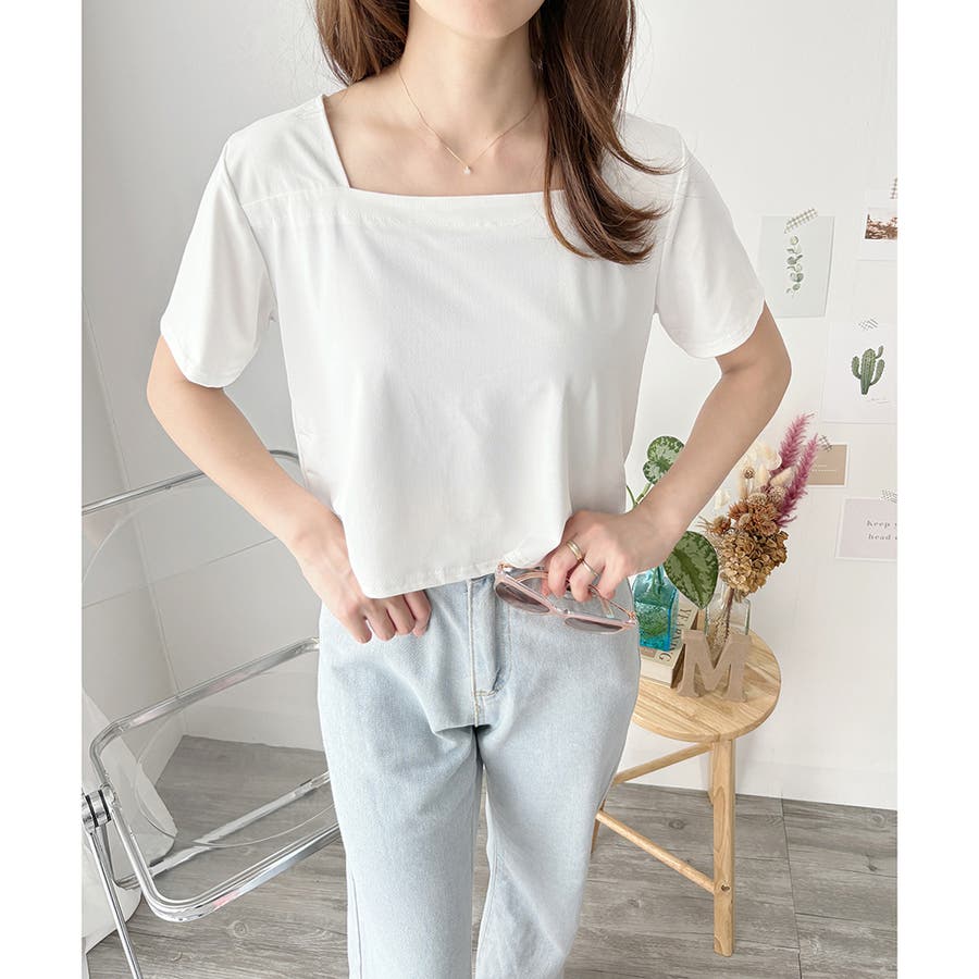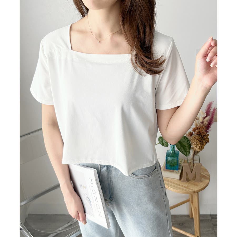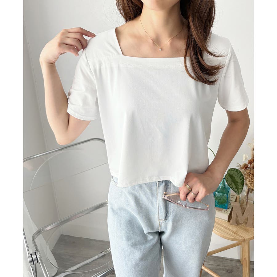 スクエアネックとコンパクトな丈感が、シンプルなのにこなれた印象に。