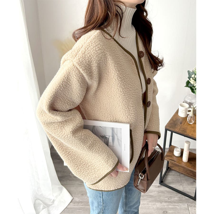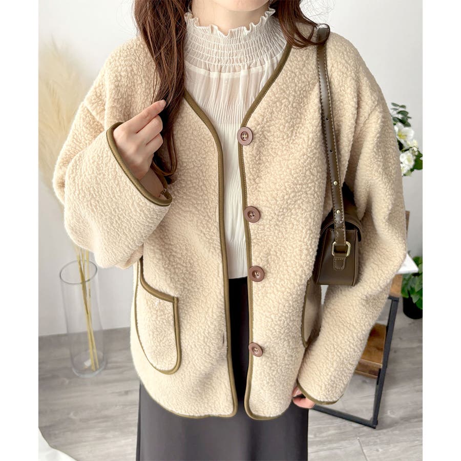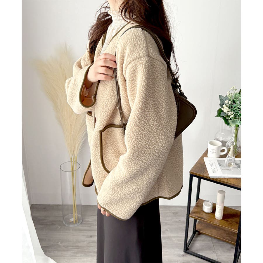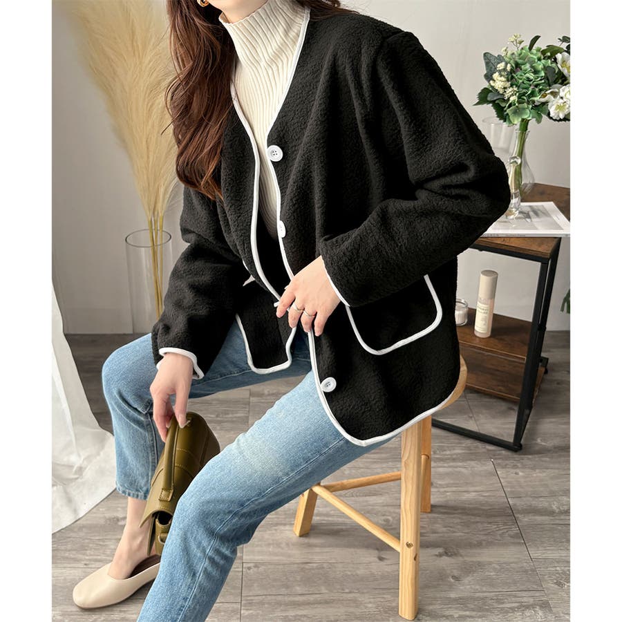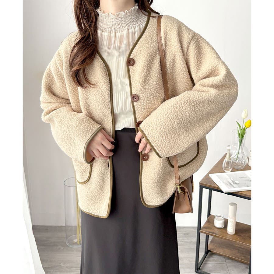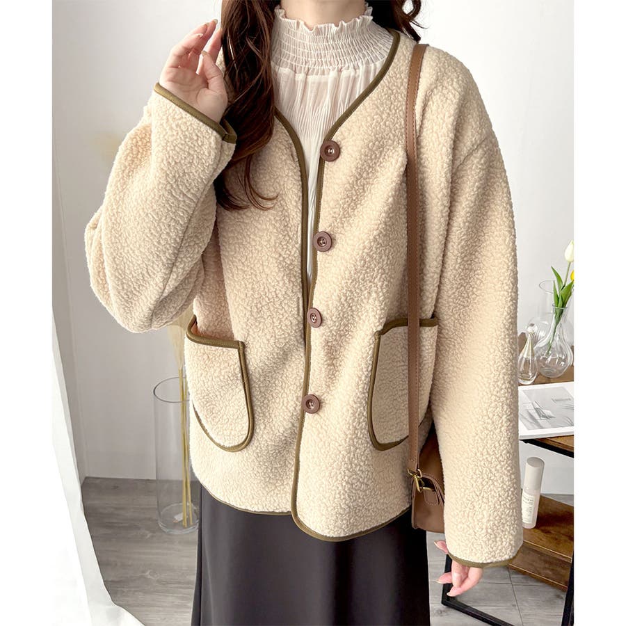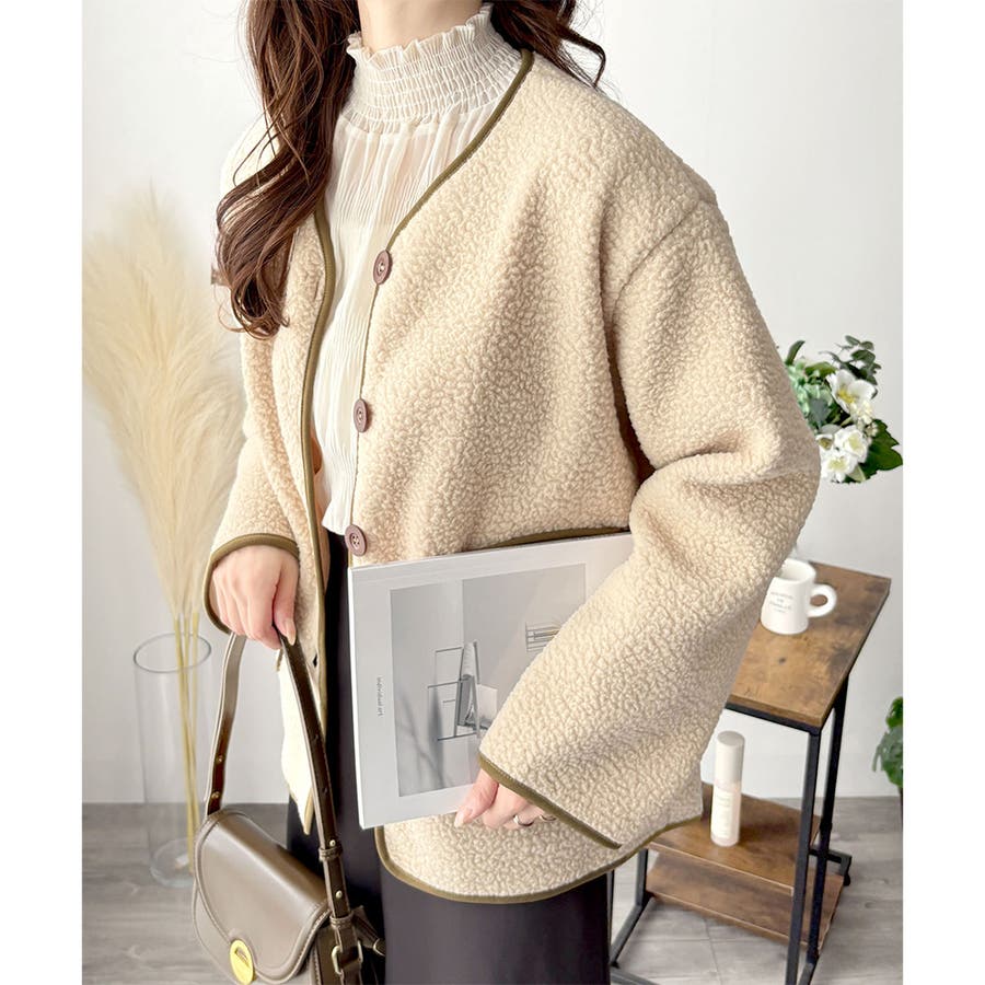 ナチュラルなボア素材に、さりげない配色ラインがアクセントになったアウター◎