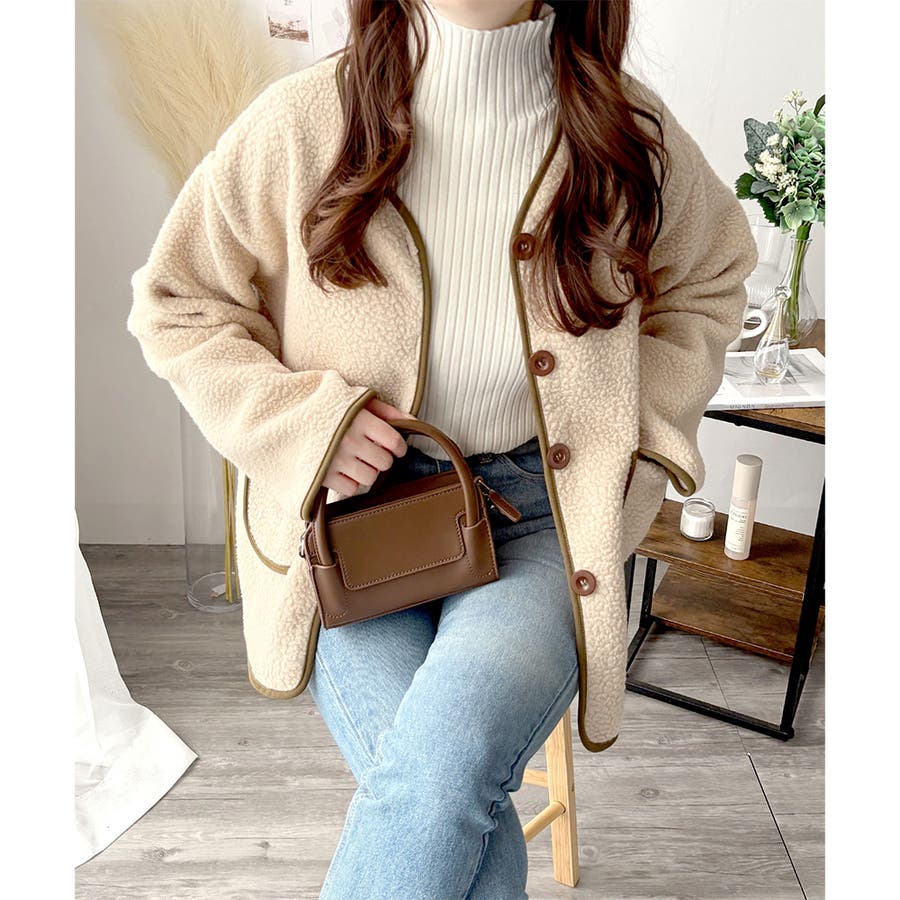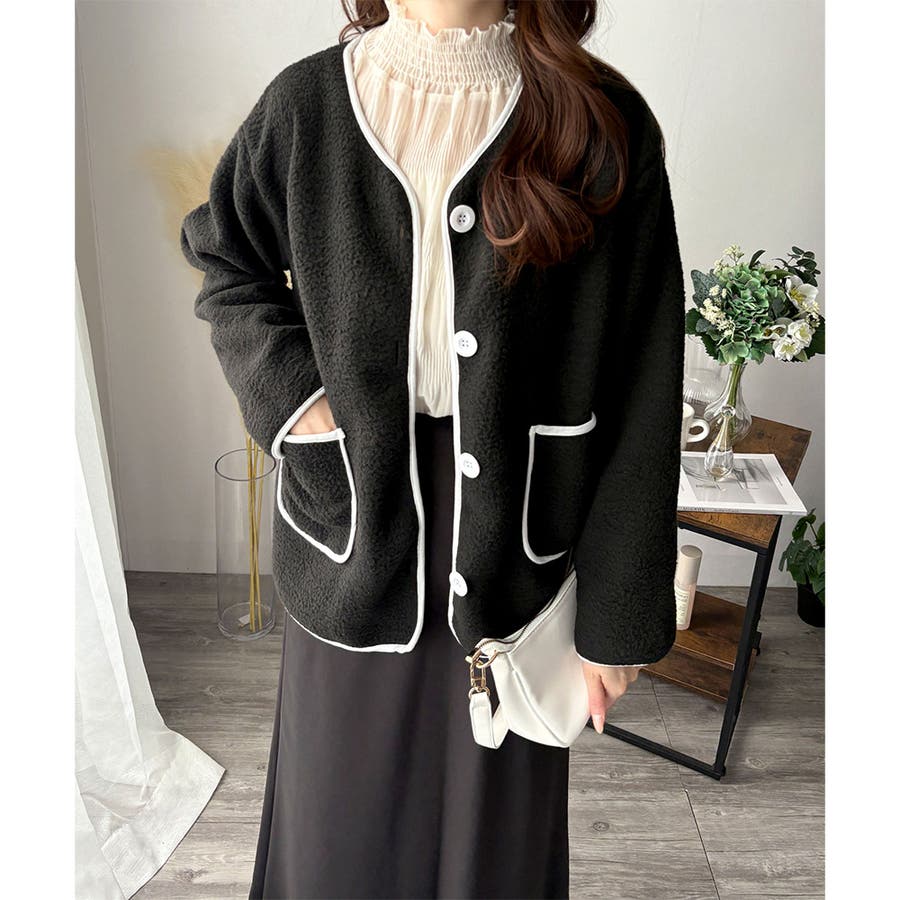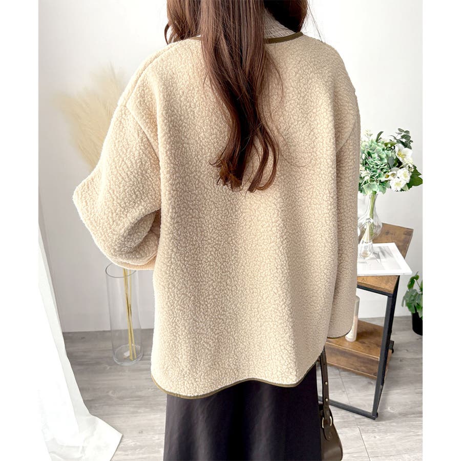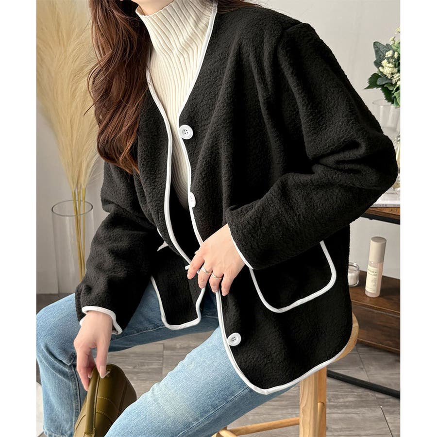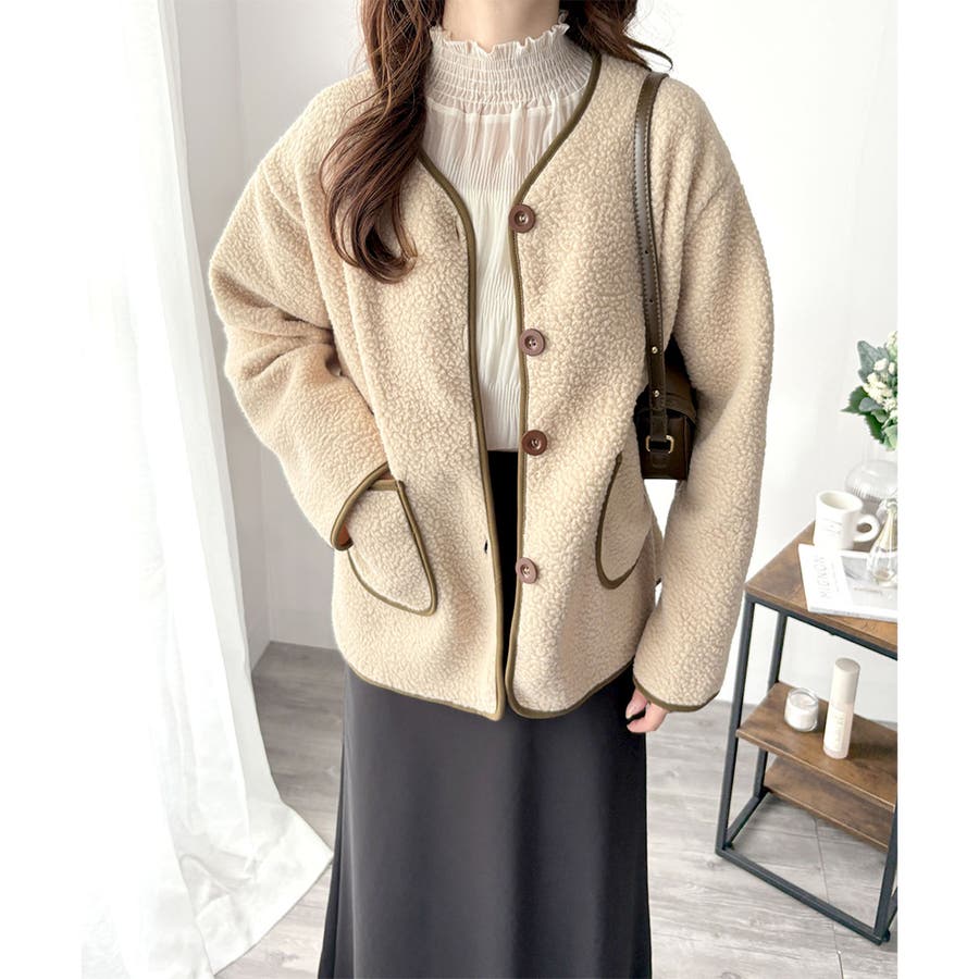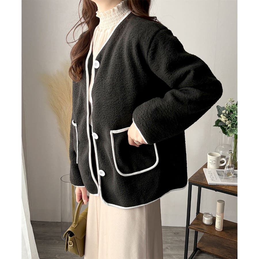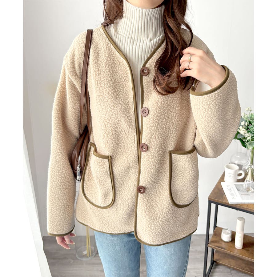 ナチュラルなボア素材に、さりげない配色ラインがアクセントになったアウター◎