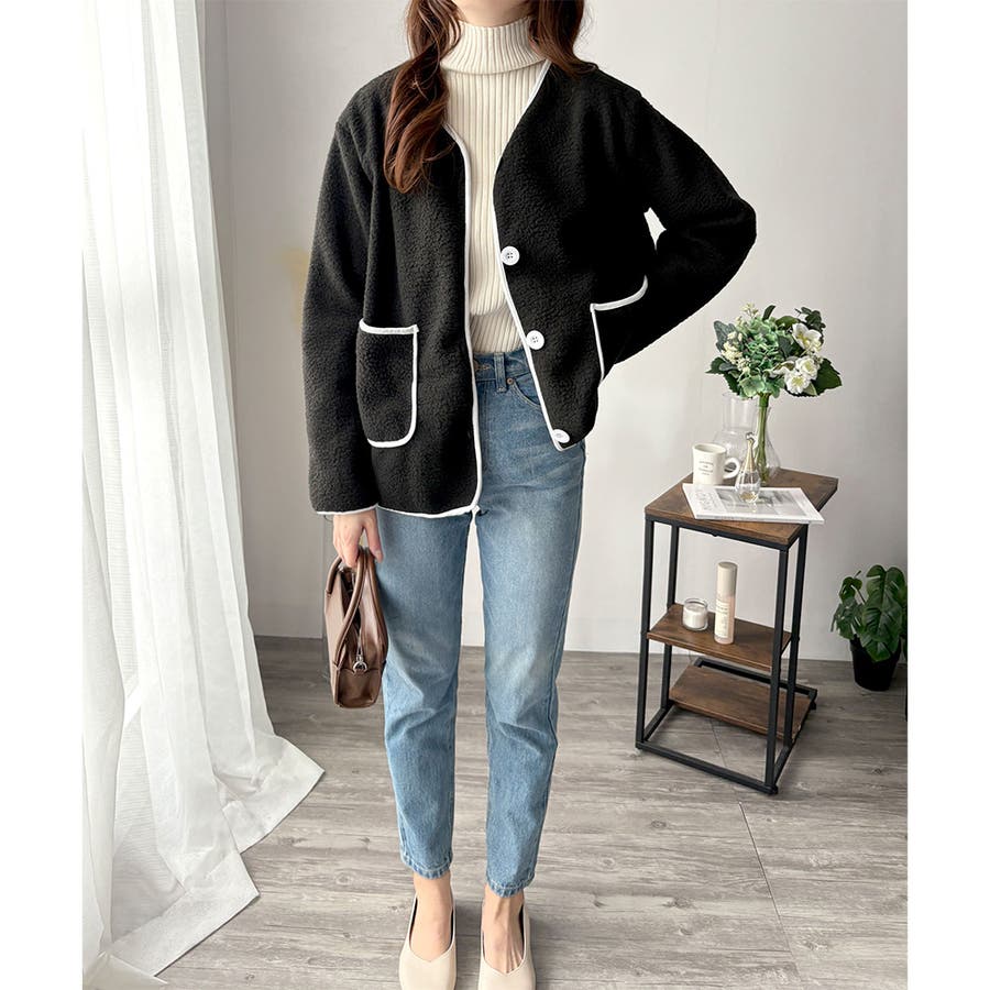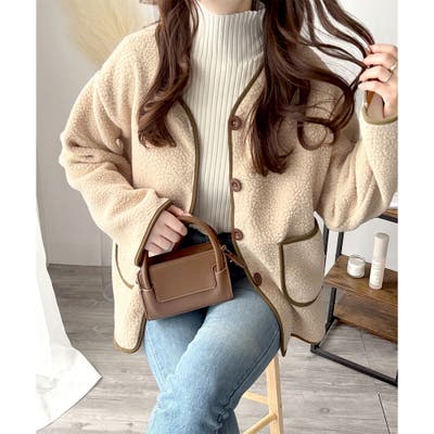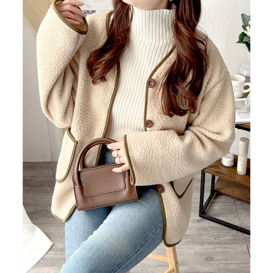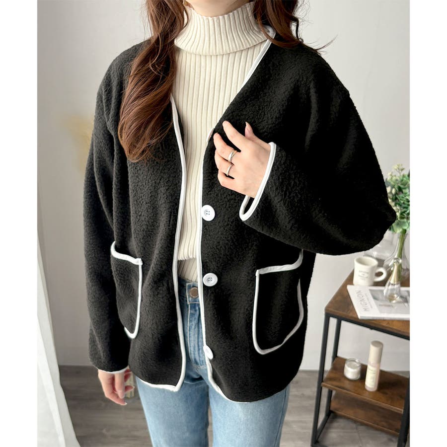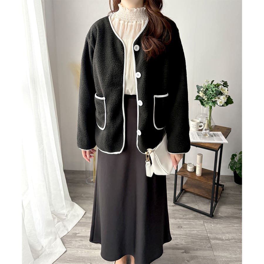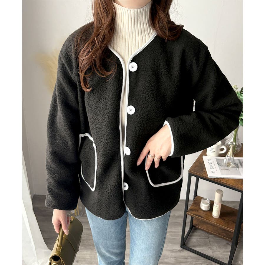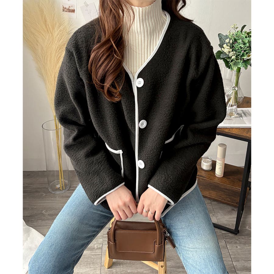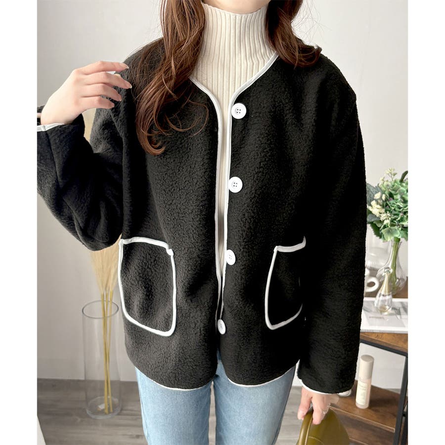 ナチュラルなボア素材に、さりげない配色ラインがアクセントになったアウター◎