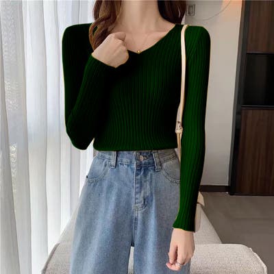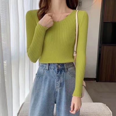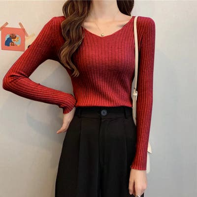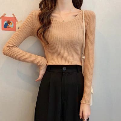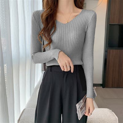 Vネック 長袖ニット 秋冬 リブニット 韓国 韓国ファッション