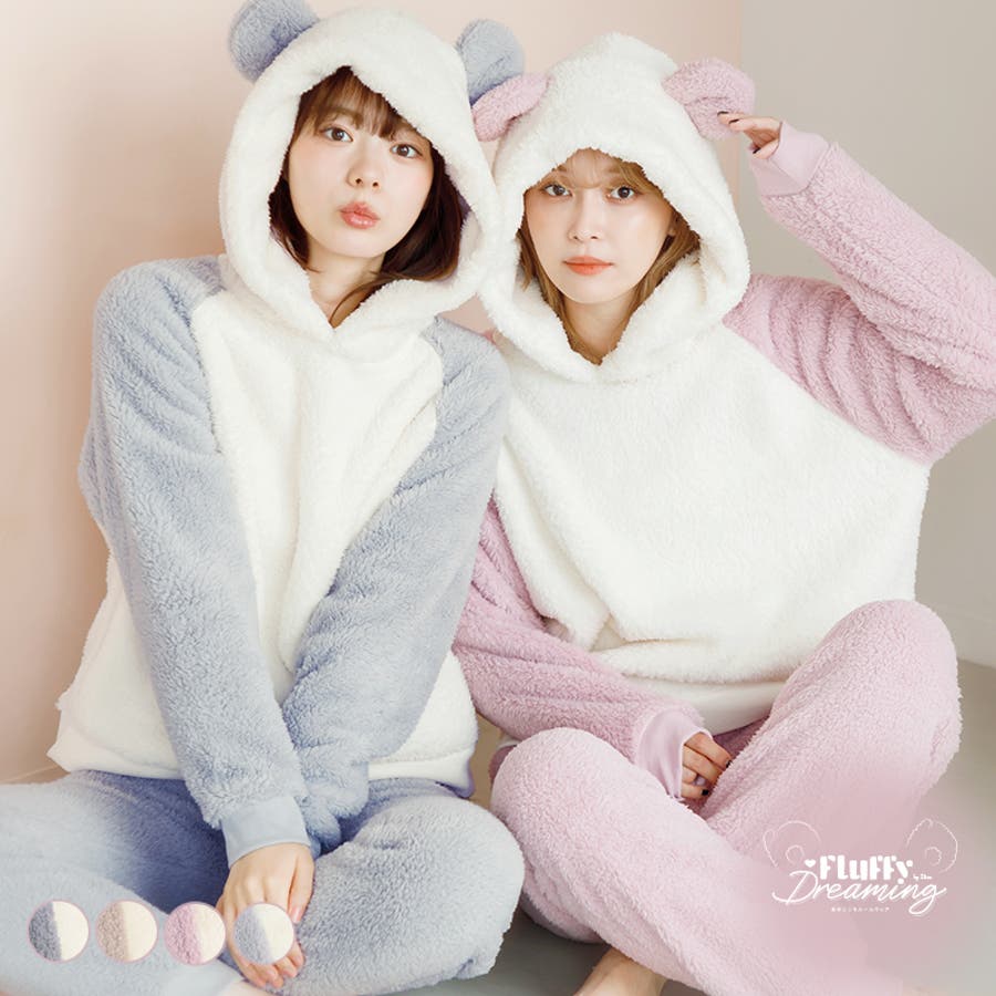 お部屋の中だからこそ楽しめる、とことんかわいいリラックスウェア♪Fluffyシリーズが登場!やわらかいプードルシャギー素材で、抱きしめたくなるフワフワな生地感。流行りのくすみカラーで大変キュートなパンダ柄デザイン♪トップスとポケット付きロングパンツの上下セット!くま耳が付いたフードは、おうち時間もテンションを上げてくれるポイント!プレゼントとしてもオススメです♪