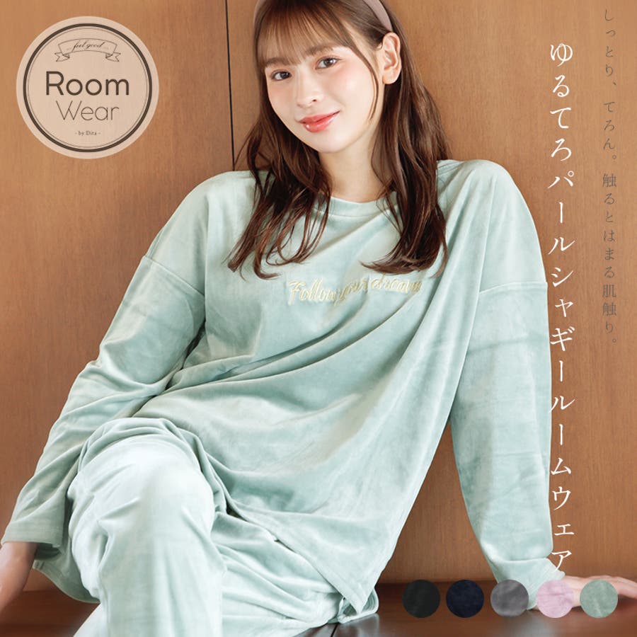 お泊りやルームパーティでも、愛され度高めのルームウェアが登場♪ やわらかく、なめらかでもちっとした肌触りのパールシャギー素材はベロアのような高級感のある生地感。 マットなツヤ感が大人っぽさとフェミニンさを演出してくれます♪ 伸縮性がある生地とボトムはウエストゴム仕様でリラックスできる着心地です。胸部分の刺繍がポイントになっていて、シンプルながらお洒落さも◎ウエストゴムで着脱簡単なロングパンツは、足元まであたためてくれます。プレゼントとしてもオススメです♪