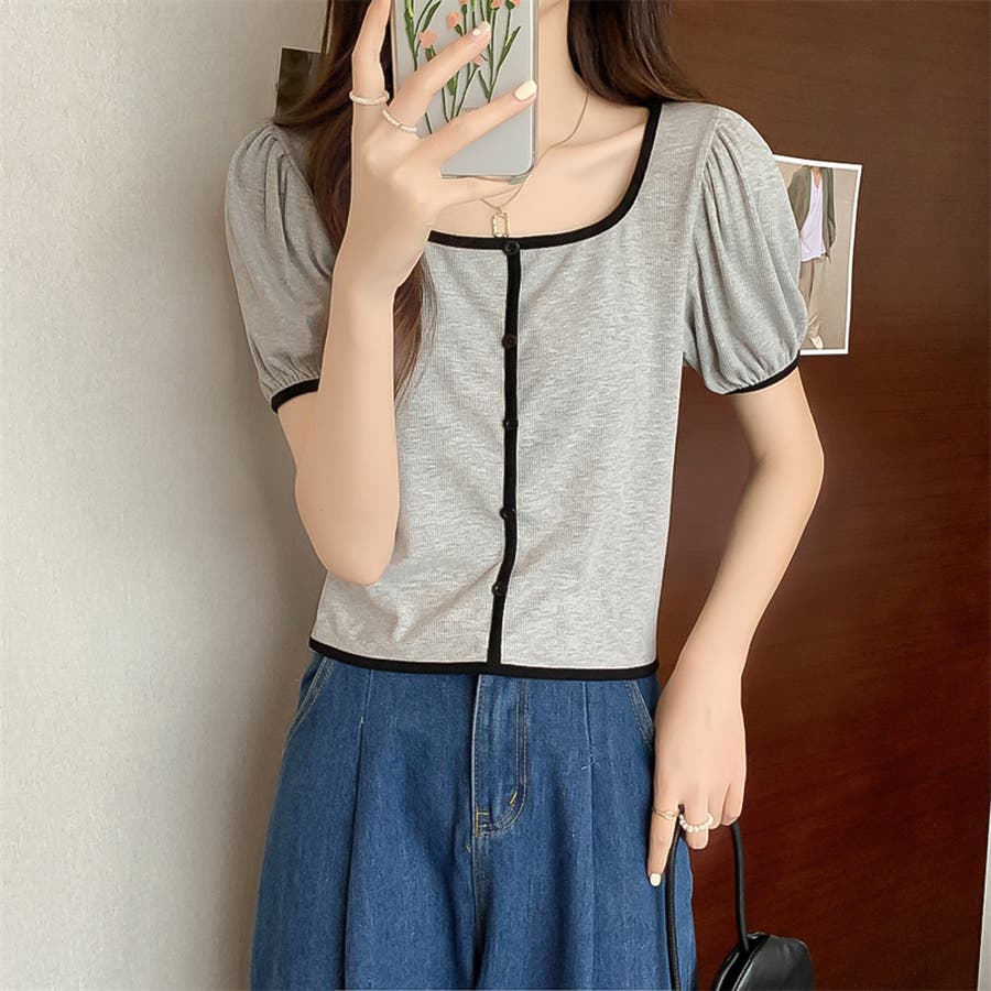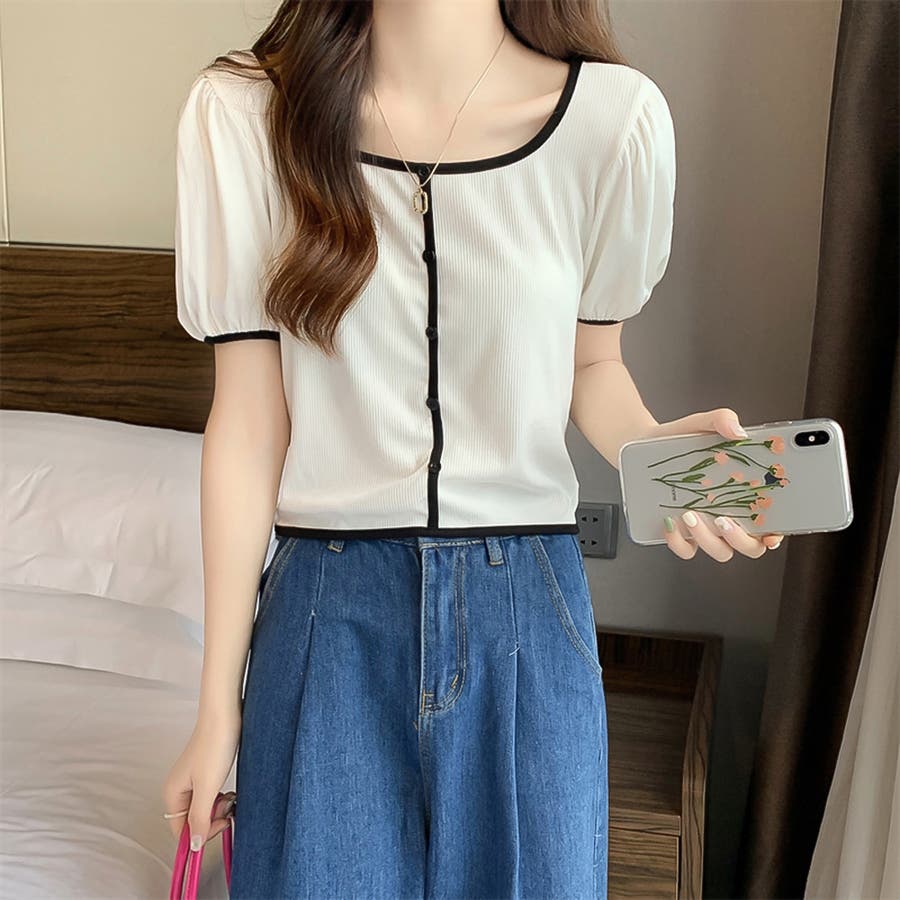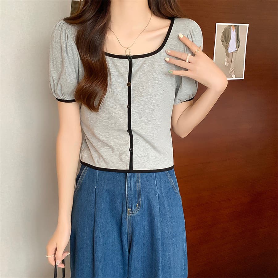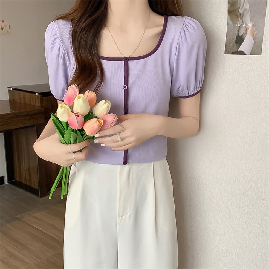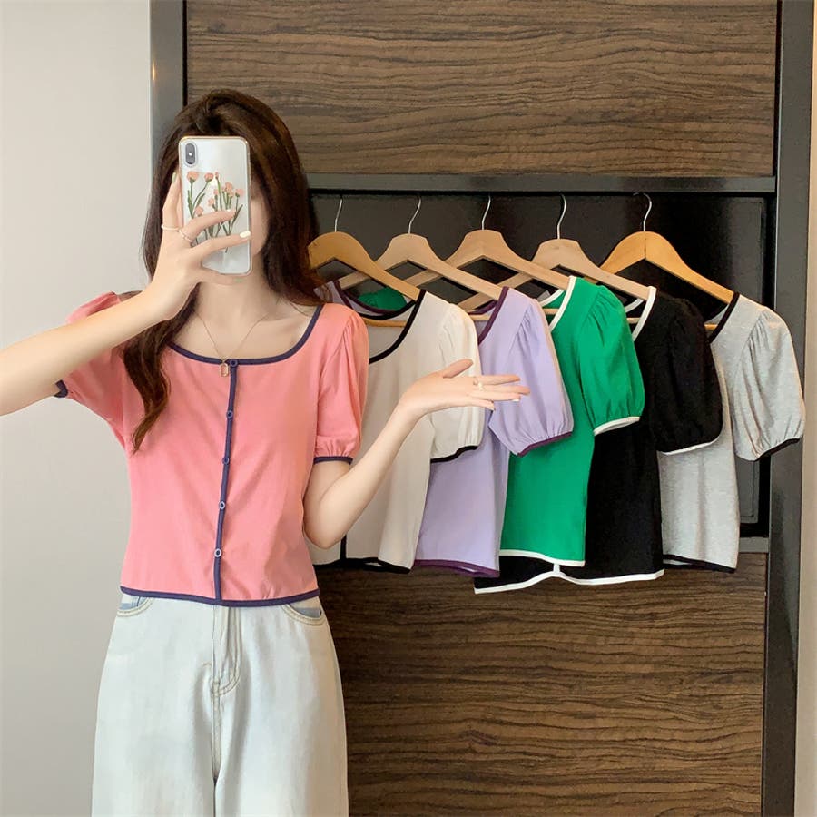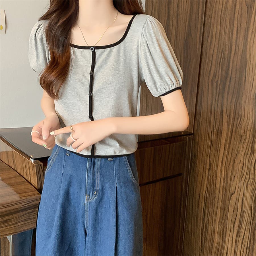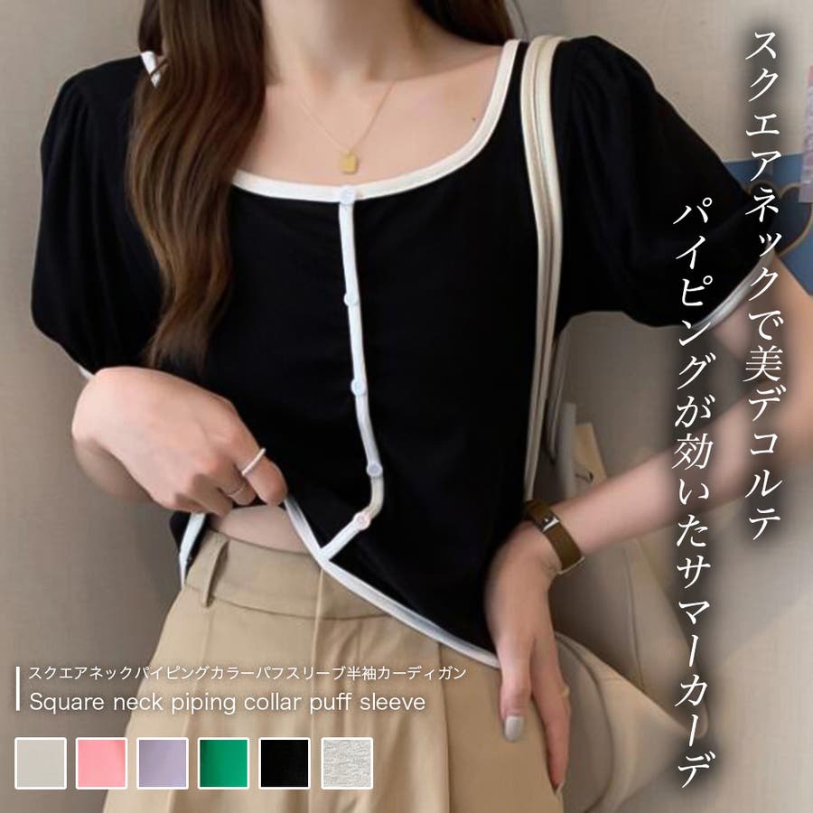 スクエアネックパイピングカラーパフスリーブ半袖カーディガン【韓国ファッション】