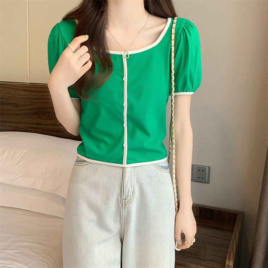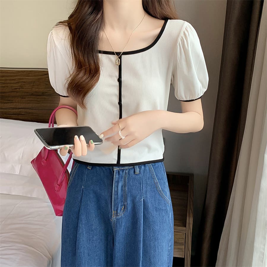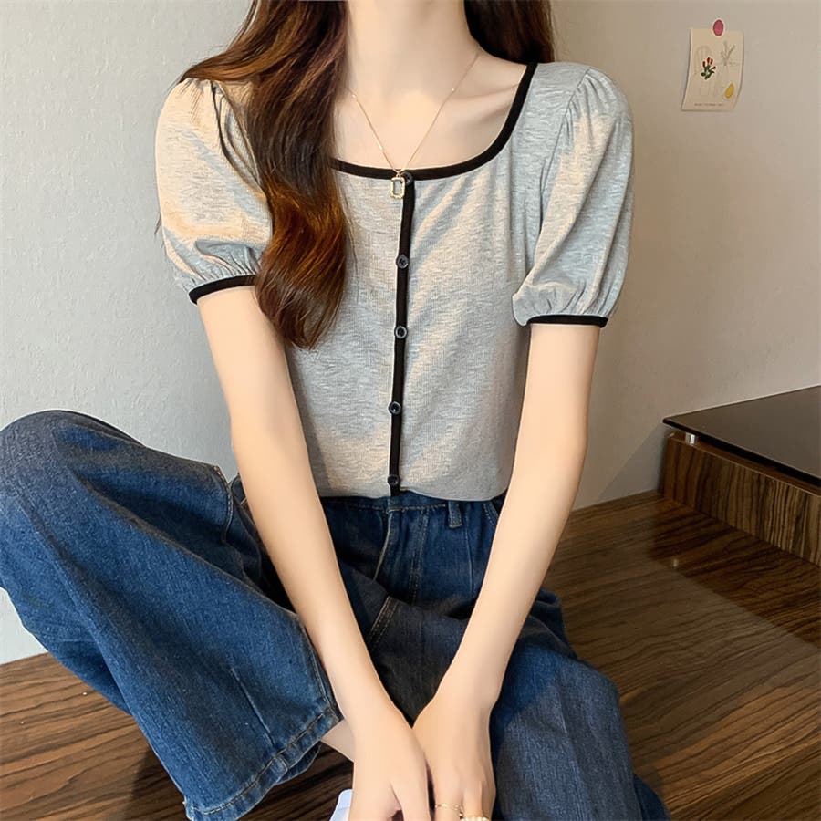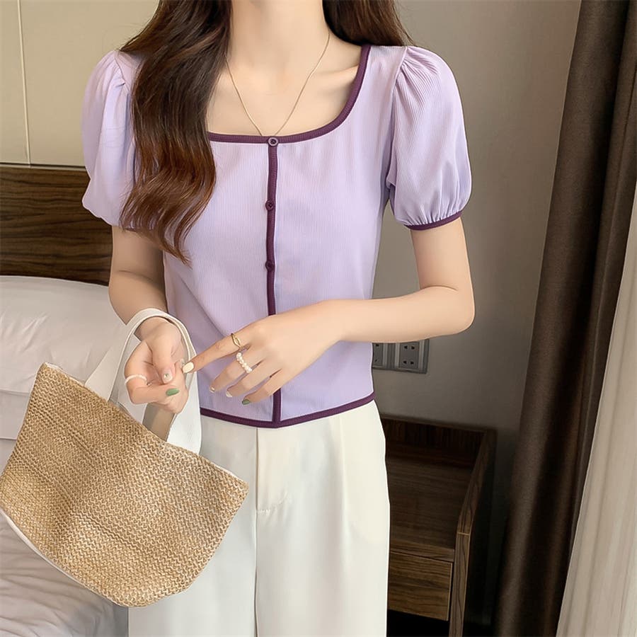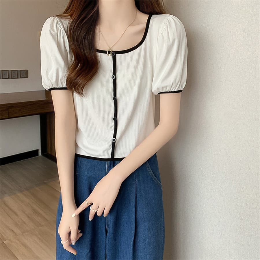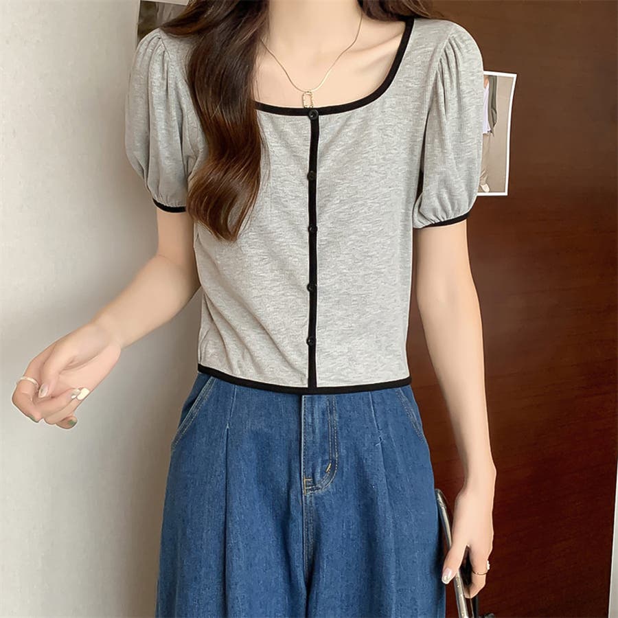 スクエアネックパイピングカラーパフスリーブ半袖カーディガン【韓国ファッション】