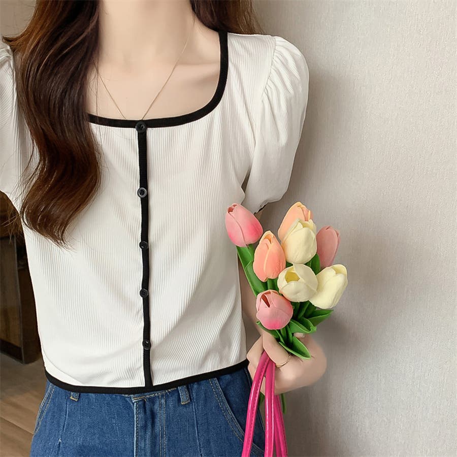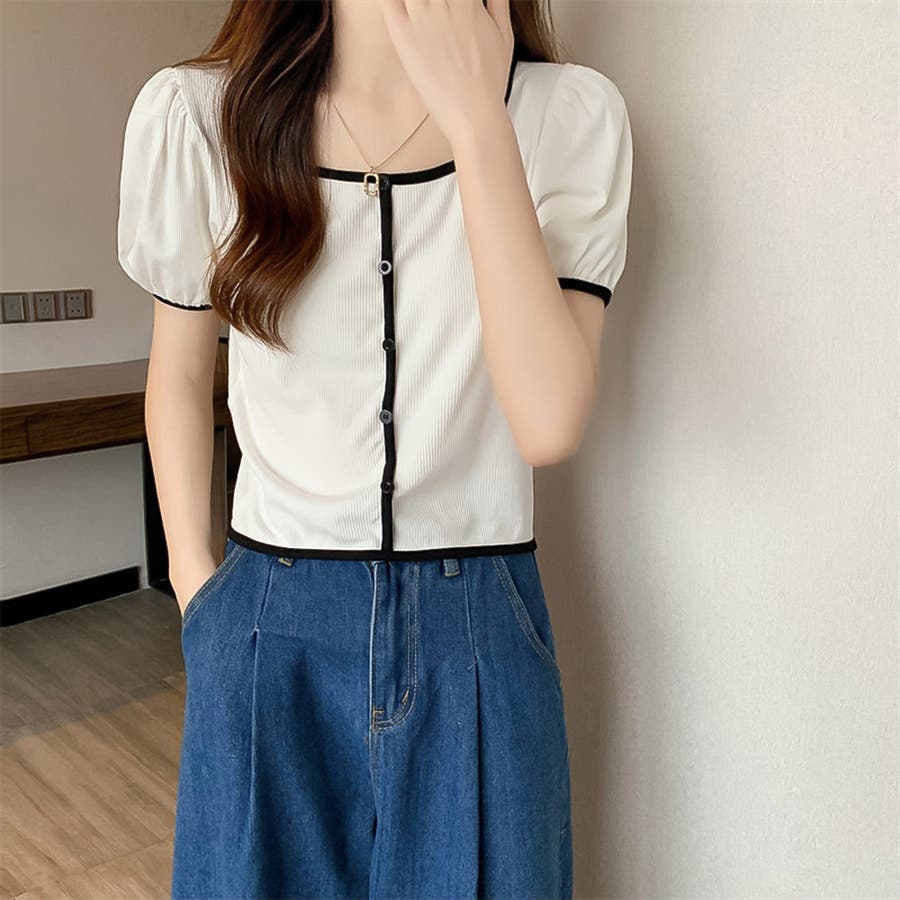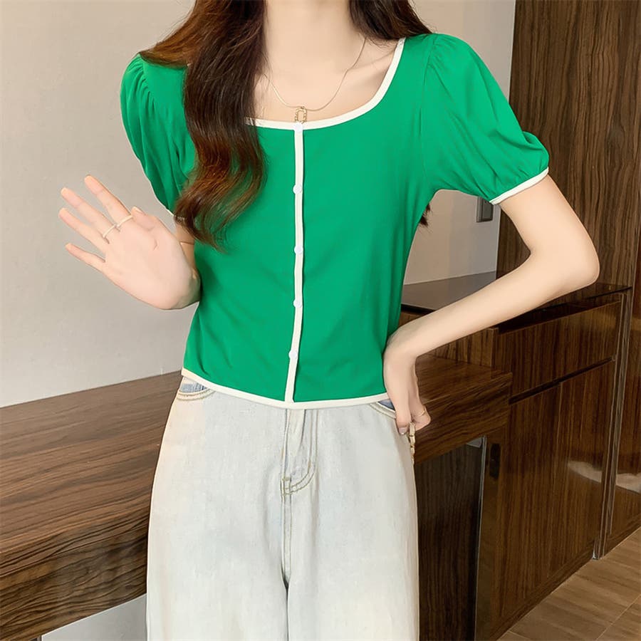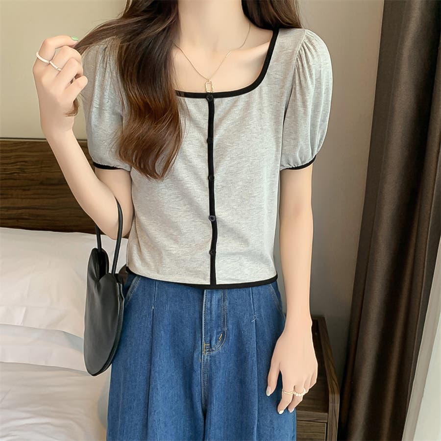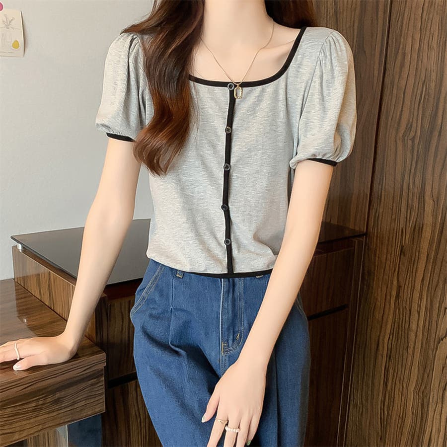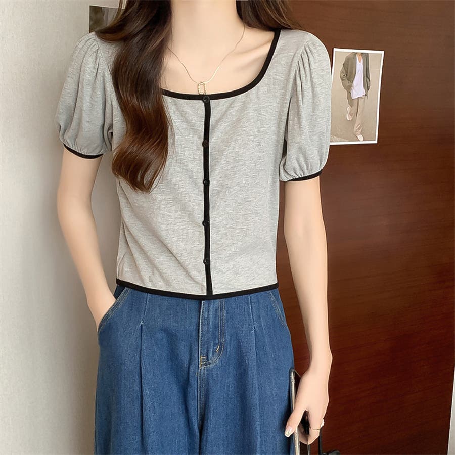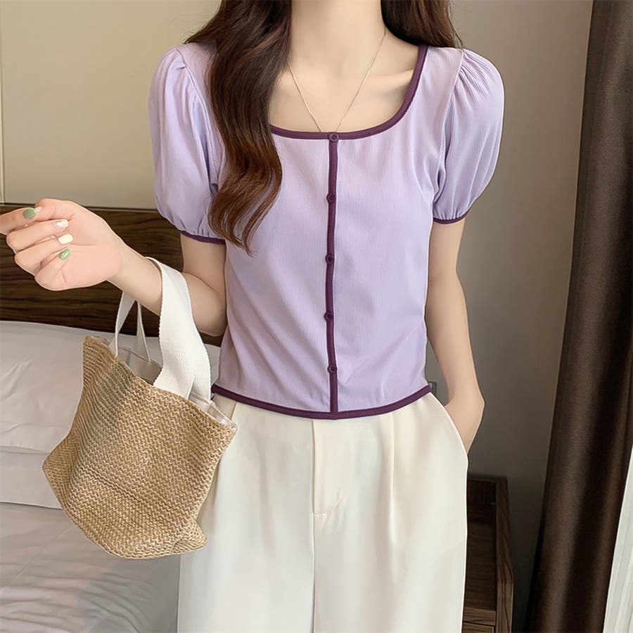 スクエアネックパイピングカラーパフスリーブ半袖カーディガン【韓国ファッション】