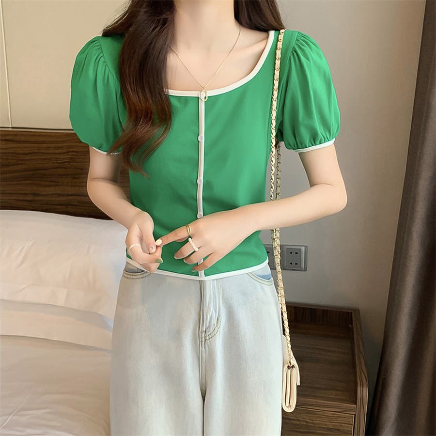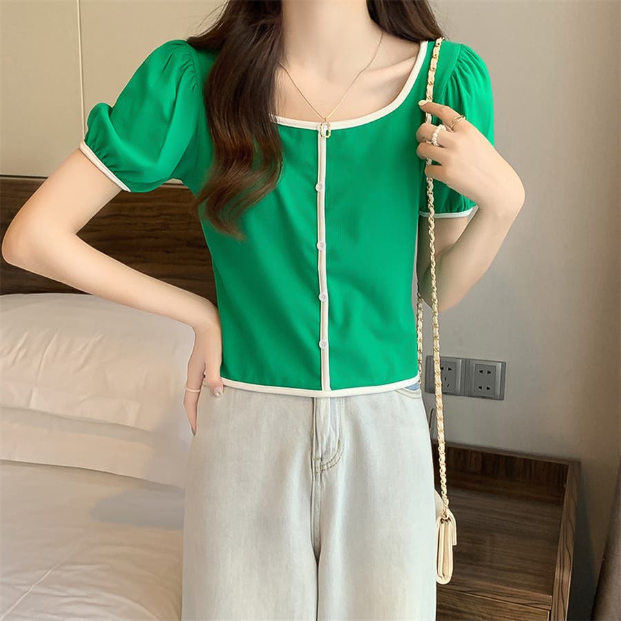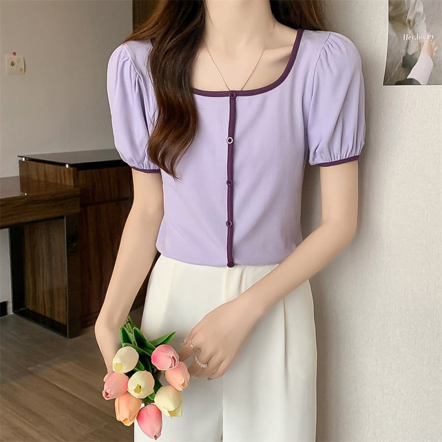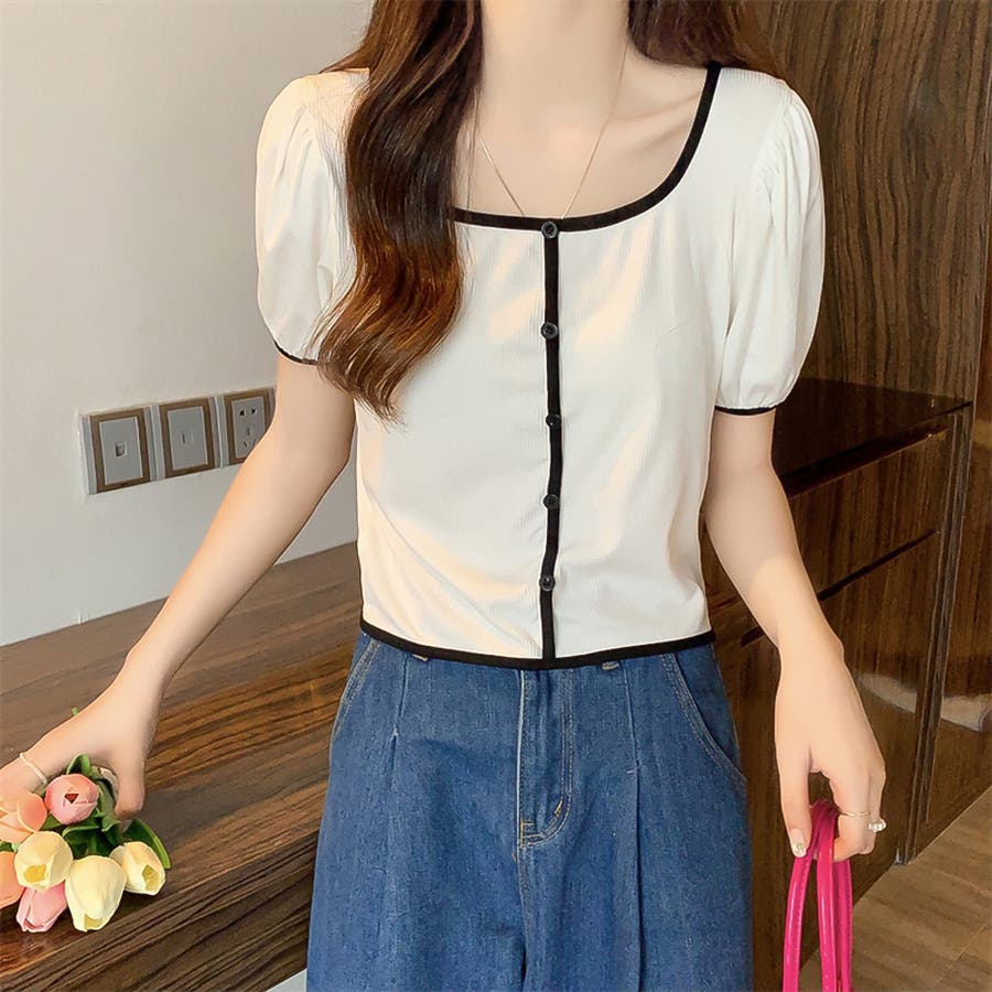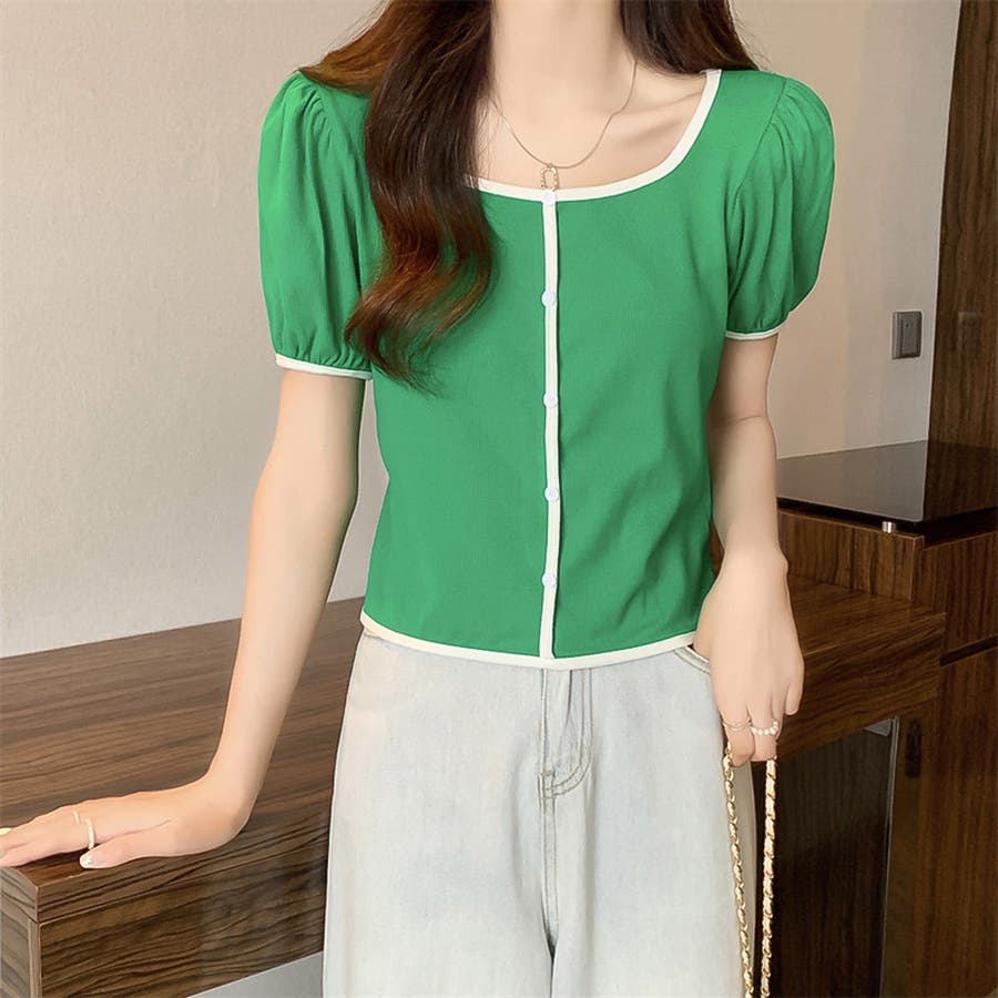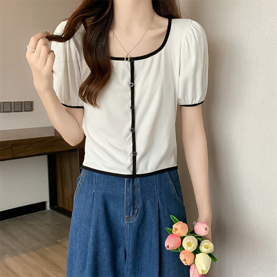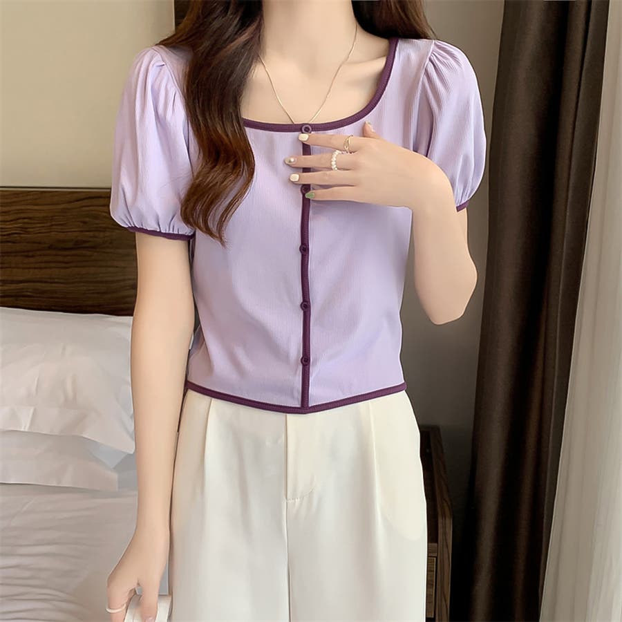 スクエアネックパイピングカラーパフスリーブ半袖カーディガン【韓国ファッション】