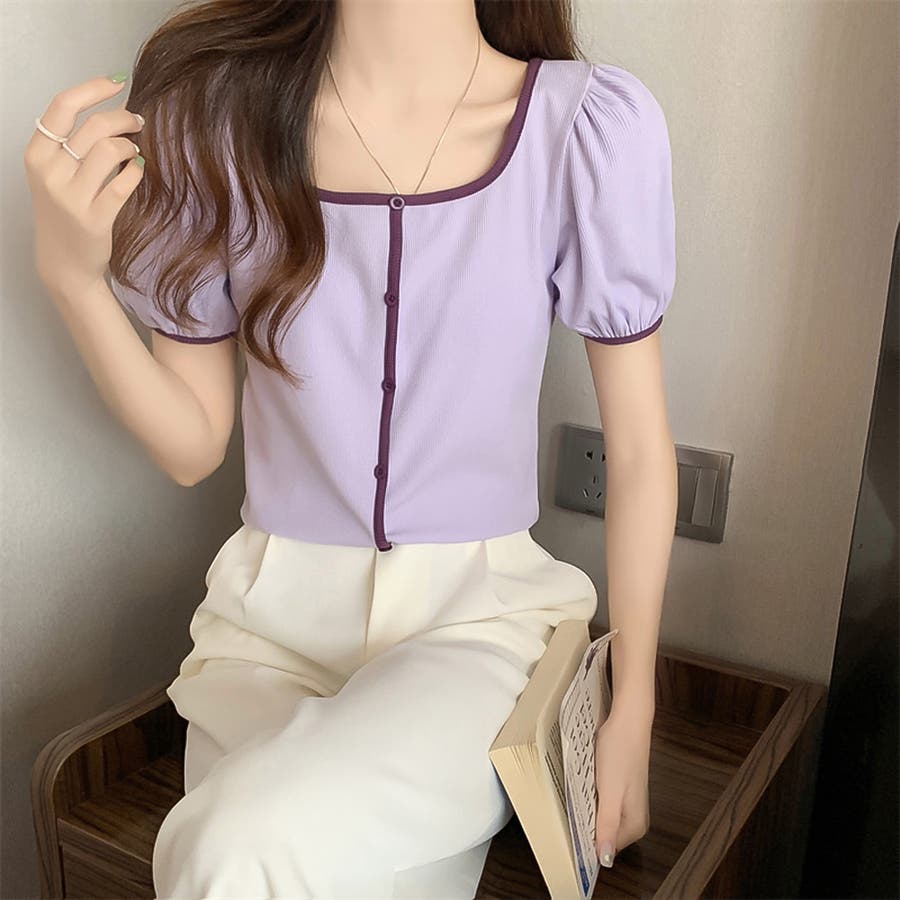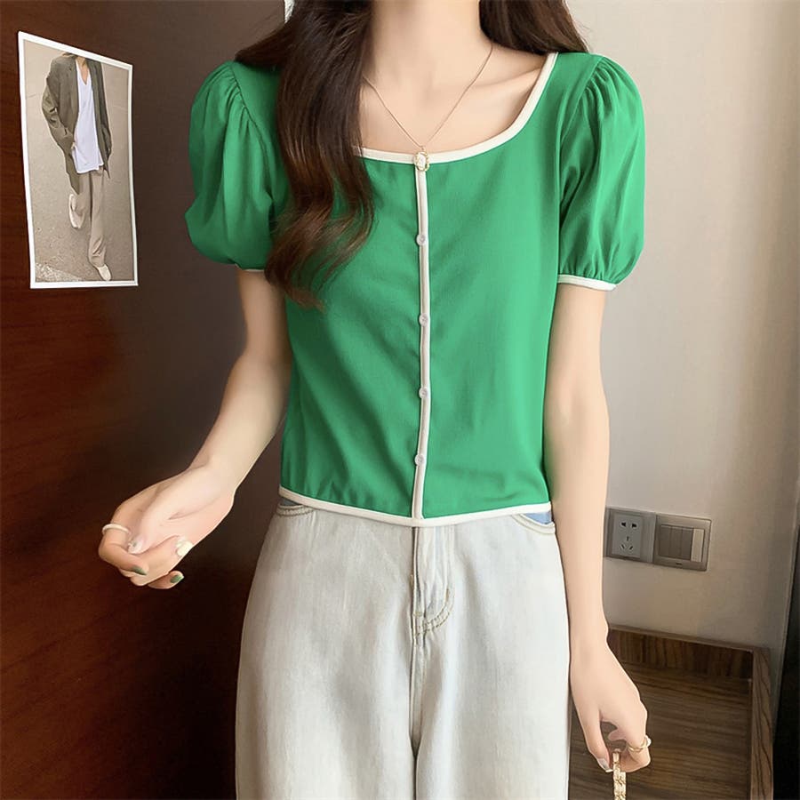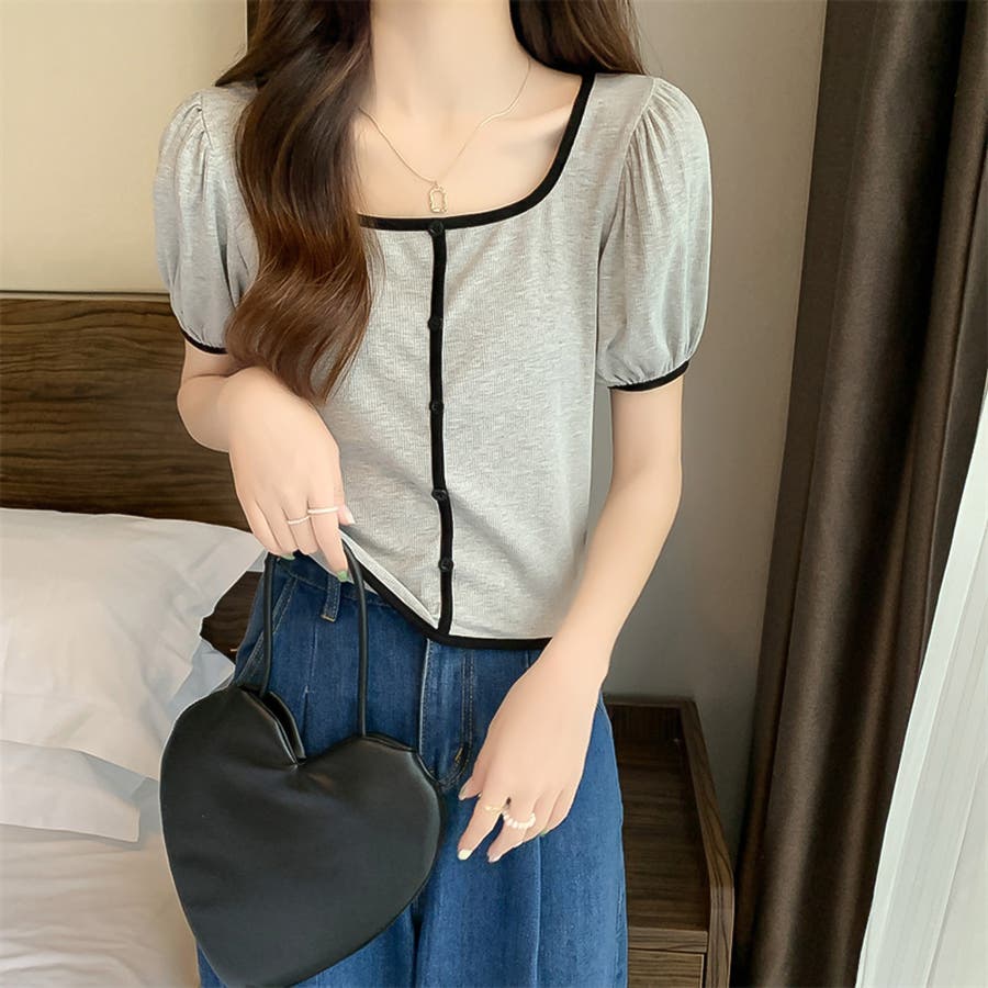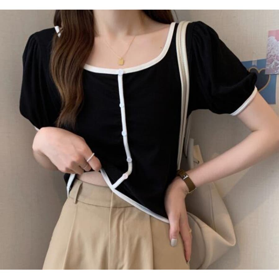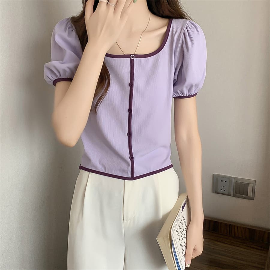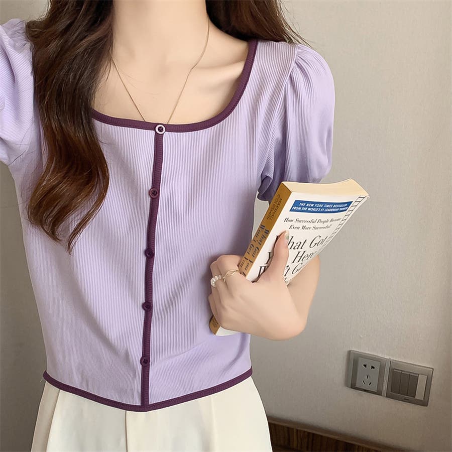 スクエアネックパイピングカラーパフスリーブ半袖カーディガン【韓国ファッション】